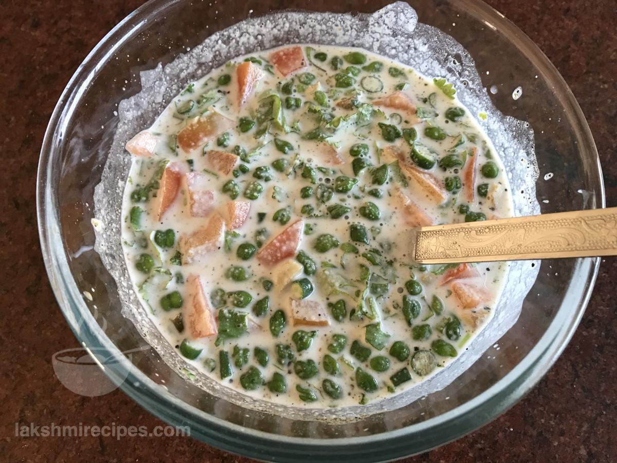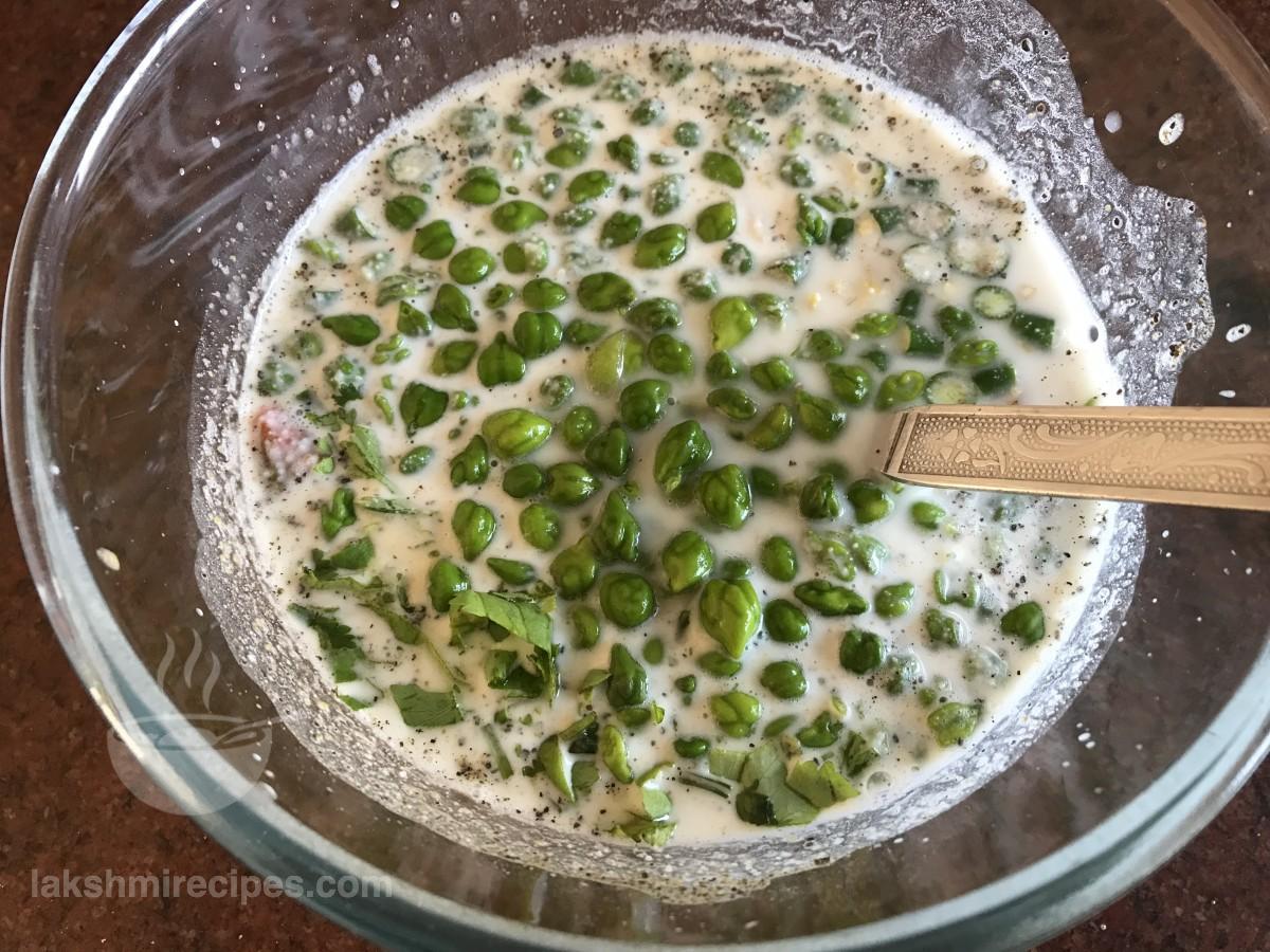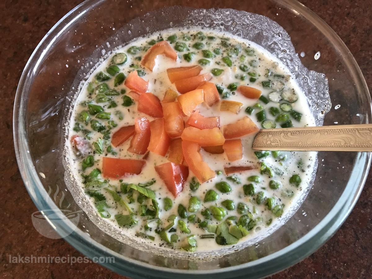- Then add green chick peas, ginger, green chilli, tomato and finely chopped coriander leaves to the batter. Mix the ingredients well again.