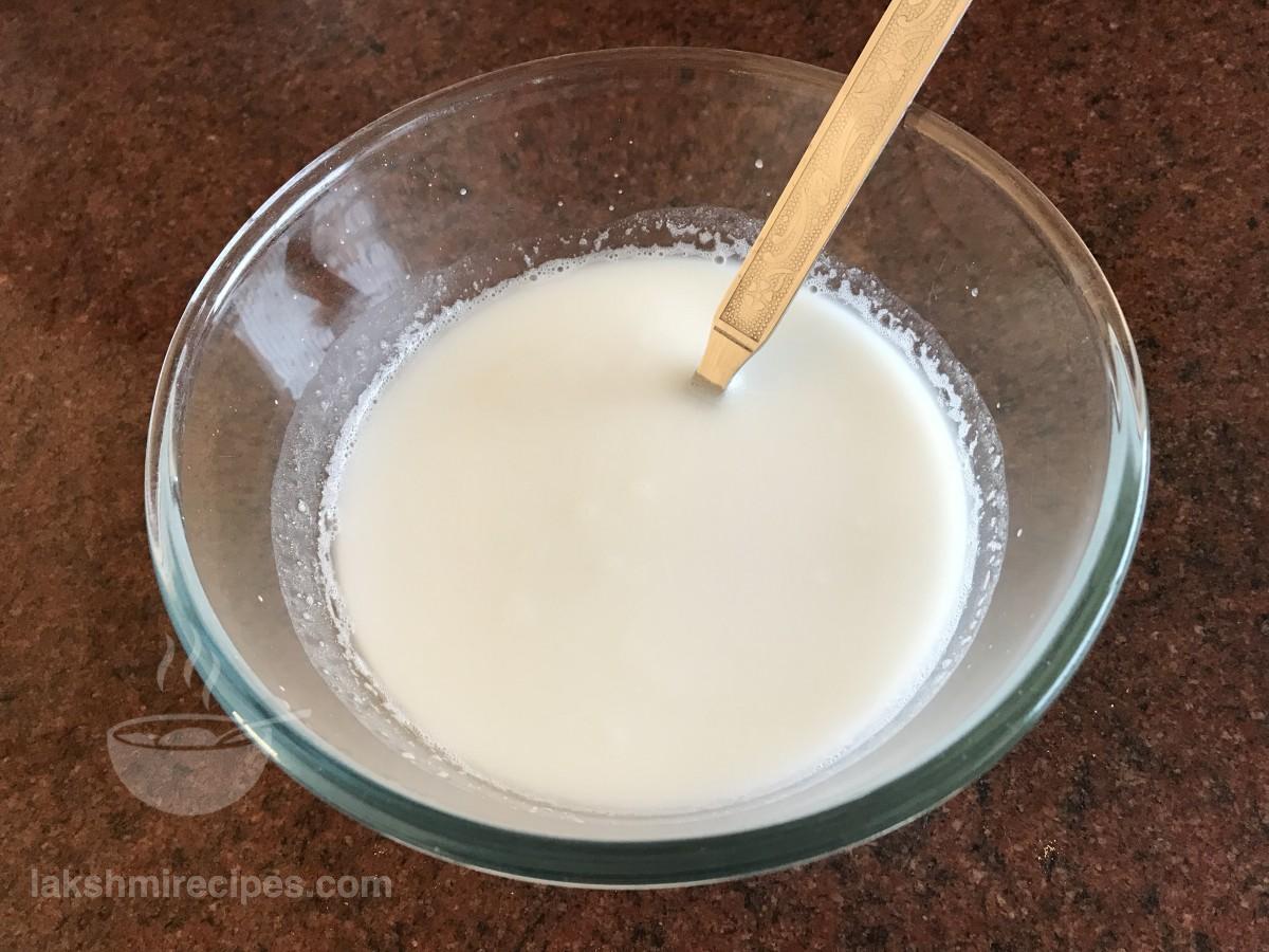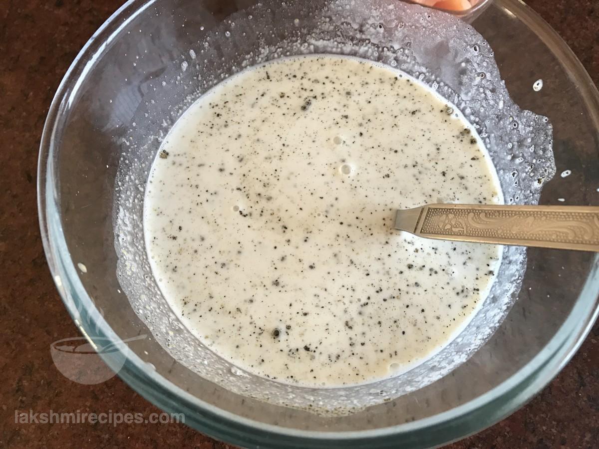 - मिक्सर जार में 2 बड़ा चम्मच पानी डालें और फिर भिगोए हुए बासमती चावल को पीसकर बारीक पेस्ट बनालें। इस पेस्ट को एक कटोरे में निकाल लें और इस चावल के पेस्ट की स्थिरता को जांच लें। यदि पेस्ट बहुत मोटी स्थिरता का हो तो उसमें पानी डालकर मिलाएं और एक मध्यम पतली स्थिरता का घोल बना लें।