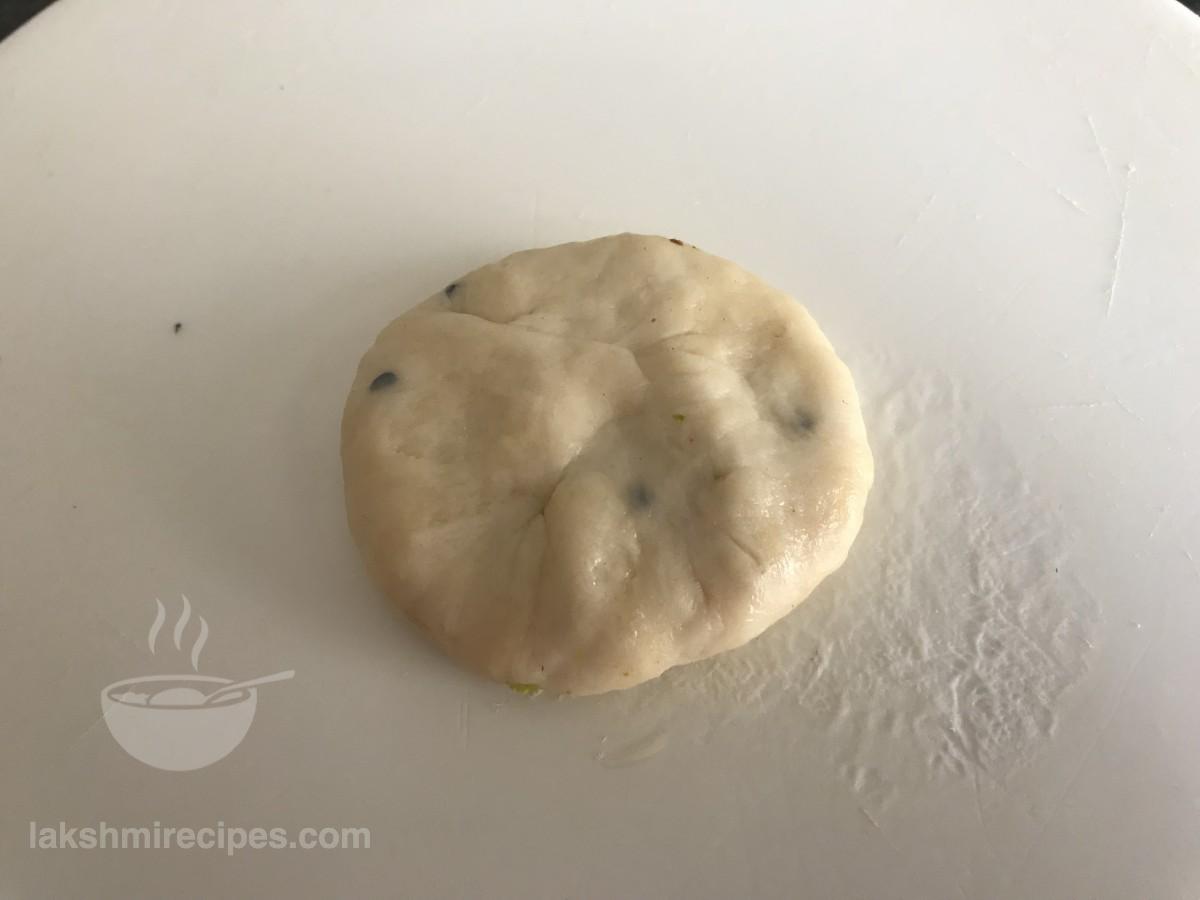- Now place some Hare Matar Ki Stuffing in this depression and then bring the sides together to form a pouch. Then roll and smoothen it like a stuffed ball.
