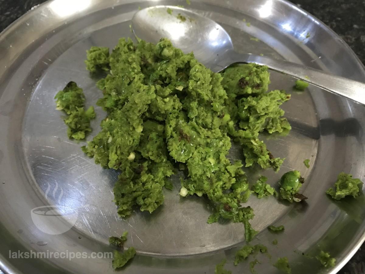 - Then transfer the cooked ingredients for making the stuffing for Hare Matar Ki Kachori to a mixer jar and grind them together slightly to prepare a stuffing with coarse texture. Do not add water while grinding the ingredients. The Hare Matar Ki Stuffing is ready for making Hare Matar Ki Kachori,