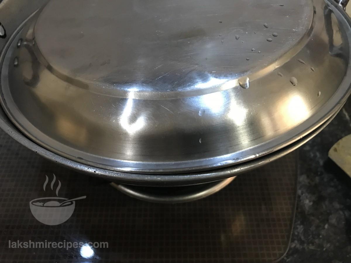 - Lower the flame to low level and cover the kadhai with a lid. Allow the ingredients to cook in this manner for 5 minutes. Remove the lid after 5 minutes and turn of the flame. Allow the ingredients to cool a little.