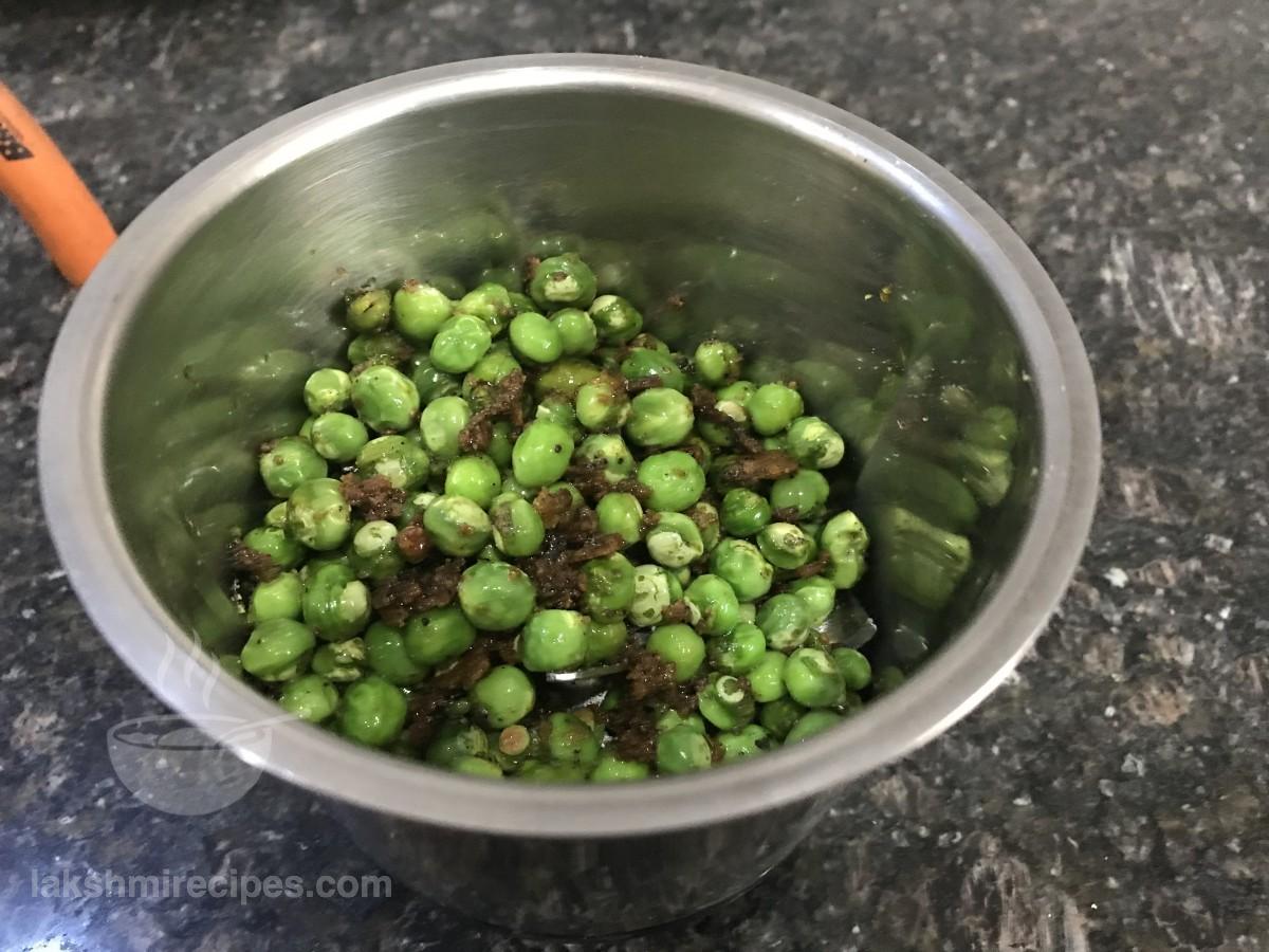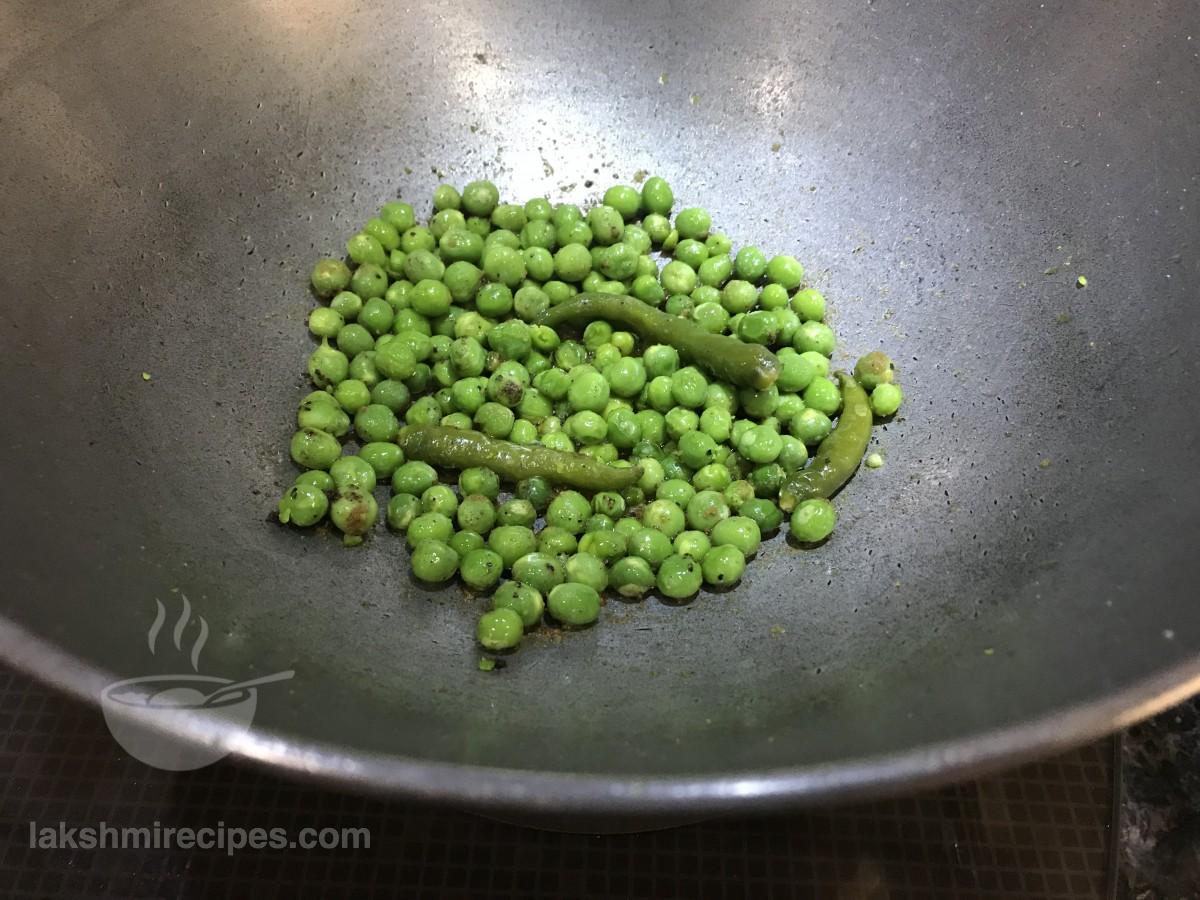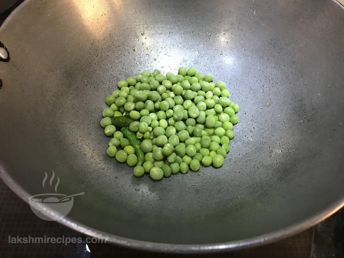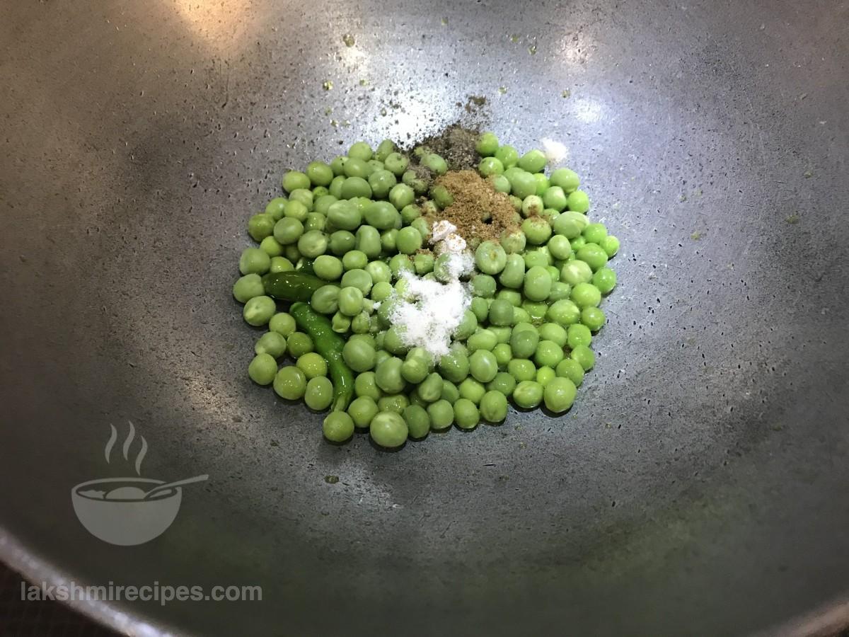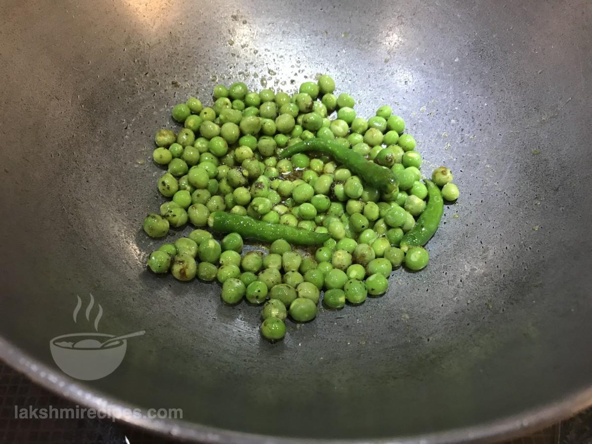 - कुछ सेकंड के बाद कढ़ाई में हरी मिर्च और हरे मटर के दाने डालें।
