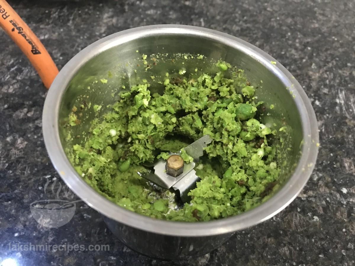 - फिर हरे मटर की कचौरी के भरावन के मिश्रण को मिक्सर जार में डालें और दरदरा पीस लें। सामग्री को पीसते समय पानी नही डालें। हरे मटर की कचौरी बनाने के लिए भरावन तैयार है।
