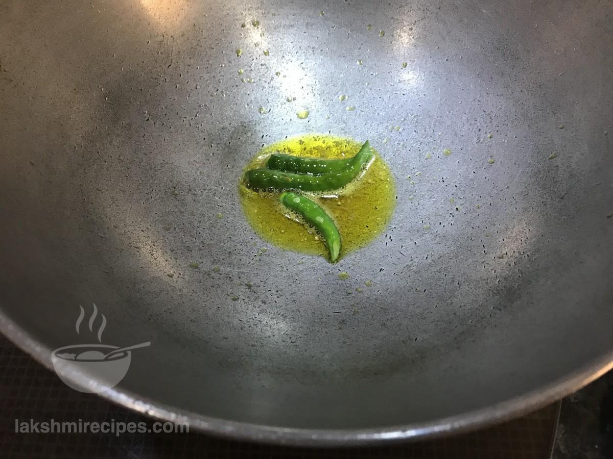 - After a few seconds add green chilli or hari mirch and green peas or hare matar to the kadhai.