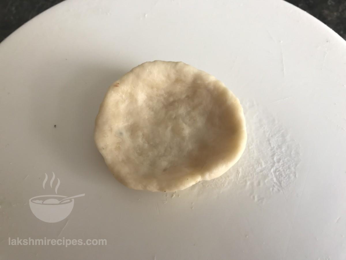 - फिर एक लोई लें और अपने अंगूठे और उंगलियों की मदद से उसे कटोरी जैसा आकार दें (जैसा कि नीचे की छवि में दिखाया गया है)।