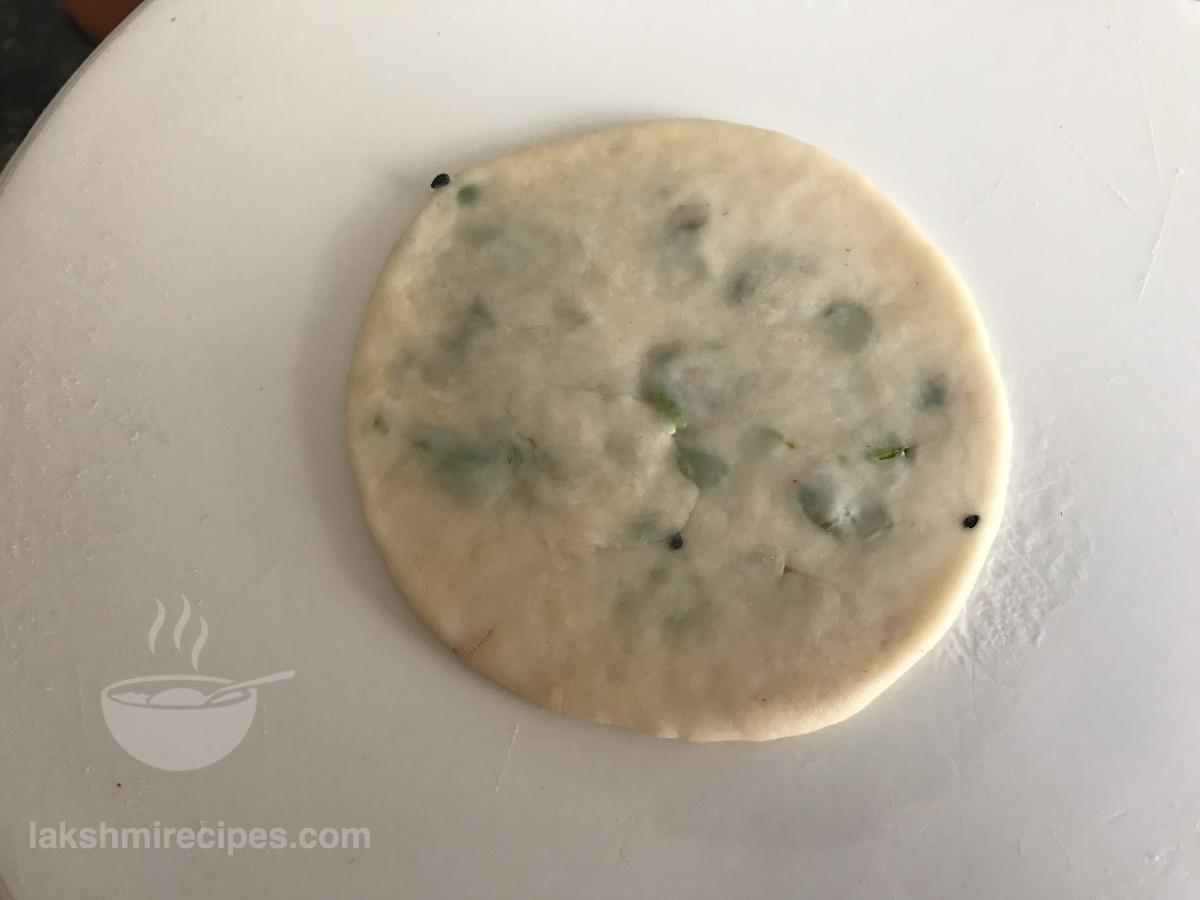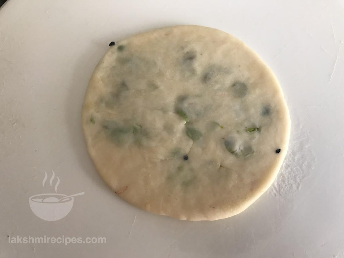 - अब इसमें थोड़ा हरे मटर भरावन डालें और फिर किनारों को चिपका कर पोटली जैसा आकार दें। फिर हल्के हाथ से रोल करके चिकना कर लें।