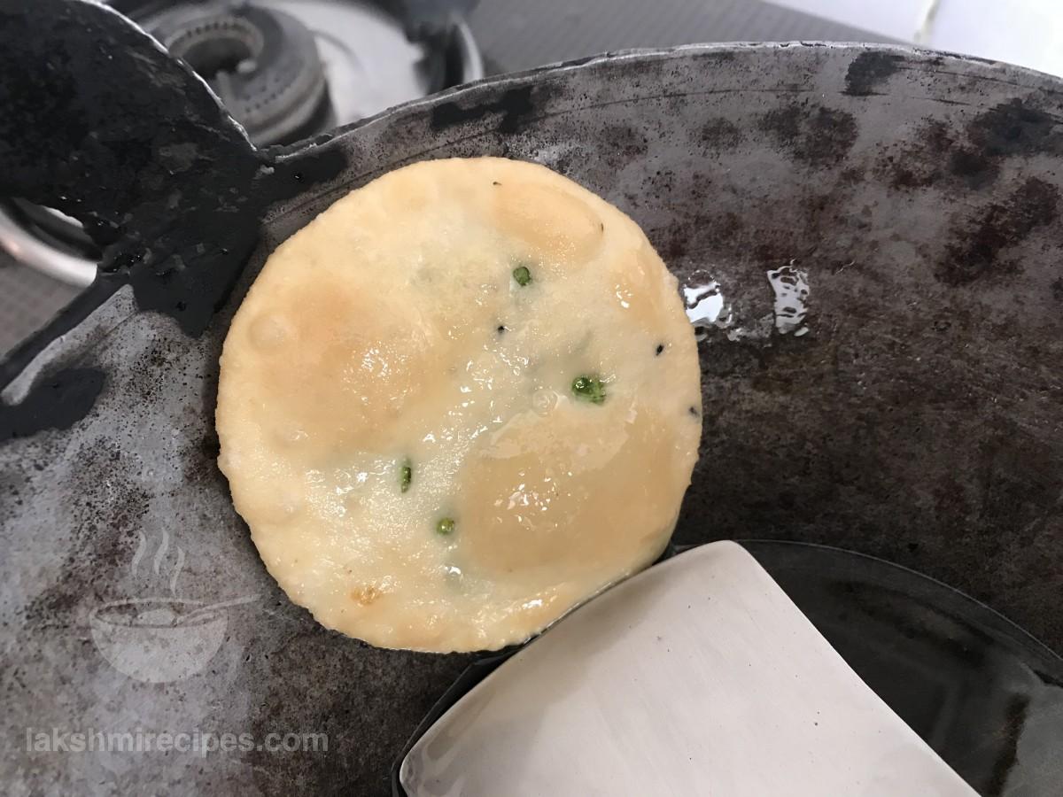 - Then transfer the kachori to it to fry until it turns golden brown on both the sides. Flip the Hare Matar Ki Kachori carefully when it turns golden brown on one side to fry in the same manner on the other side. Then transfer it to a plate and prepare the remaining Hare Matar Ki Kachoris in the same manner.
