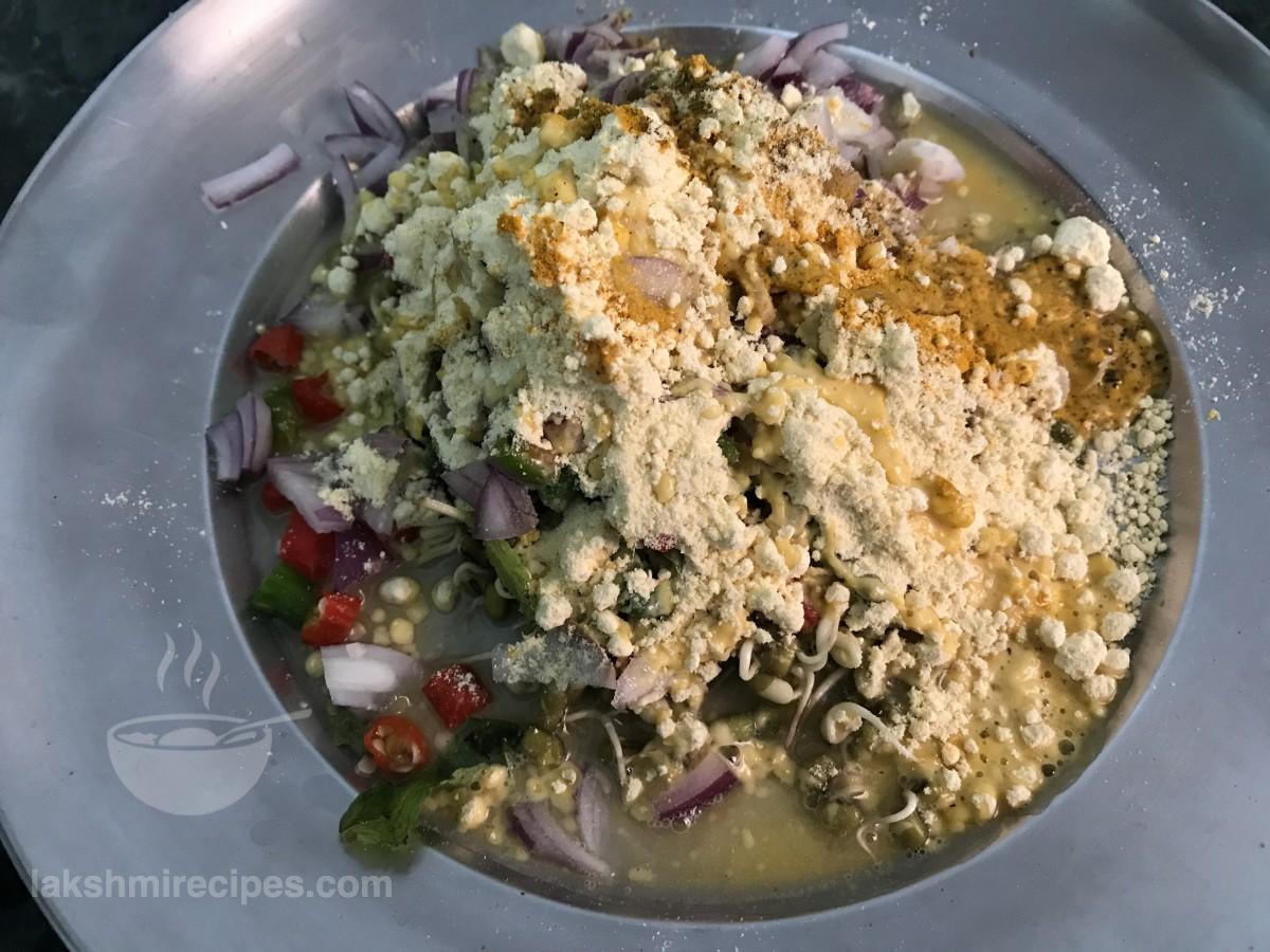 - एक मिश्रण कटोरे में अंकुरित साबुत मूंग दाल, बारीक कटा हुआ प्याज, हरी मिर्च, अदरक और धनिया डालें।