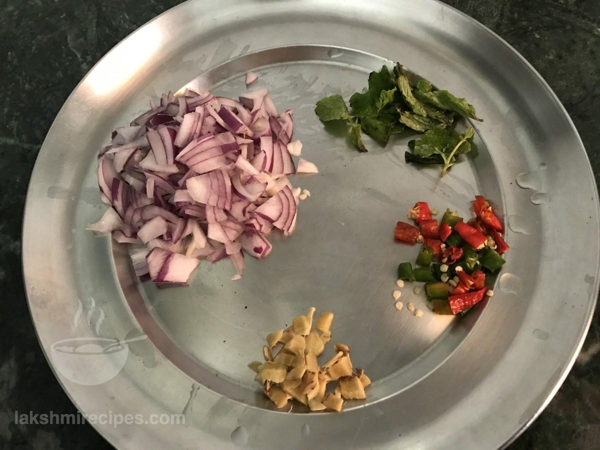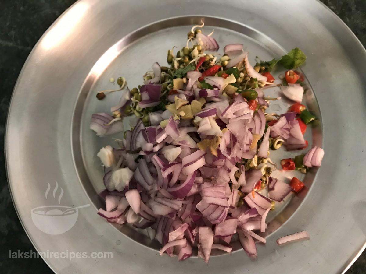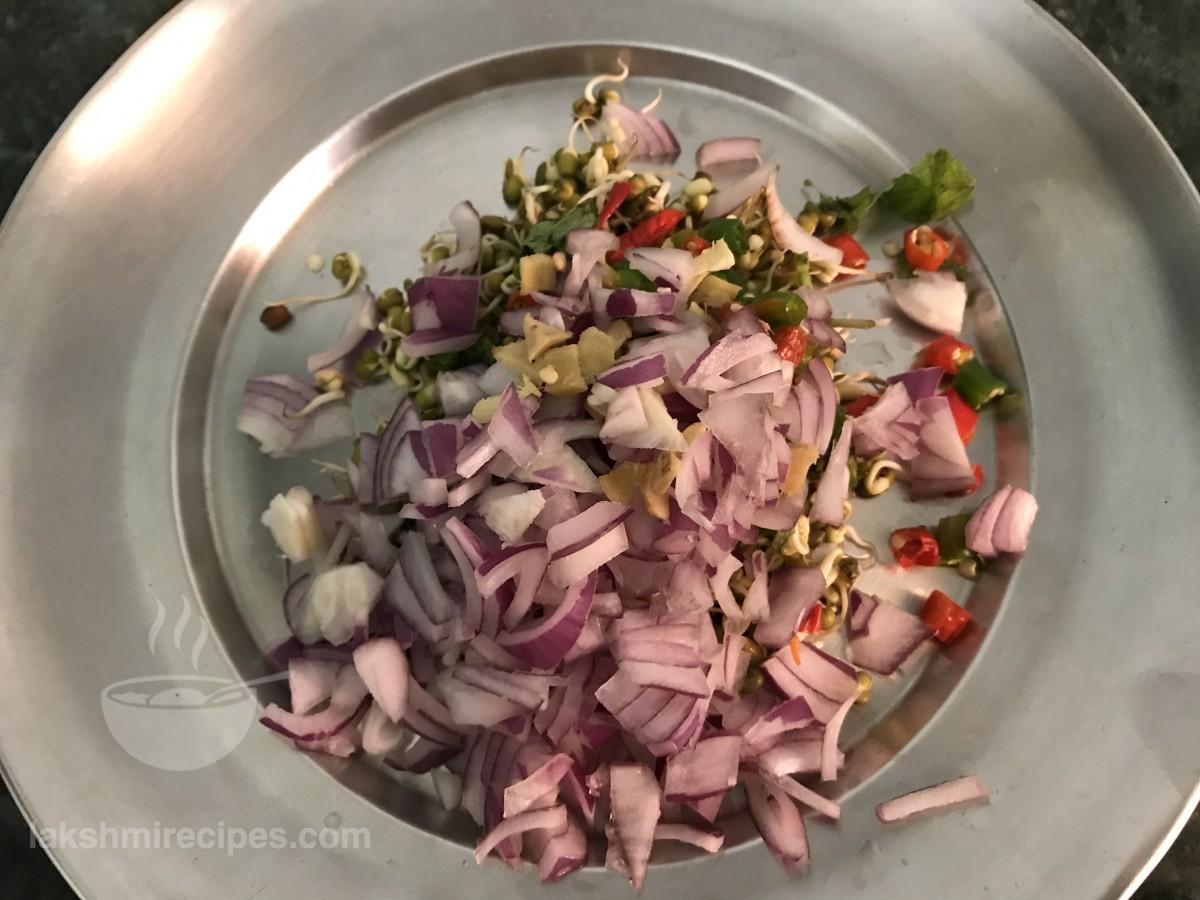 - In a mixing bowl take these sprouted green gram, finely chopped onion, green chilli, ginger and coriander leaves.