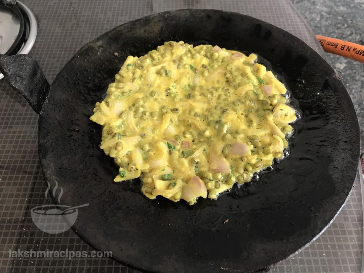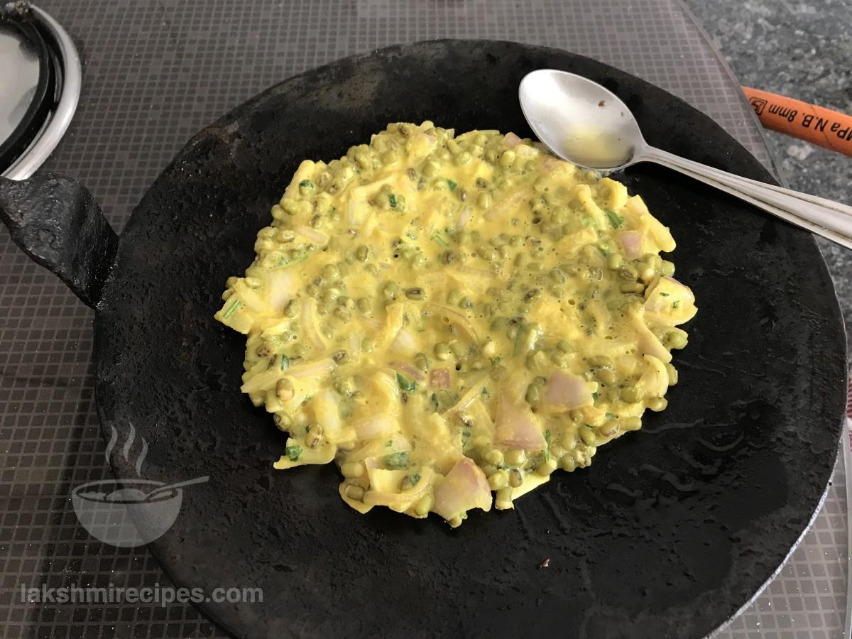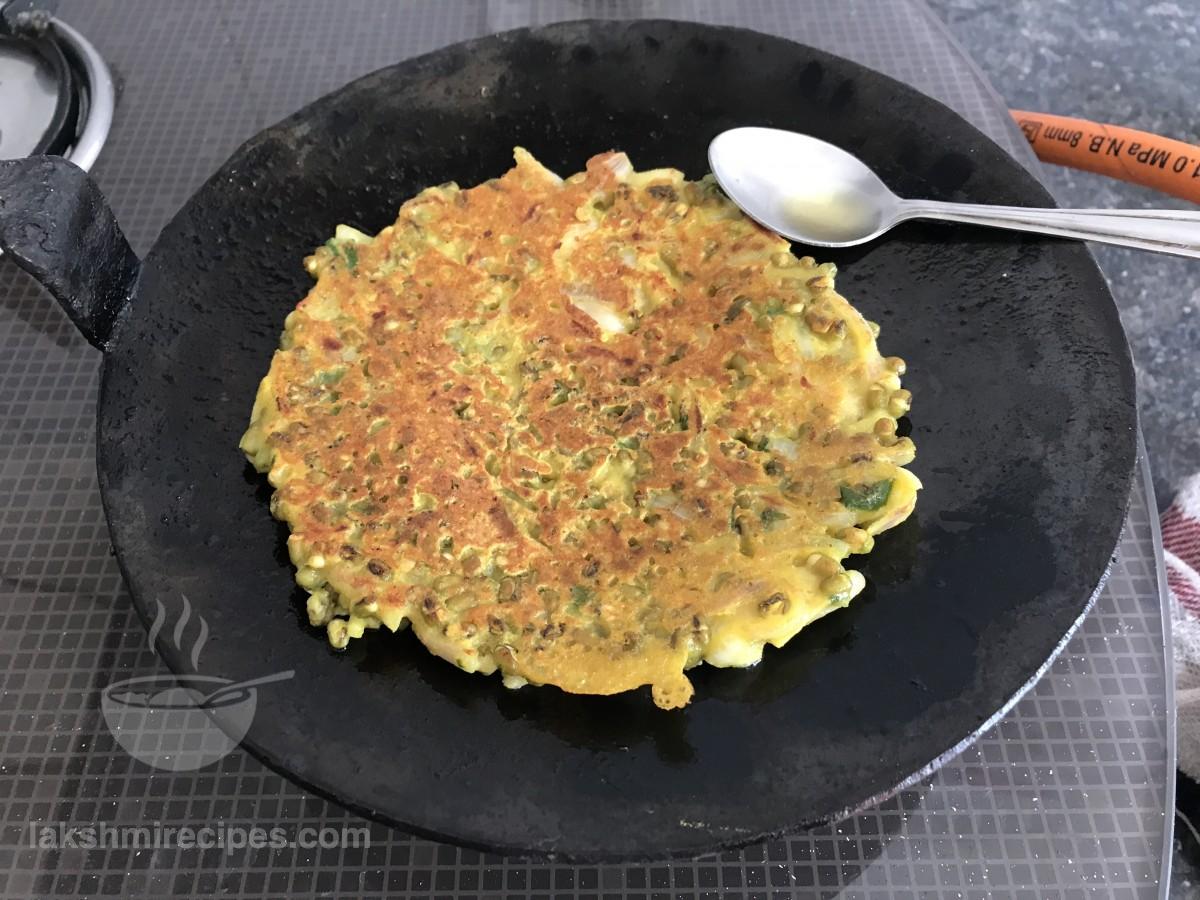 - Pour 1 tea spoon refined oil around the cooking Moong sprouts chilla after flipping it. Cook till the other side also turns crispy red.