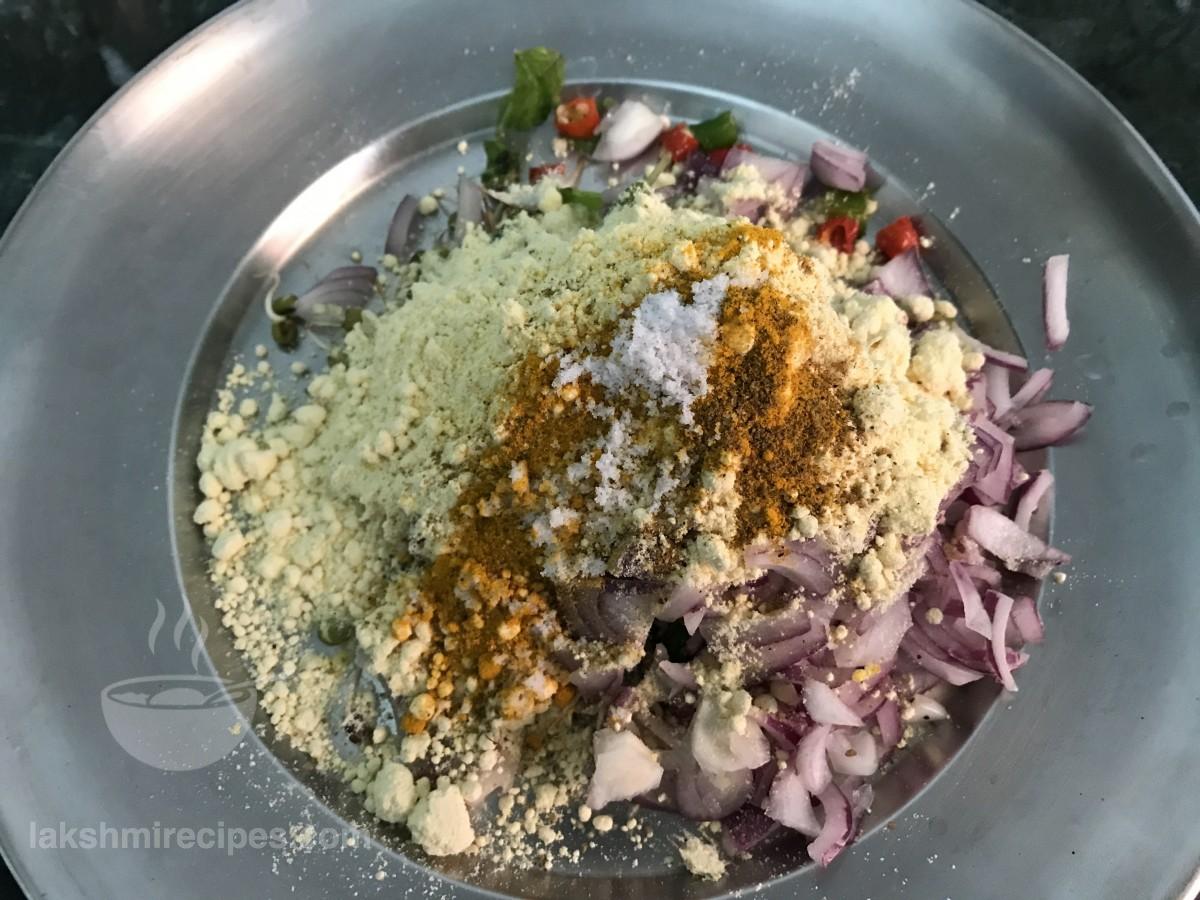 - Then add gram flour, turmeric powder, cumin powder, salt and 2 table spoon water to it. Mix and prepare a smooth batter.