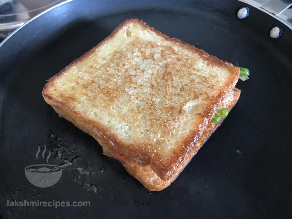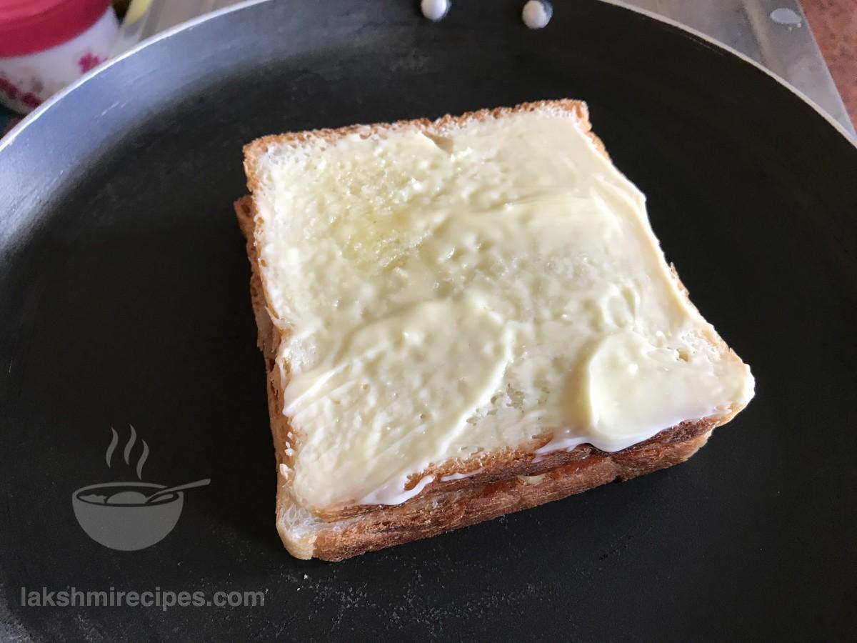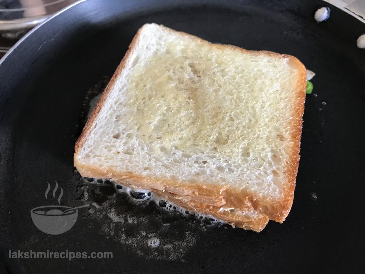 - Heat a tawa or non-stick pan and grease it with some butter. Place the sandwich on the hot tawa with the butter side facing upwards.