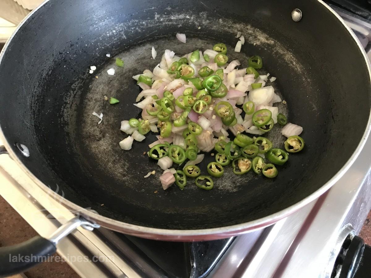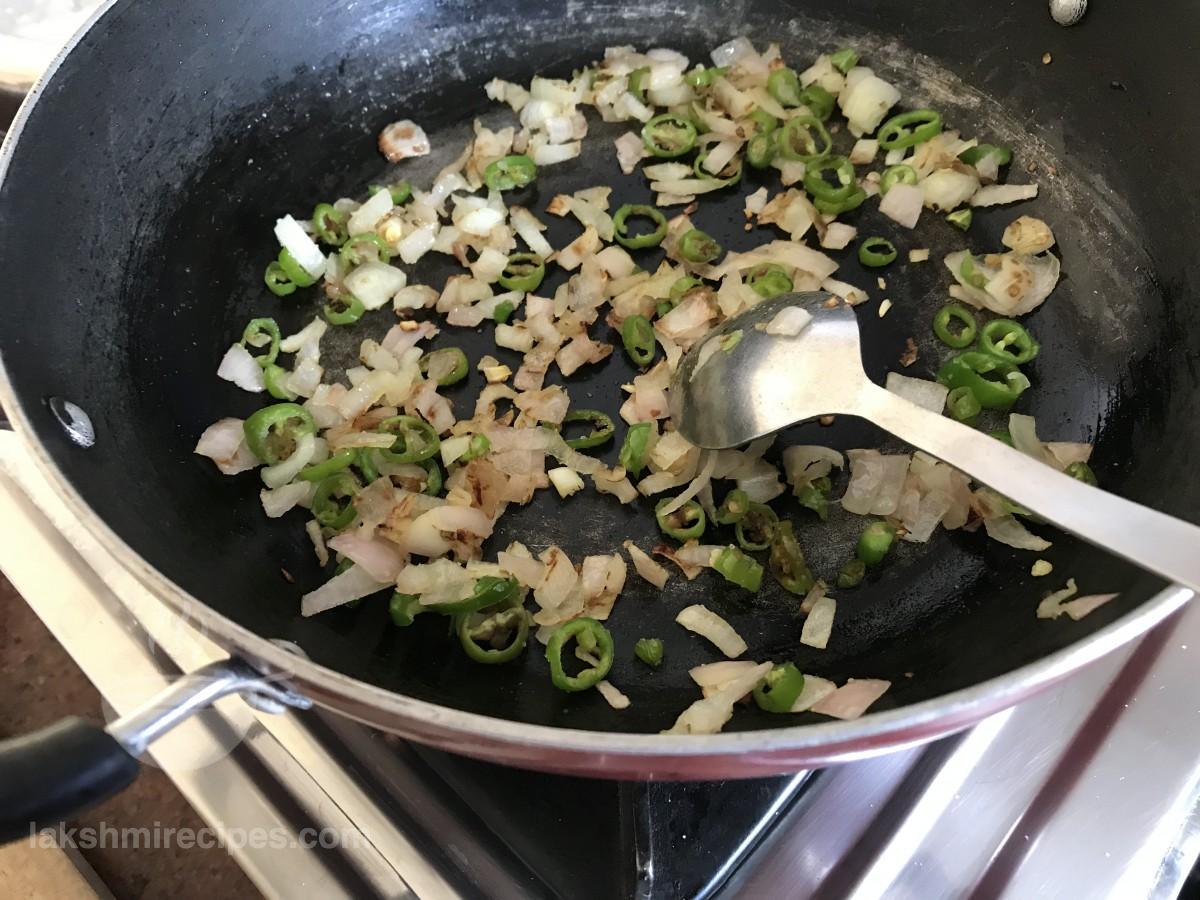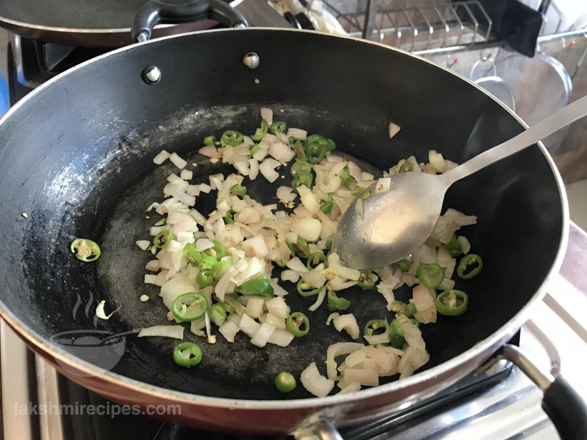 - Then add chopped onion and green chilli to it. Saute the ingredients together till the onion turns golden brown in color.
