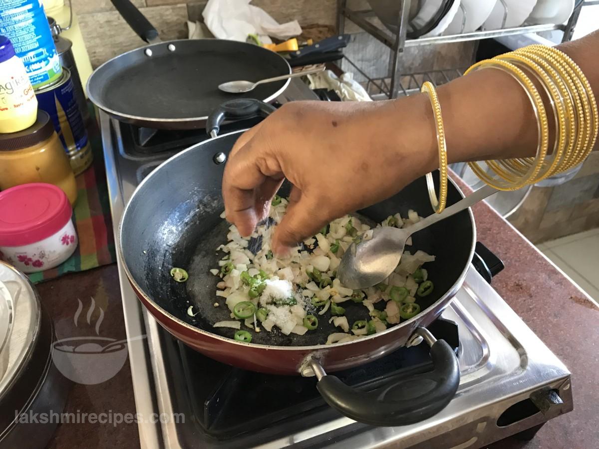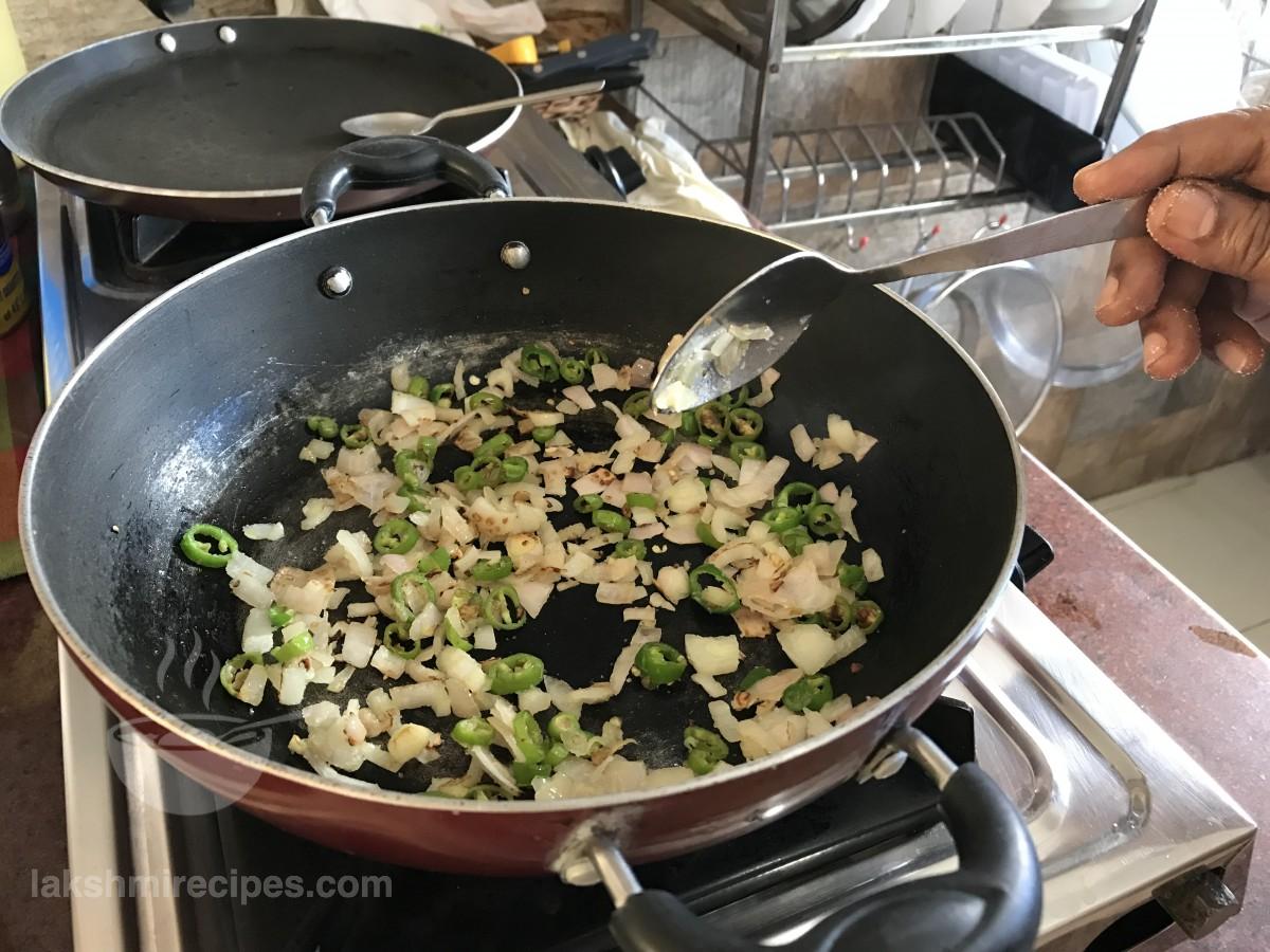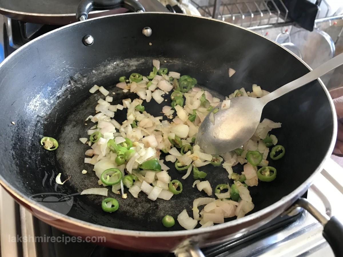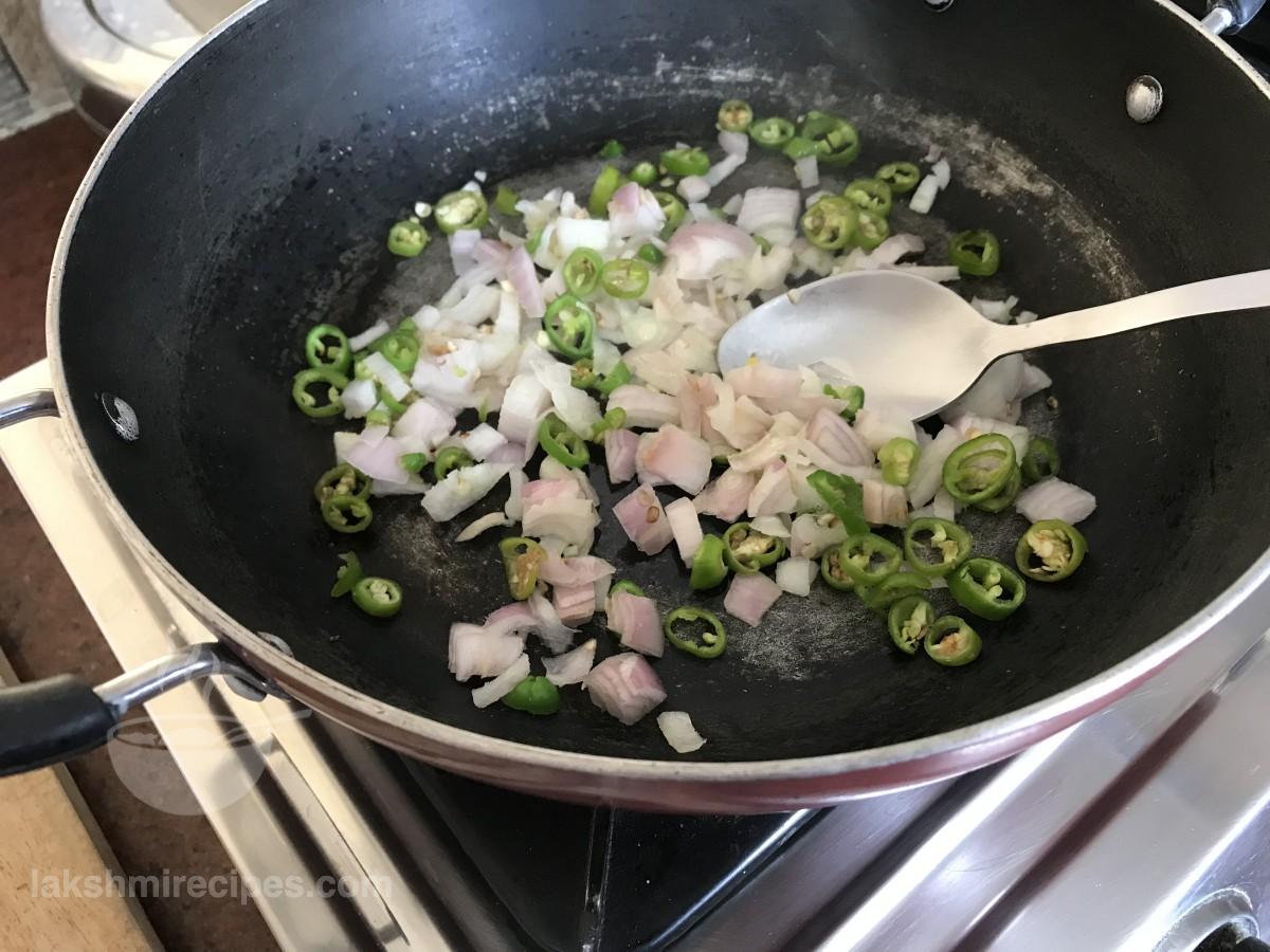 - Then add chopped onion and green chilli to it. Saute the ingredients together till the onion turns golden brown in color.