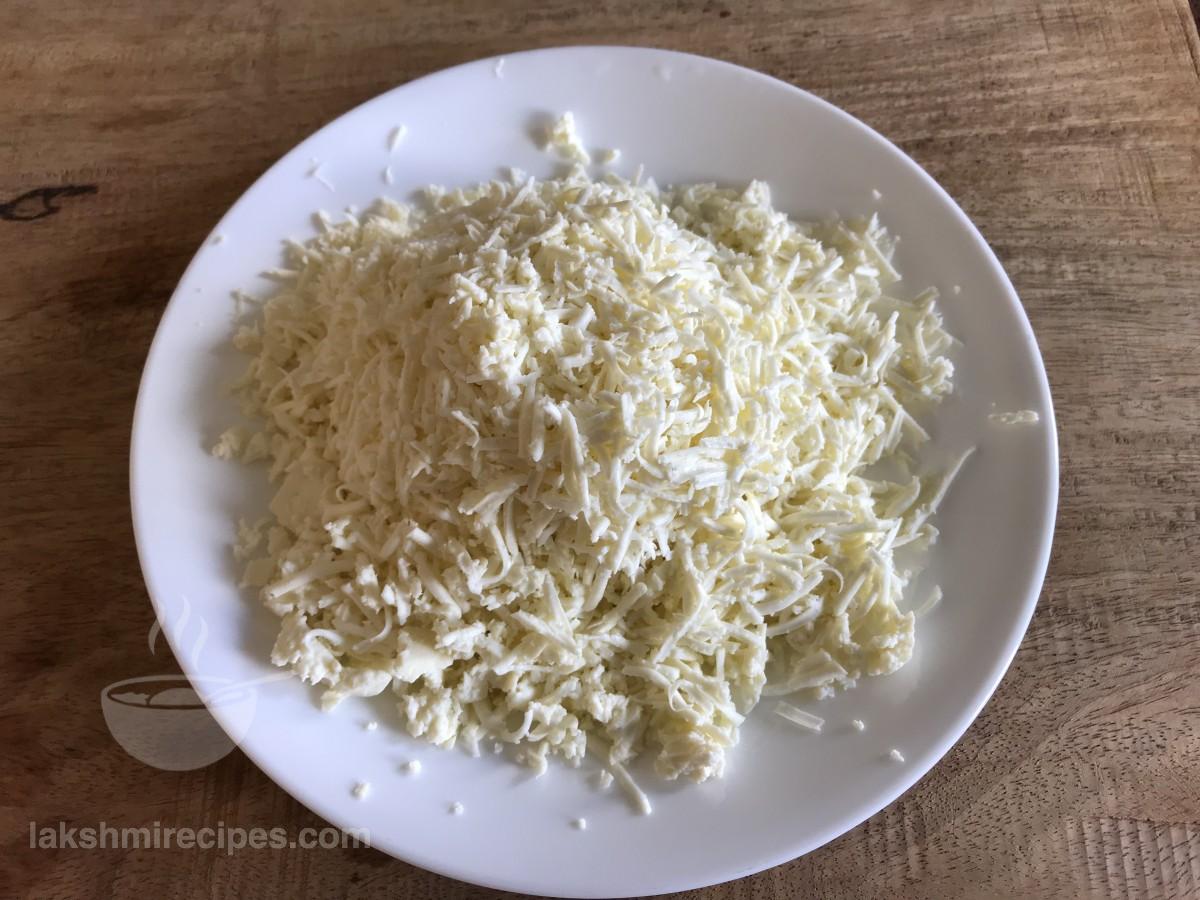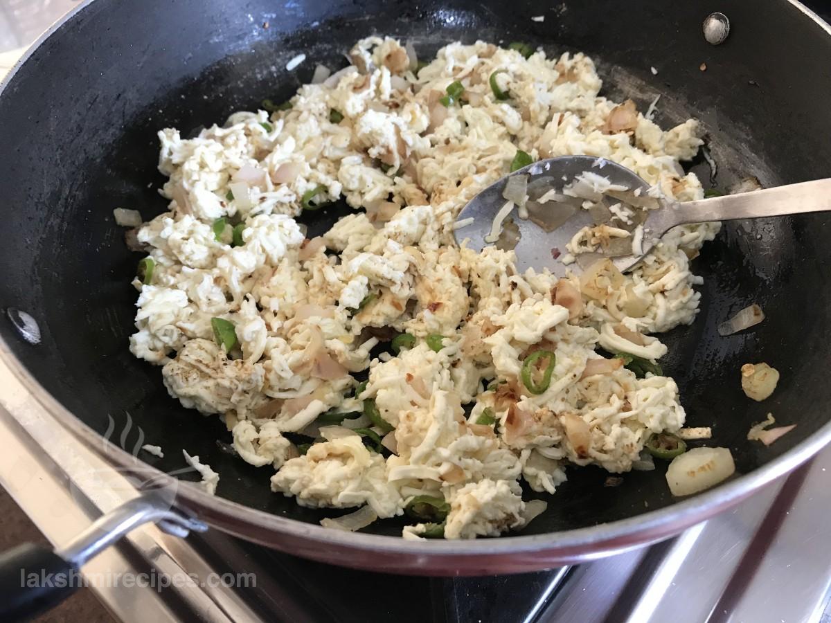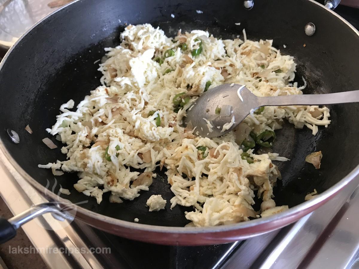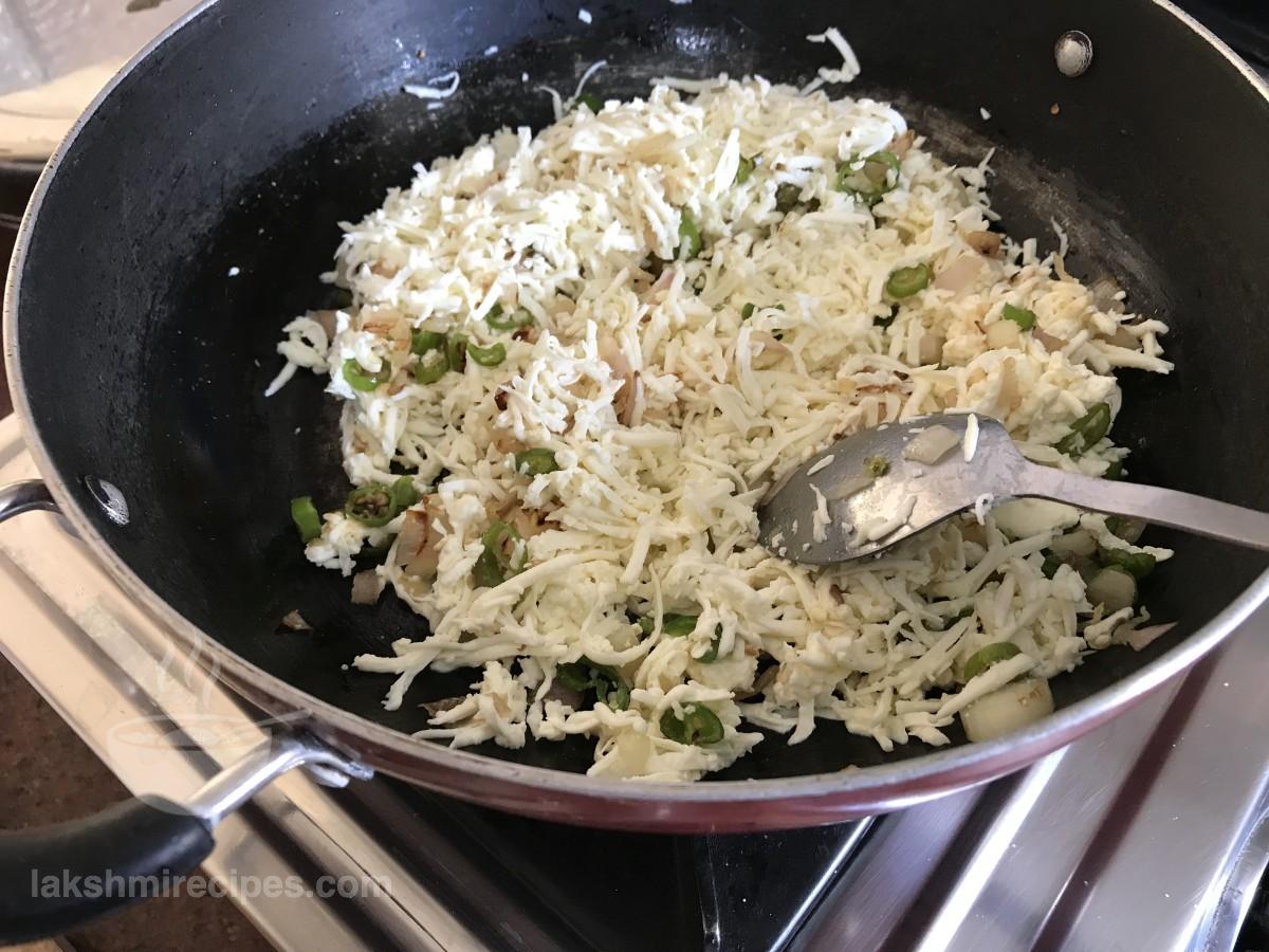- अब कढ़ाई या नॉन-स्टिक पैन में कसा हुआ या मसला हुआ पनीर डालें और मिलाएं। सारी सामग्री को 1 मिनट तक एक साथ भूनें।