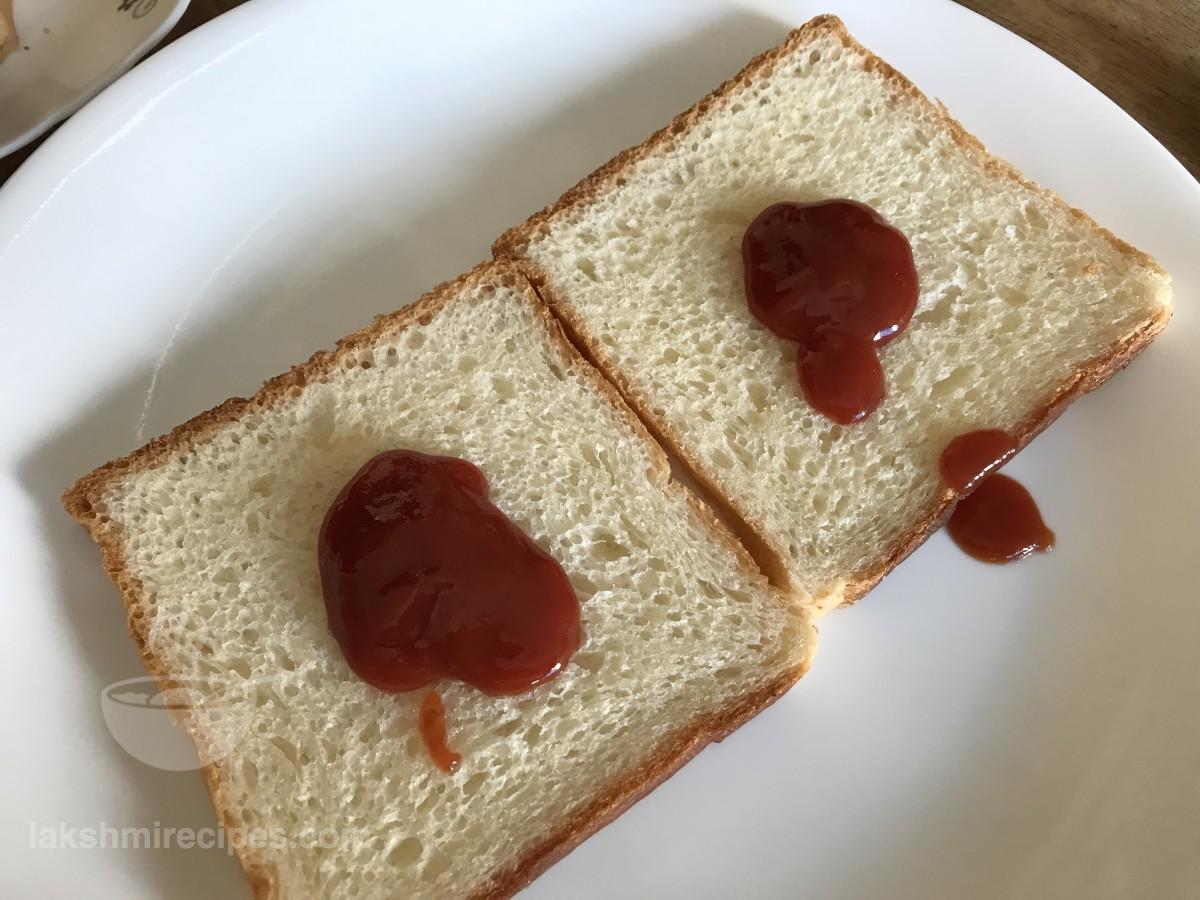 - Now place 2 bread slices in a plate side by side and apply some tomato sauce on both of them (as shown in the images below). Apply tomato sauce as per your taste and requirement.
