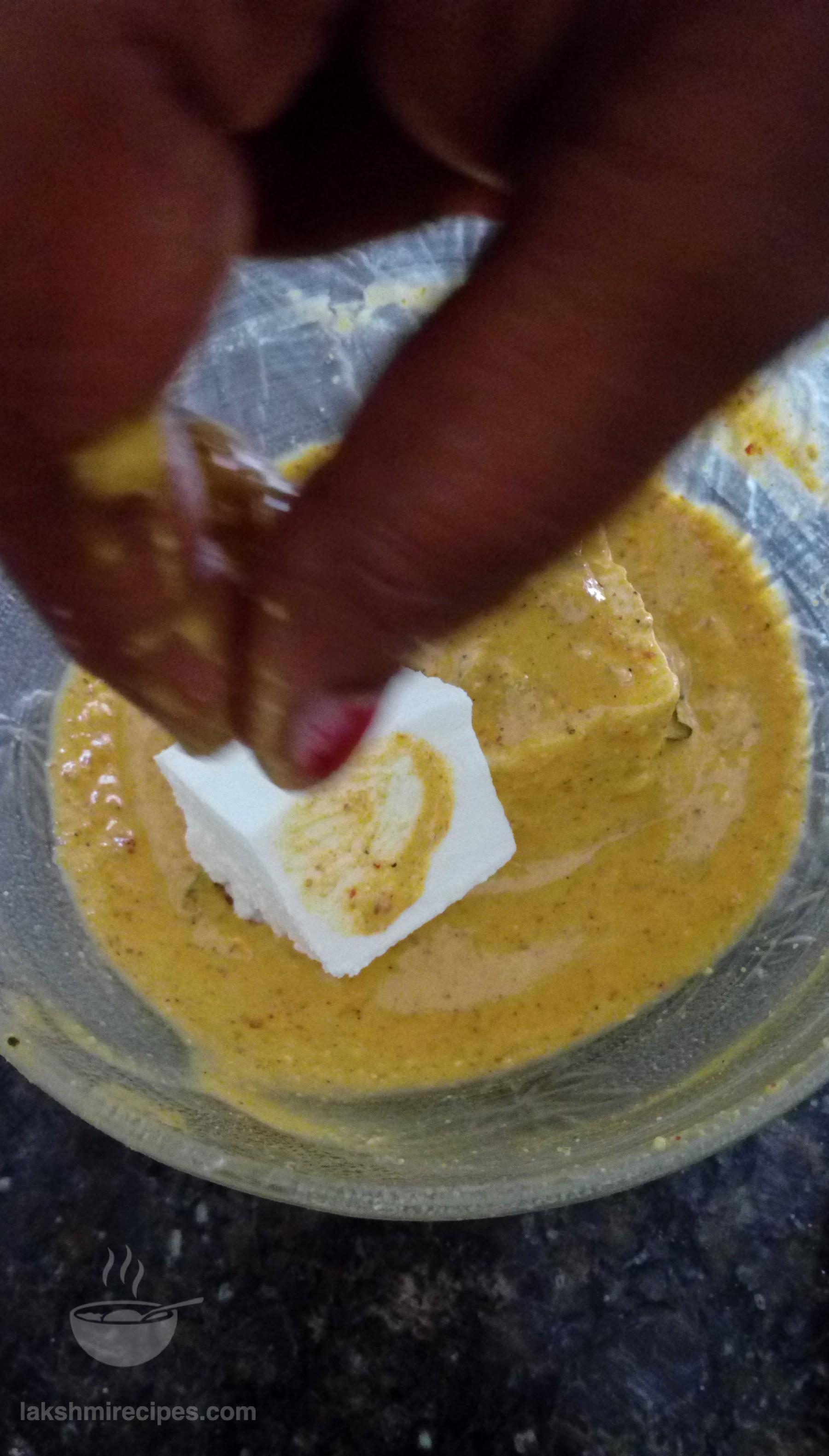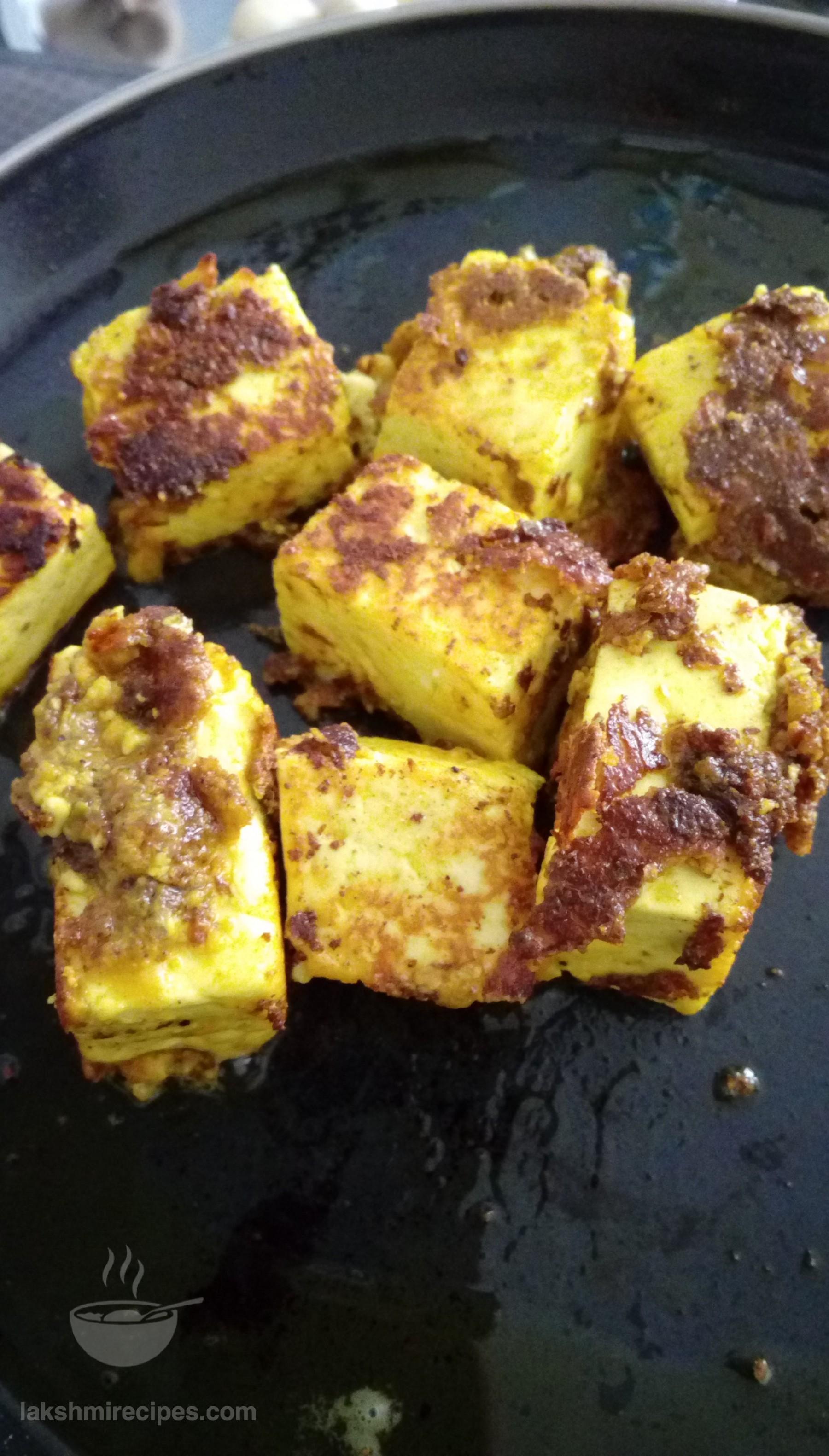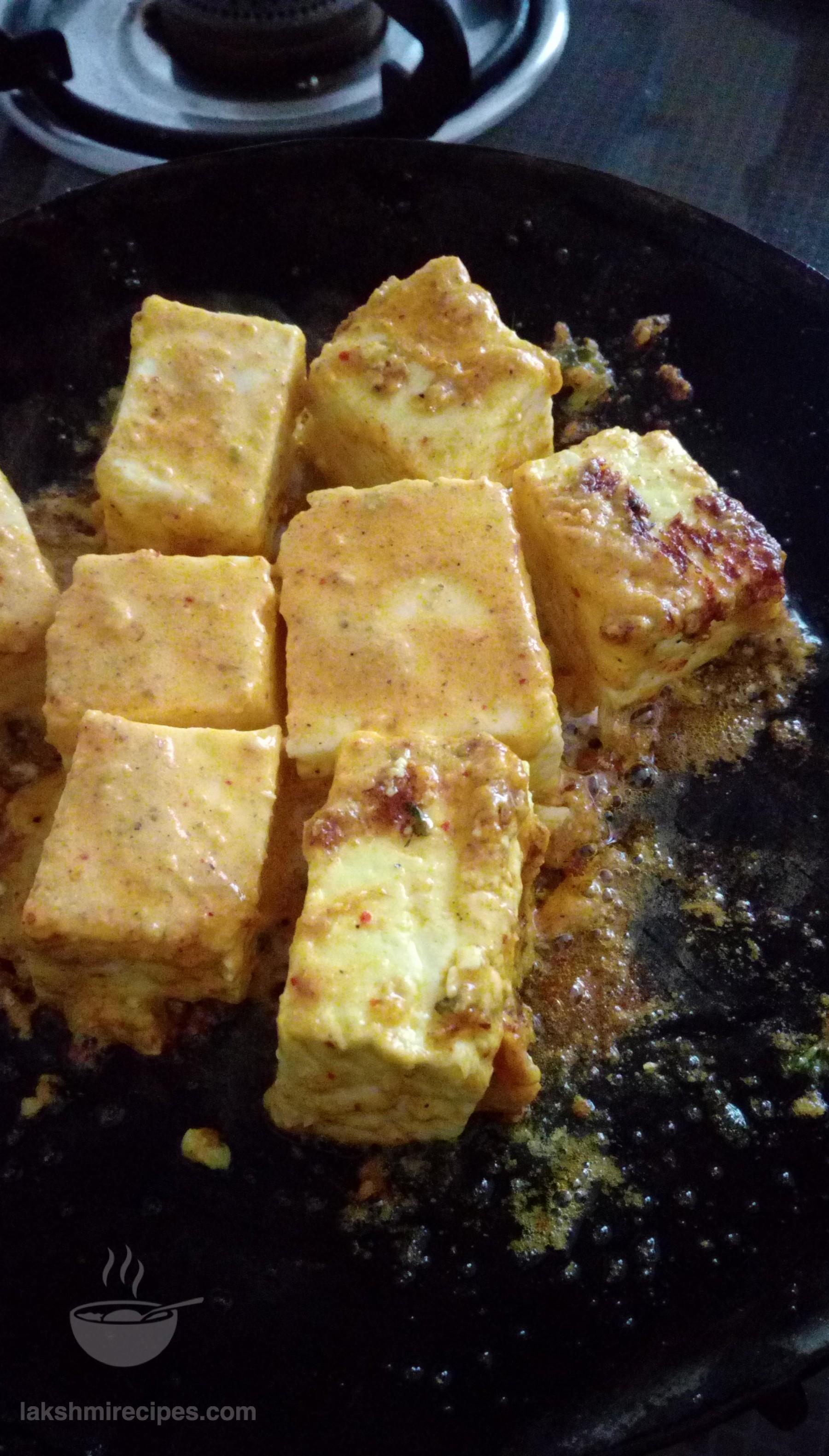 - अब दही के मैरिनेशन में पनीर को डालकर, अच्छी तरह चारों तरफ मैरिनेशन से कोट करें। फिर मैरिनेटेड पनीर को पकाने के लिए नाॅन-सटिक पैन पर रखें। आॅच को कम करें और पनीर को पकनें दें जिस्से कि वे चारों तरफ से सुनहरे लाल रंग केे होजाऎं।