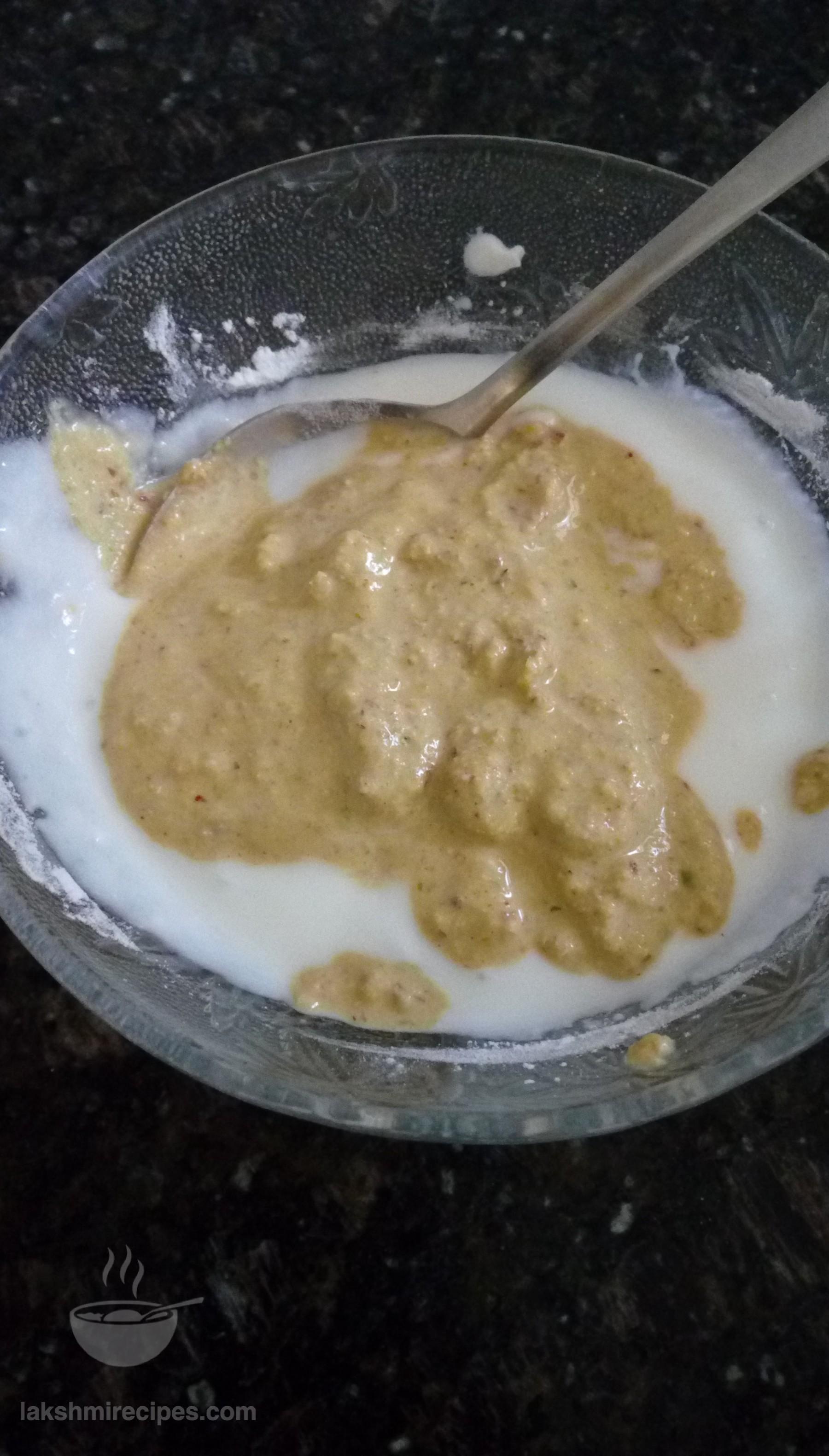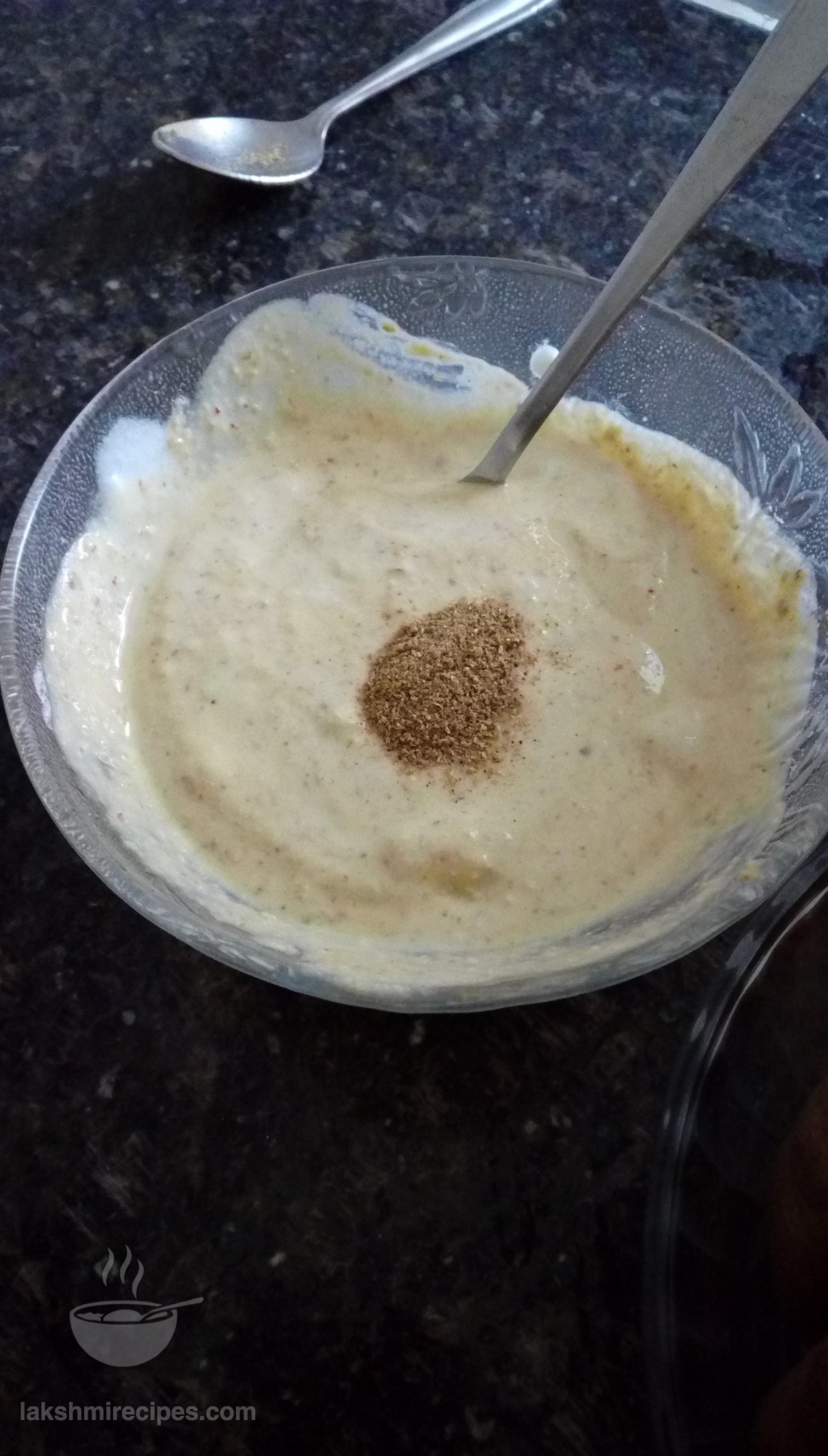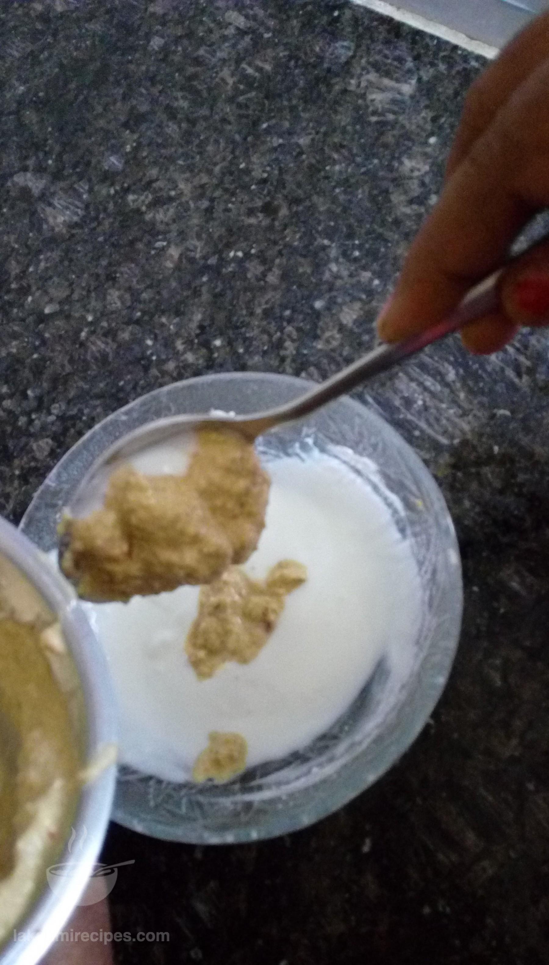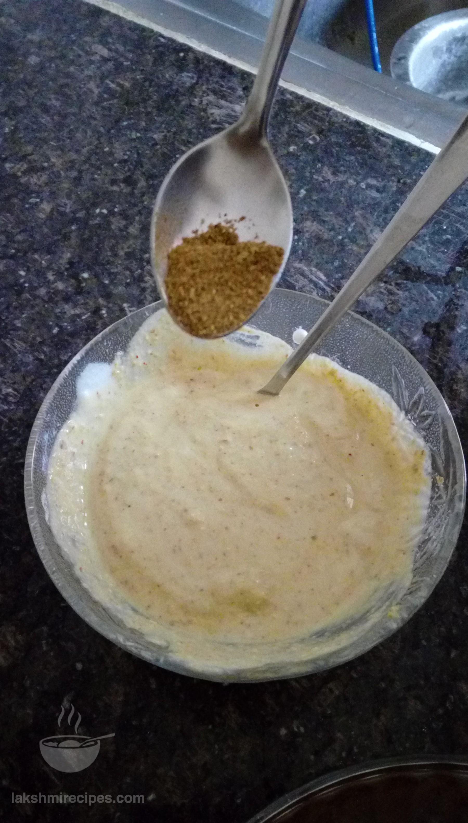 - फिर स्वाद के अनुसार नमक, आमचूर पाउडर और स्टेप 3 में तैयार किये गये पेस्ट को भी दही के मिश्रण में डालें। फिर मिलालें और 5 मिनट के लिए दही के मैरिनेशन को स्थिर छोड़दें।