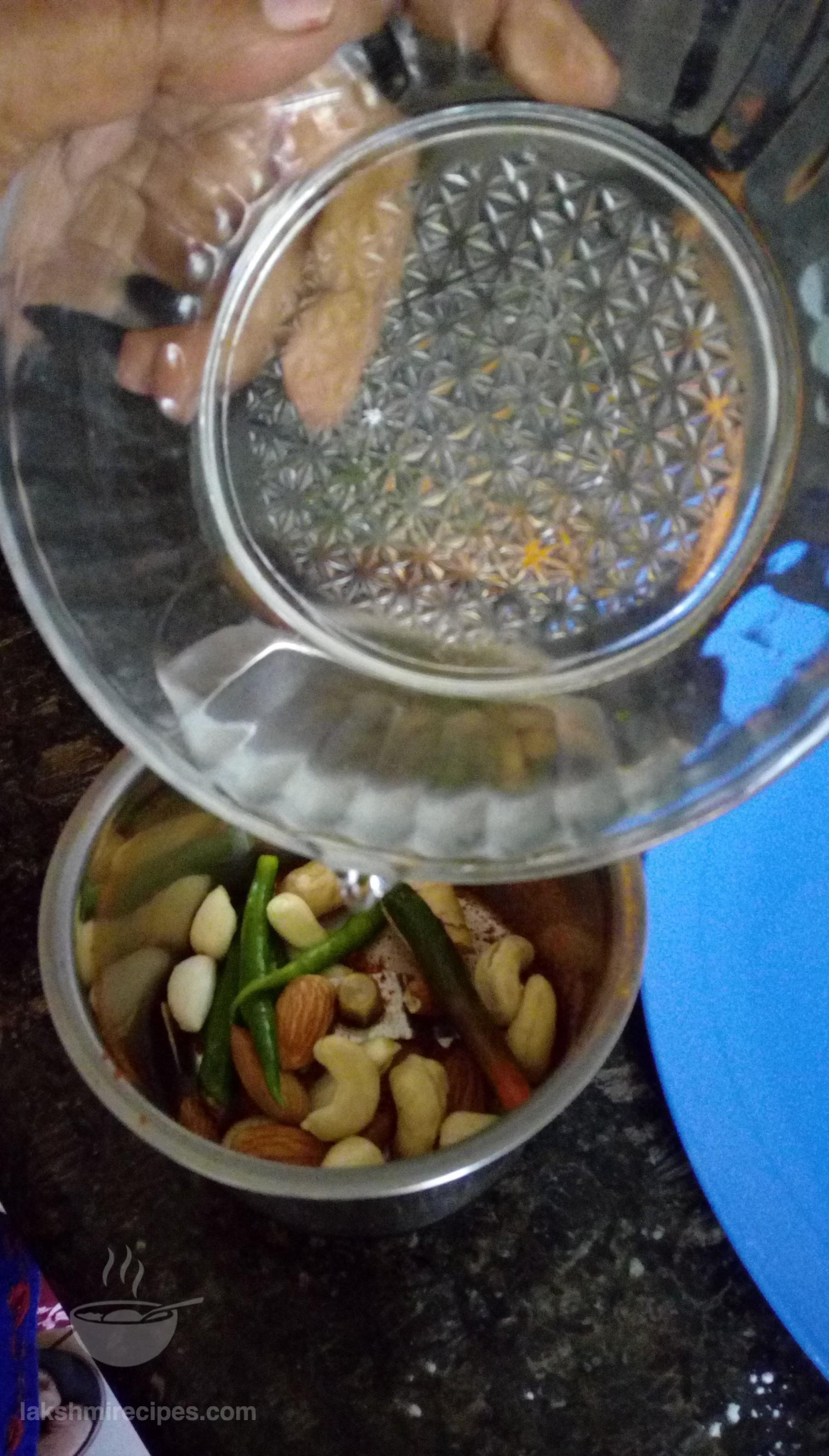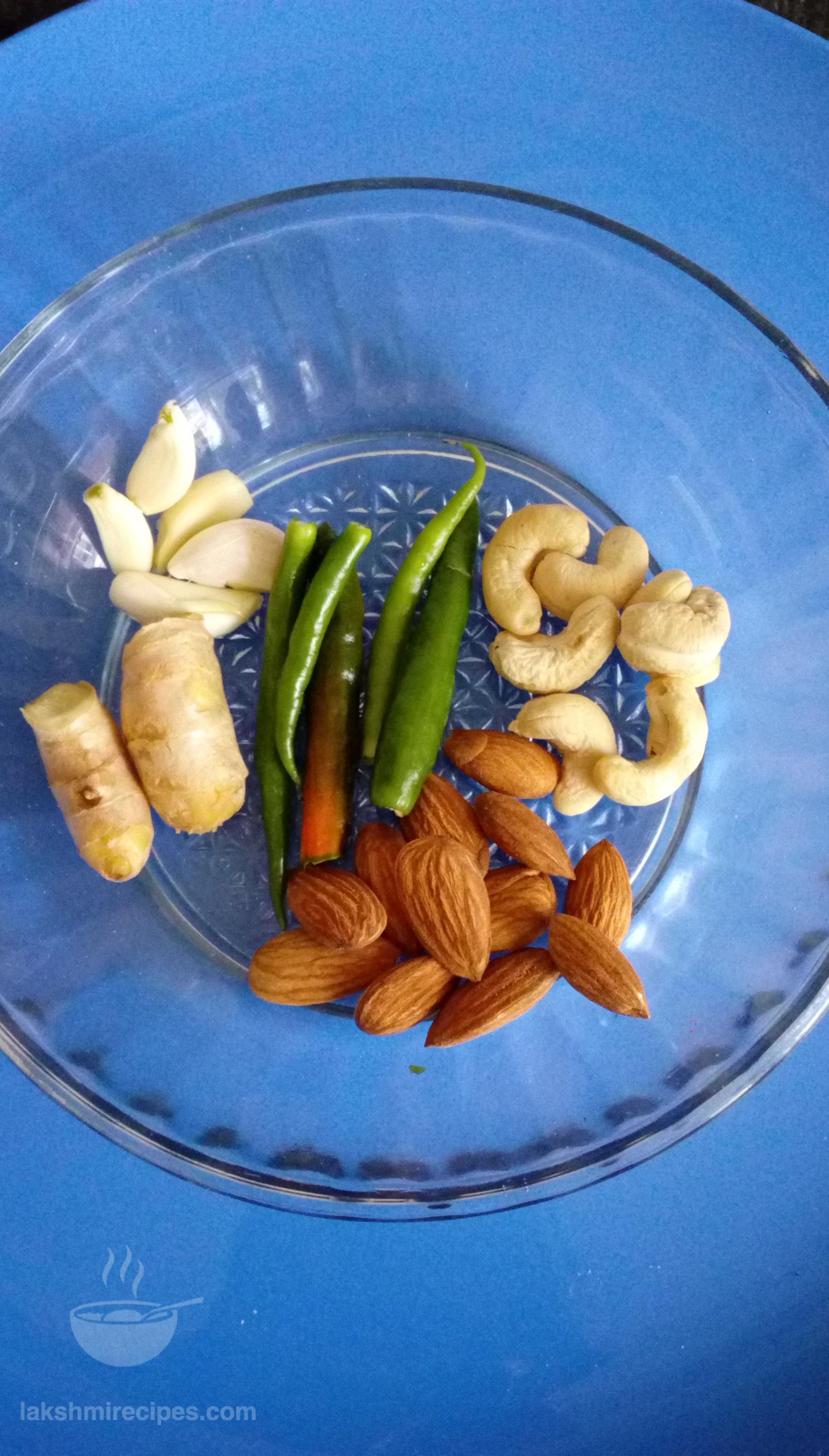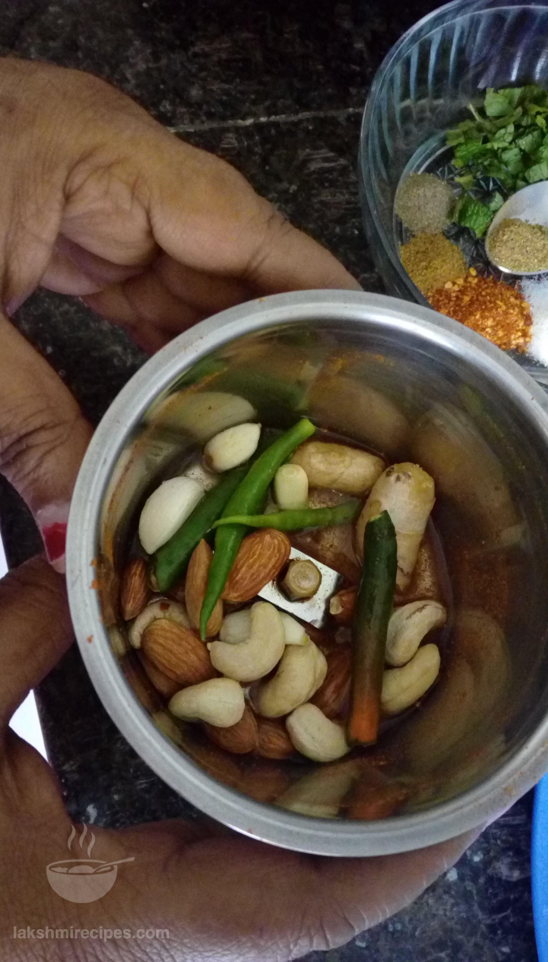 - अब मैरिनेशन तैयार करने के लिए मिक्सर के जार में अदरक का टुकड़ा, लहसुन की कली, हरी मिर्च, बादाम और काजू लें और उनको बारीक पीसकर पेस्ट बनालें।