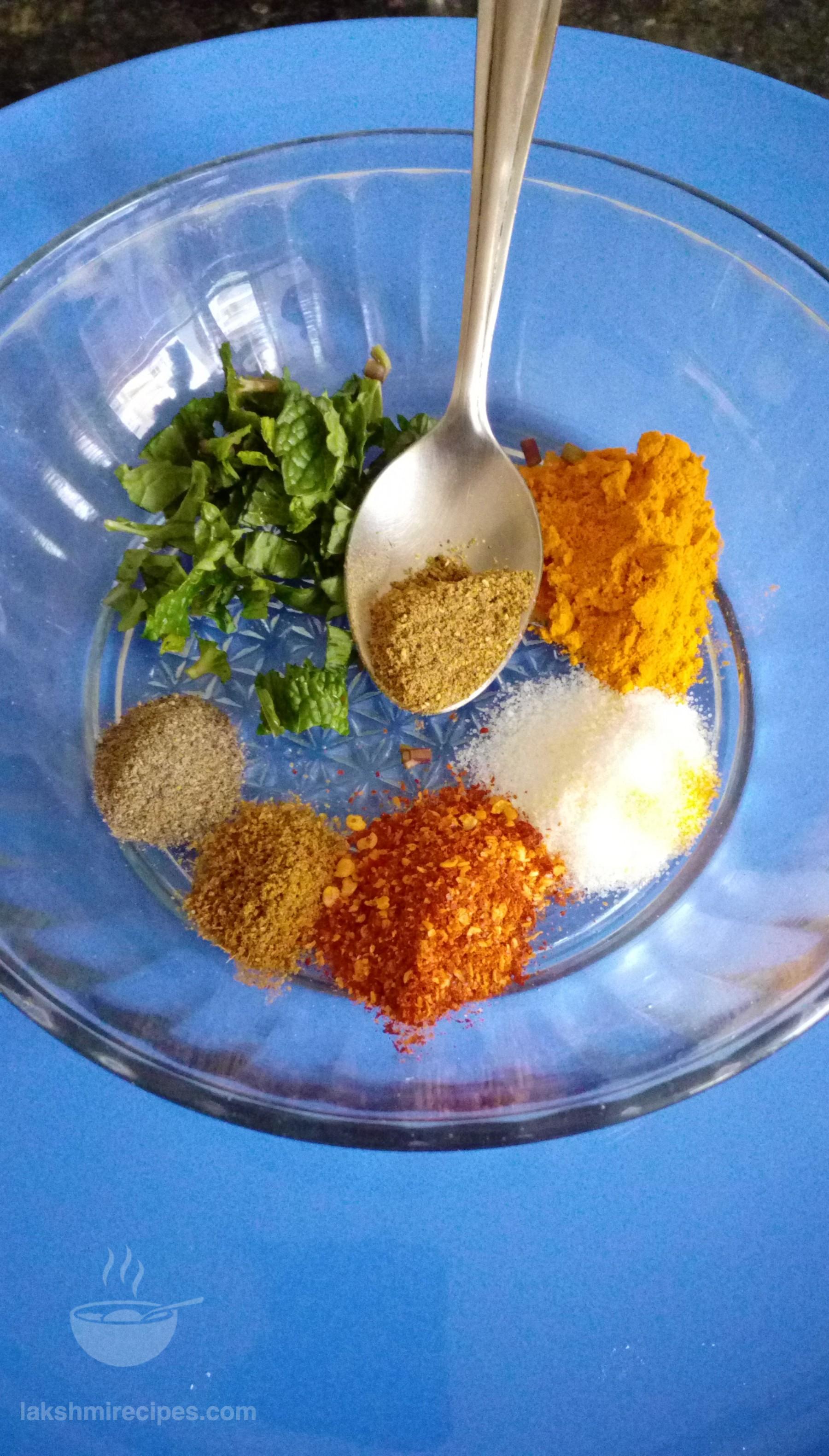 - Now add garam masala powder, finely chopped mint leaves, turmeric powder, cumin seeds powder, red chilli powder, black pepper powder and 1 tea spoon mustard oil to it. Mix all the ingredients well.