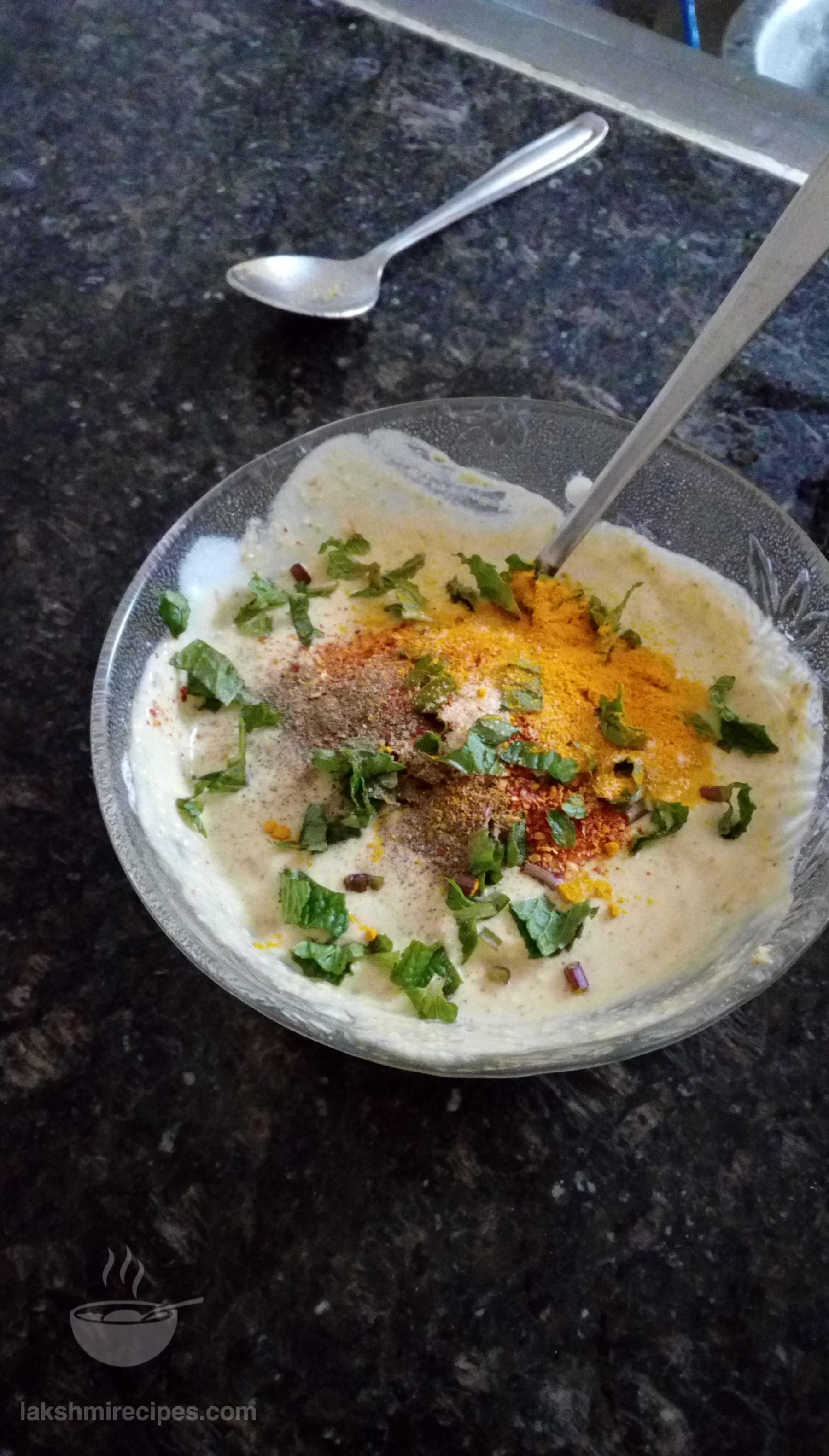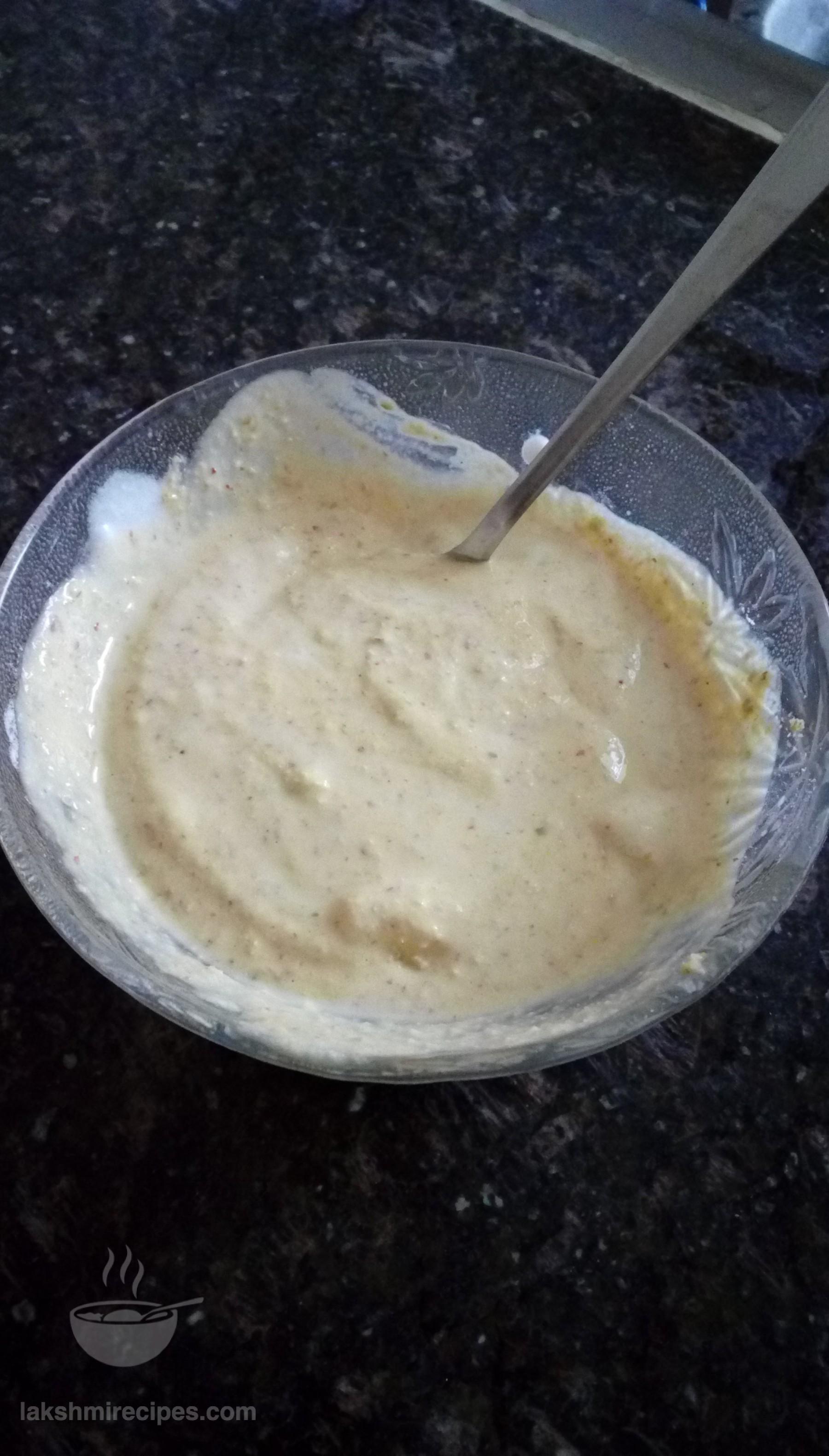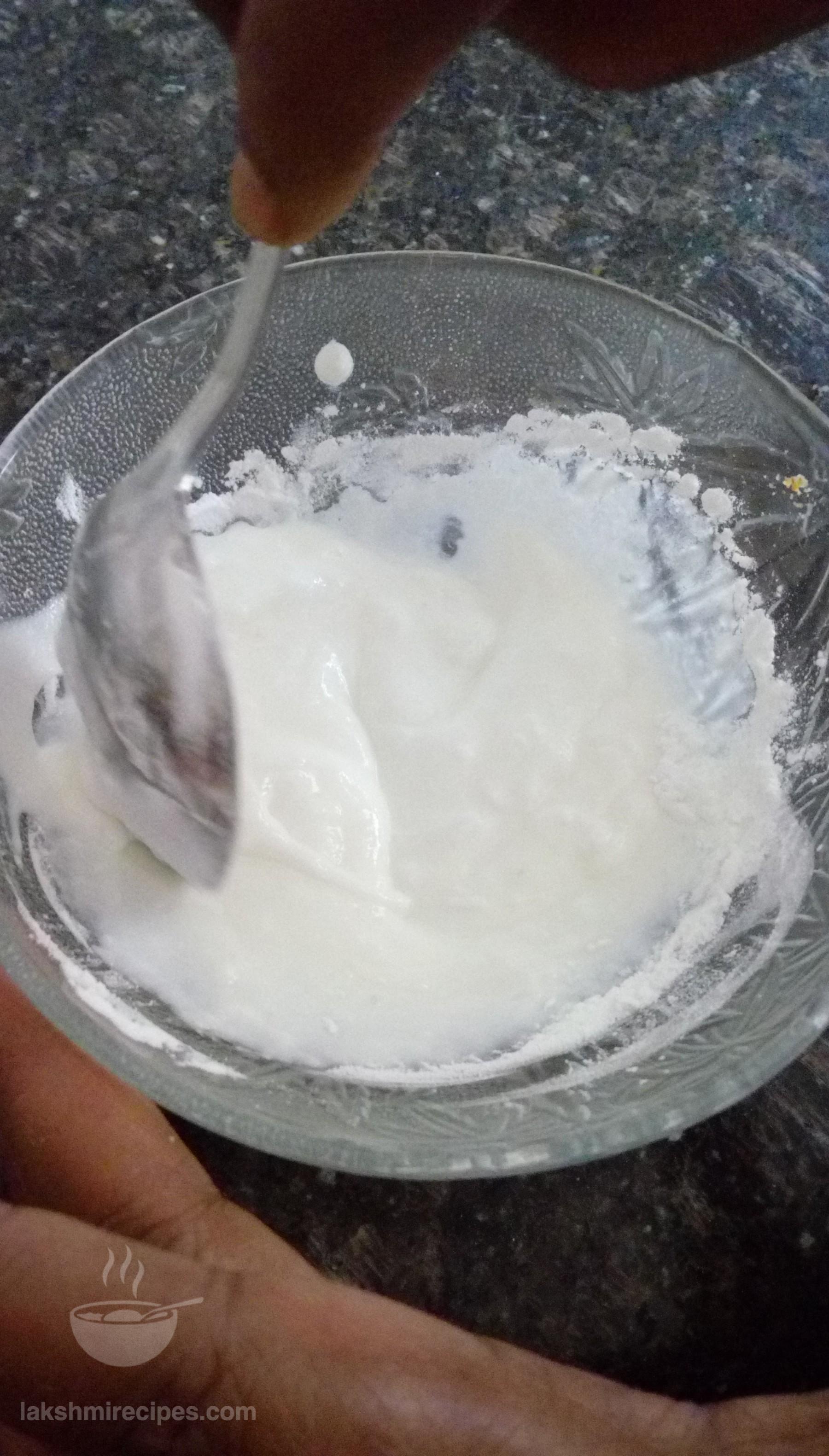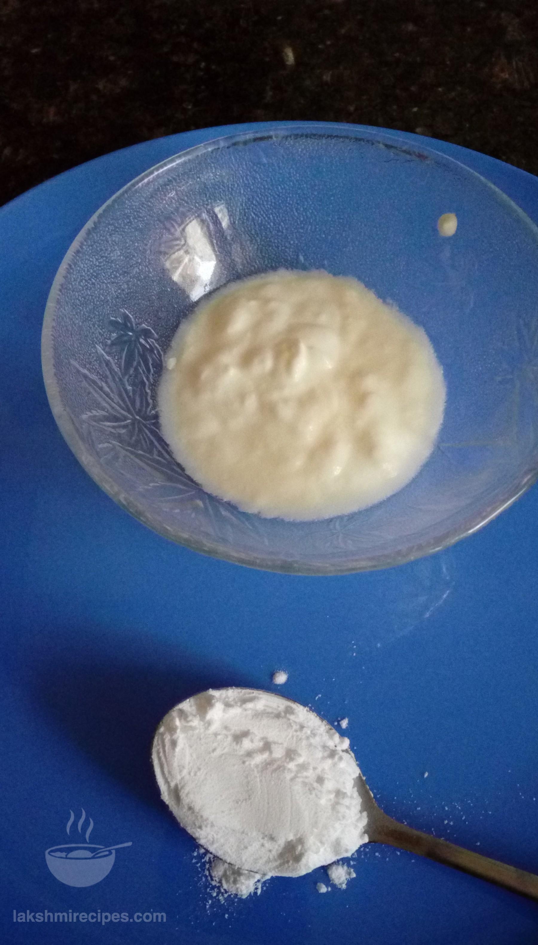 - फिर एक बड़े कटोरे में दही लें और इस्में कार्नफ़्लोर डालें। एक समान मिश्रण बनाने के लिए सामग्री को एक साथ मिलाएं।