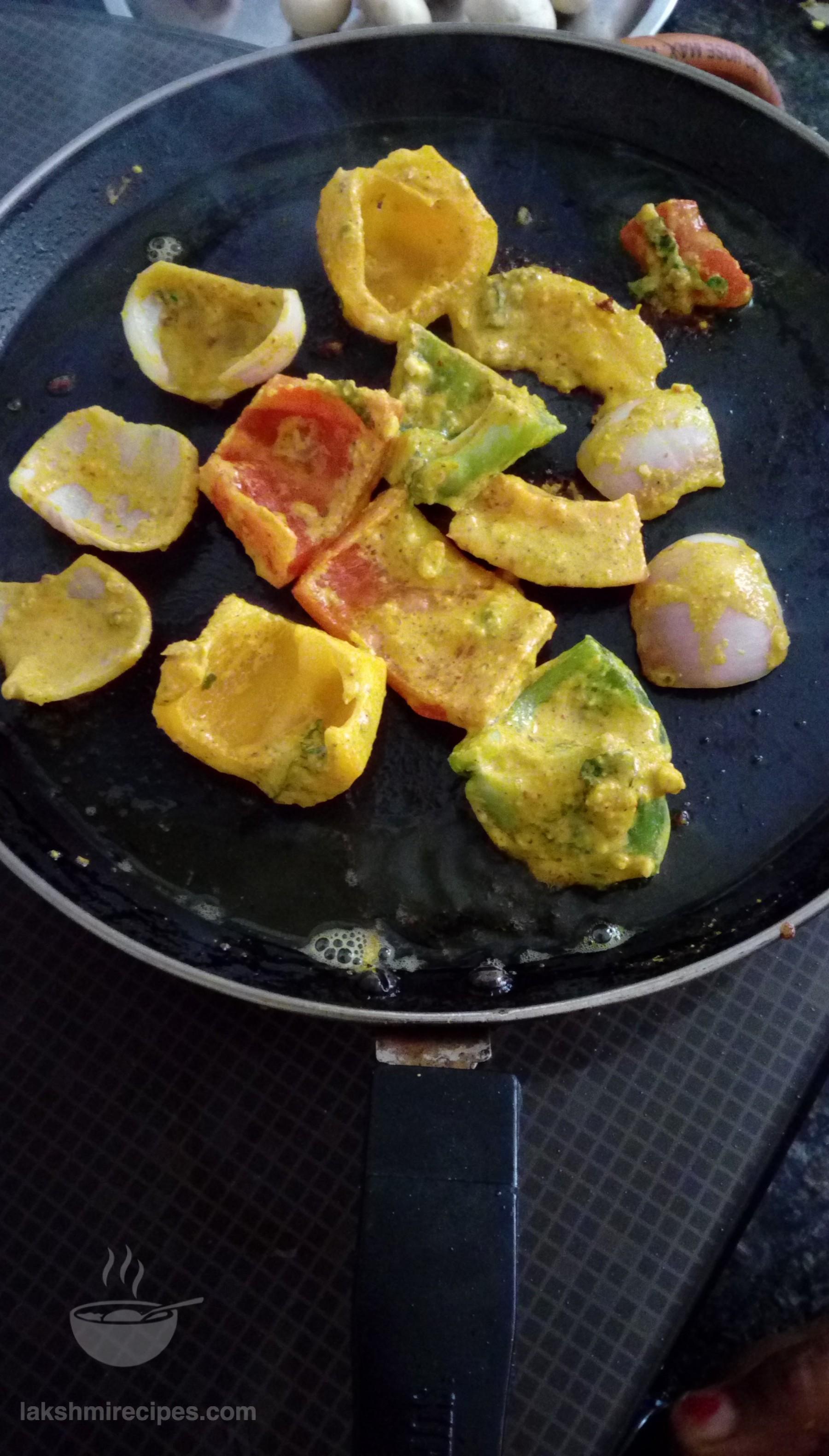 - अब दूसरे नाॅन-सटिक पैन पर शिमला मिर्च (लाल, हरे और पीले) और प्याज के टुकड़ों को पनीर की तरह मैरिनेट करके पकनें केलिये रखें। आॅच को कम करें और दोनों सामग्री को पकनें दें जिस्से कि वे हर तरफ से सुनहरे लाल रंग केे होजाऎं।
