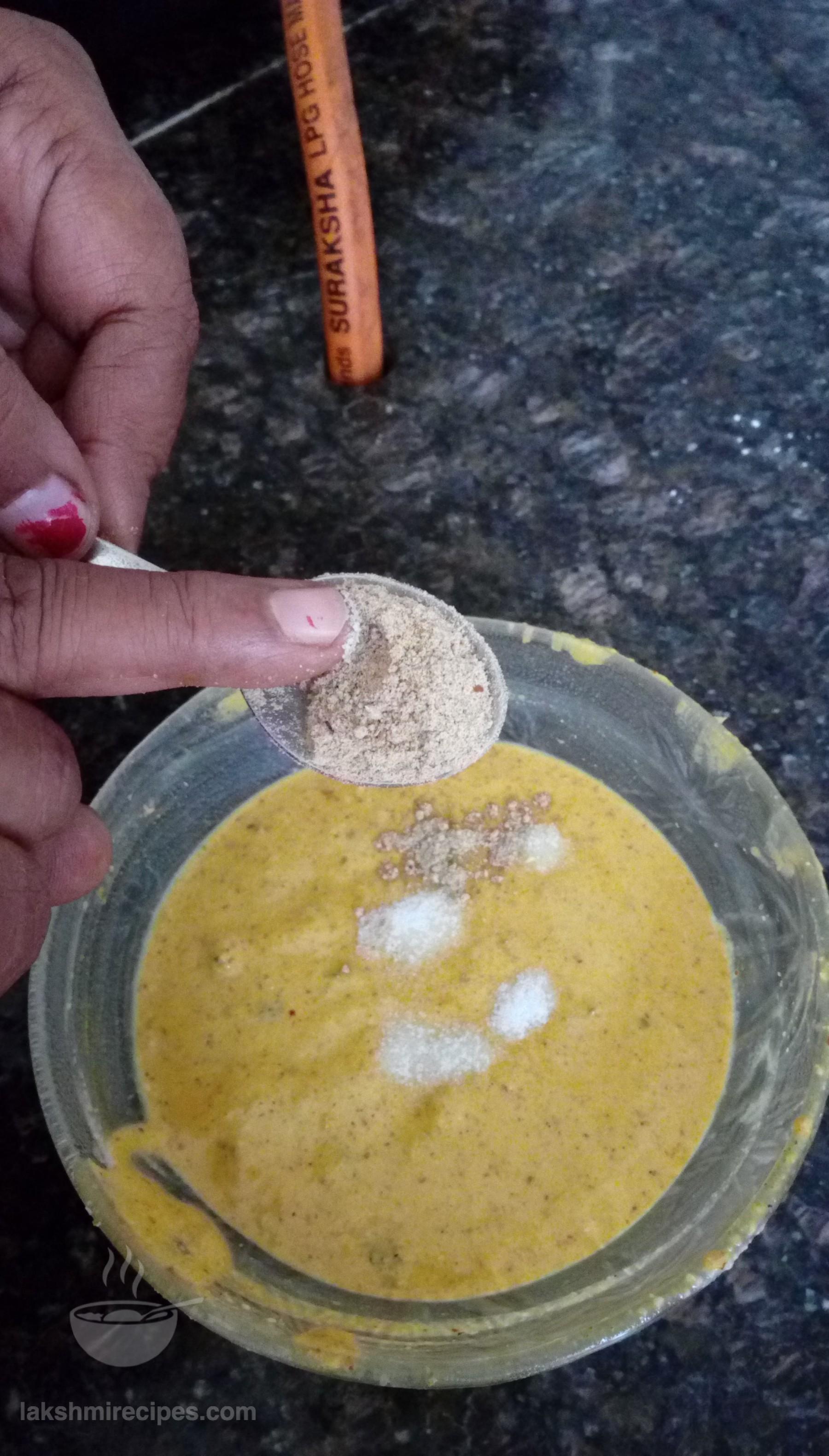 - Then add salt as per taste, dry mango powder and the paste prepared in step 3 to the mixing bowl. Mix again and then leave the curd marination to rest for 5 minutes.