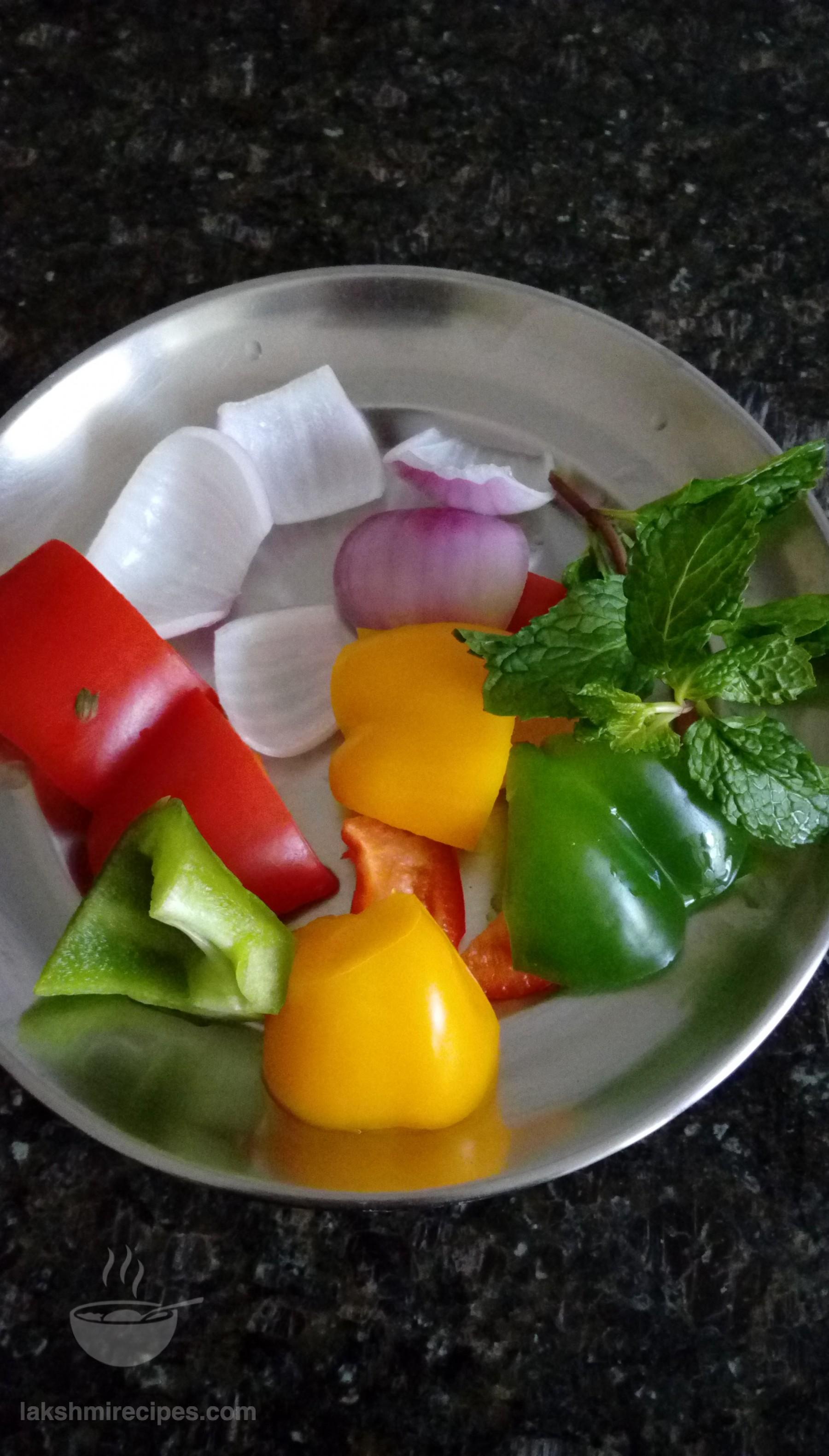 - Wash the onion and capsicums (red, green and yellow) with plain water and then chop them into big square shaped pieces. Seperate the layers of the onion.