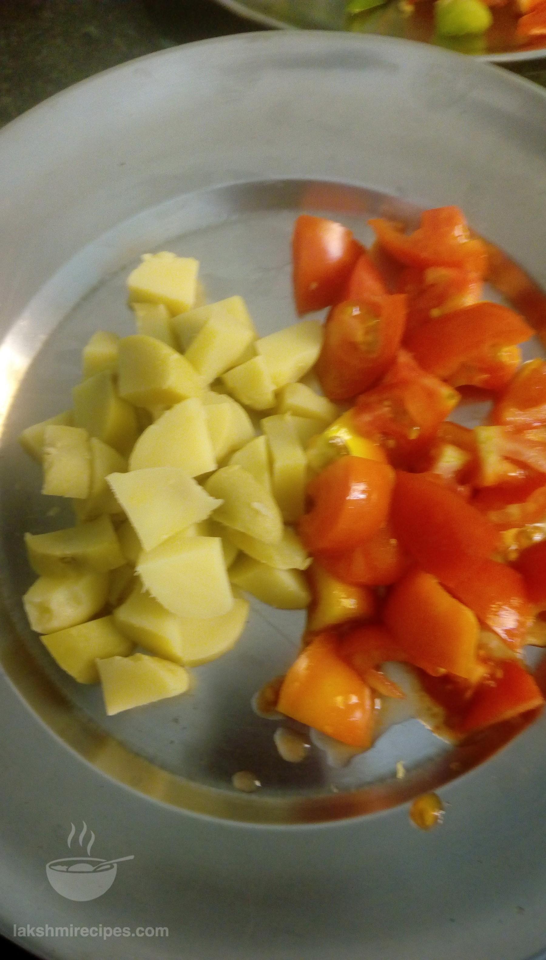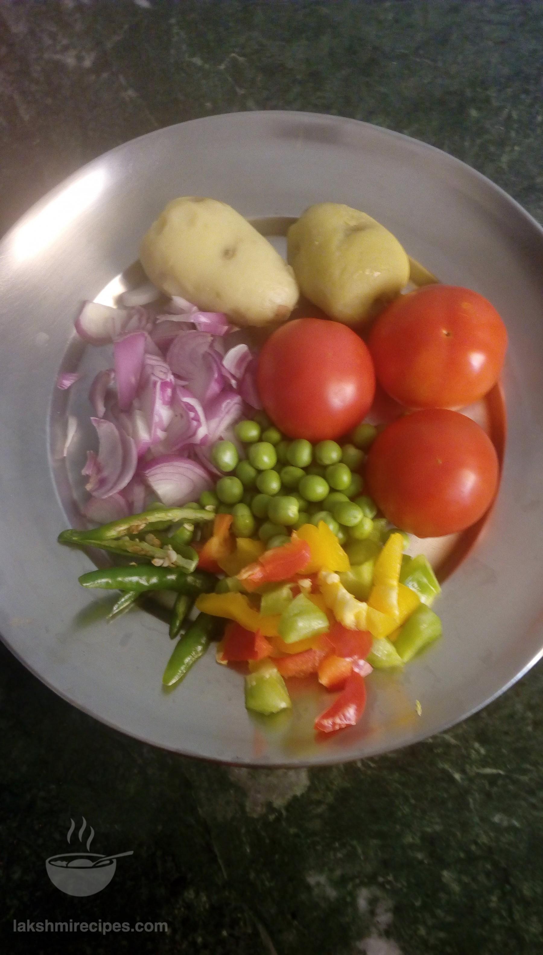 - Wash all the vegetables well with plain water and finely chopped all of them. Then peel the boiled potatoes and cut into small pieces.