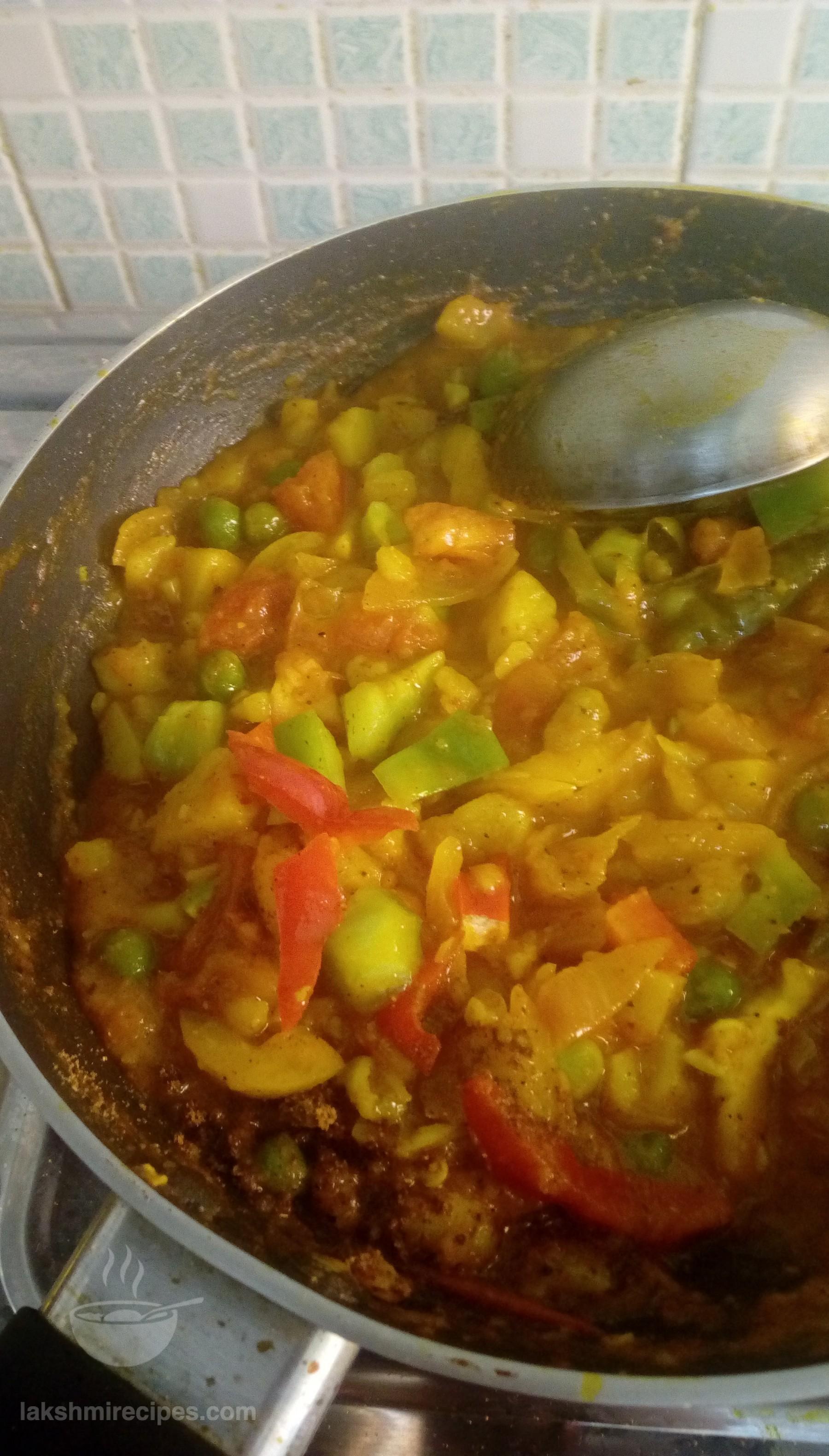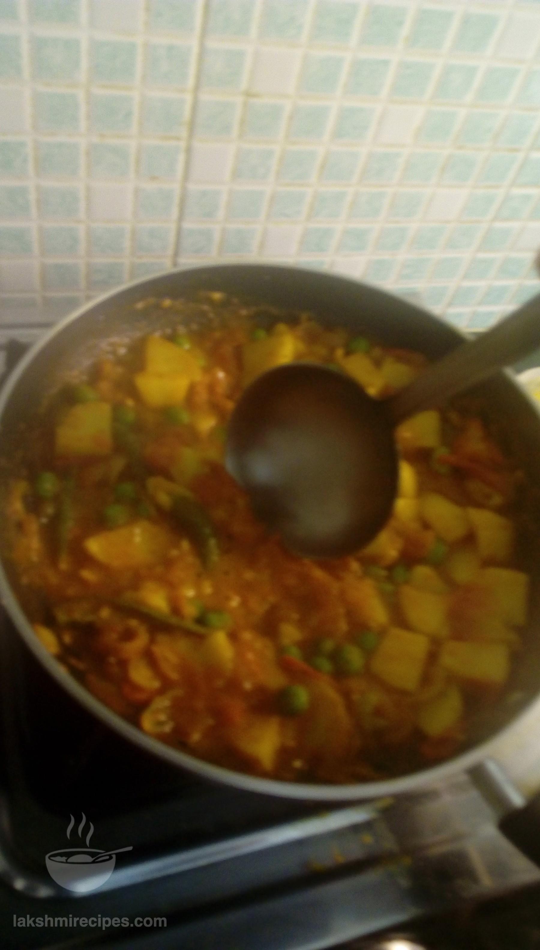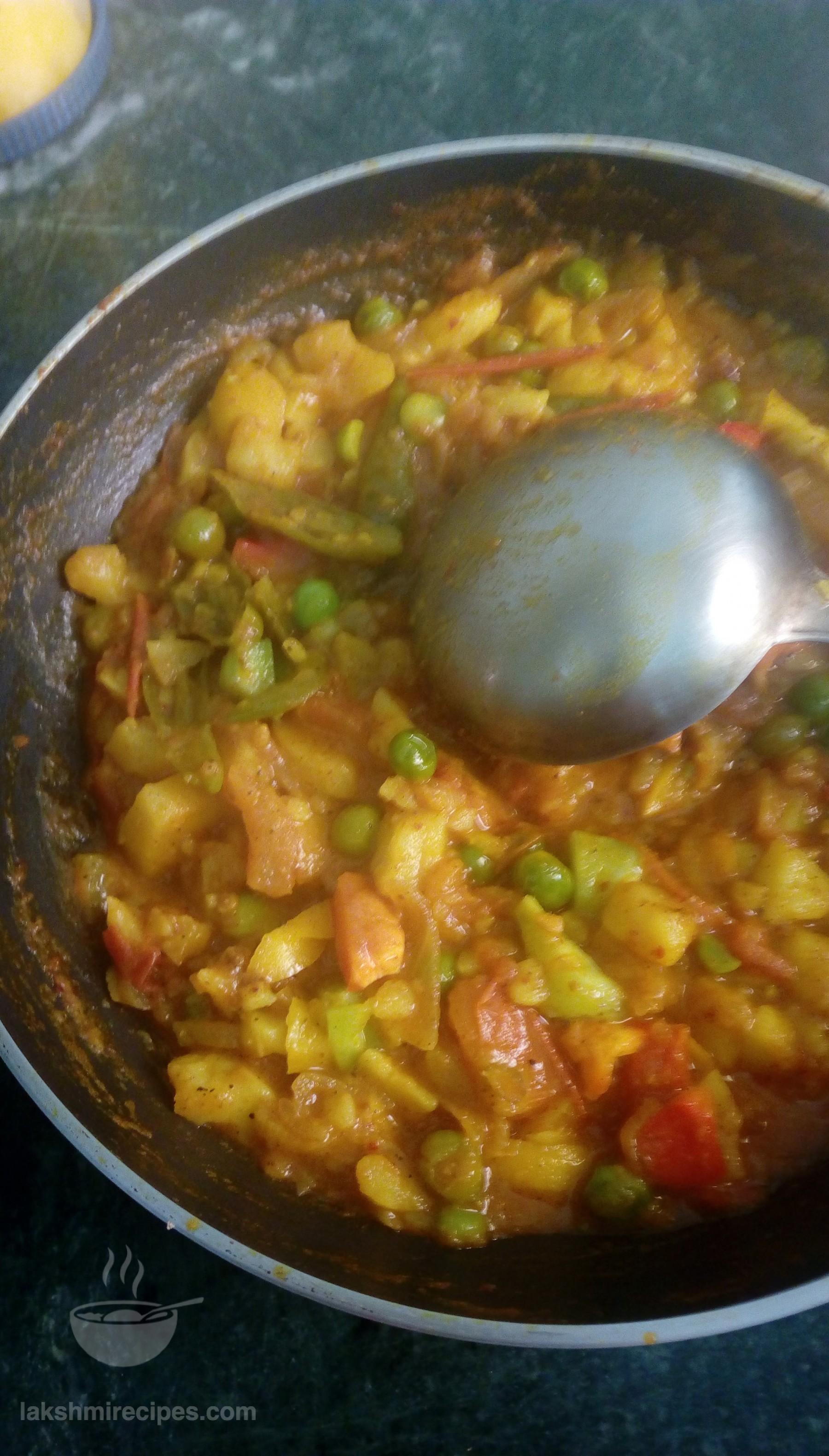 - Cook in this manner till all the vegetables become soft and are cooked. Then mash and chafe the vegetables a little with the help of a ladle.