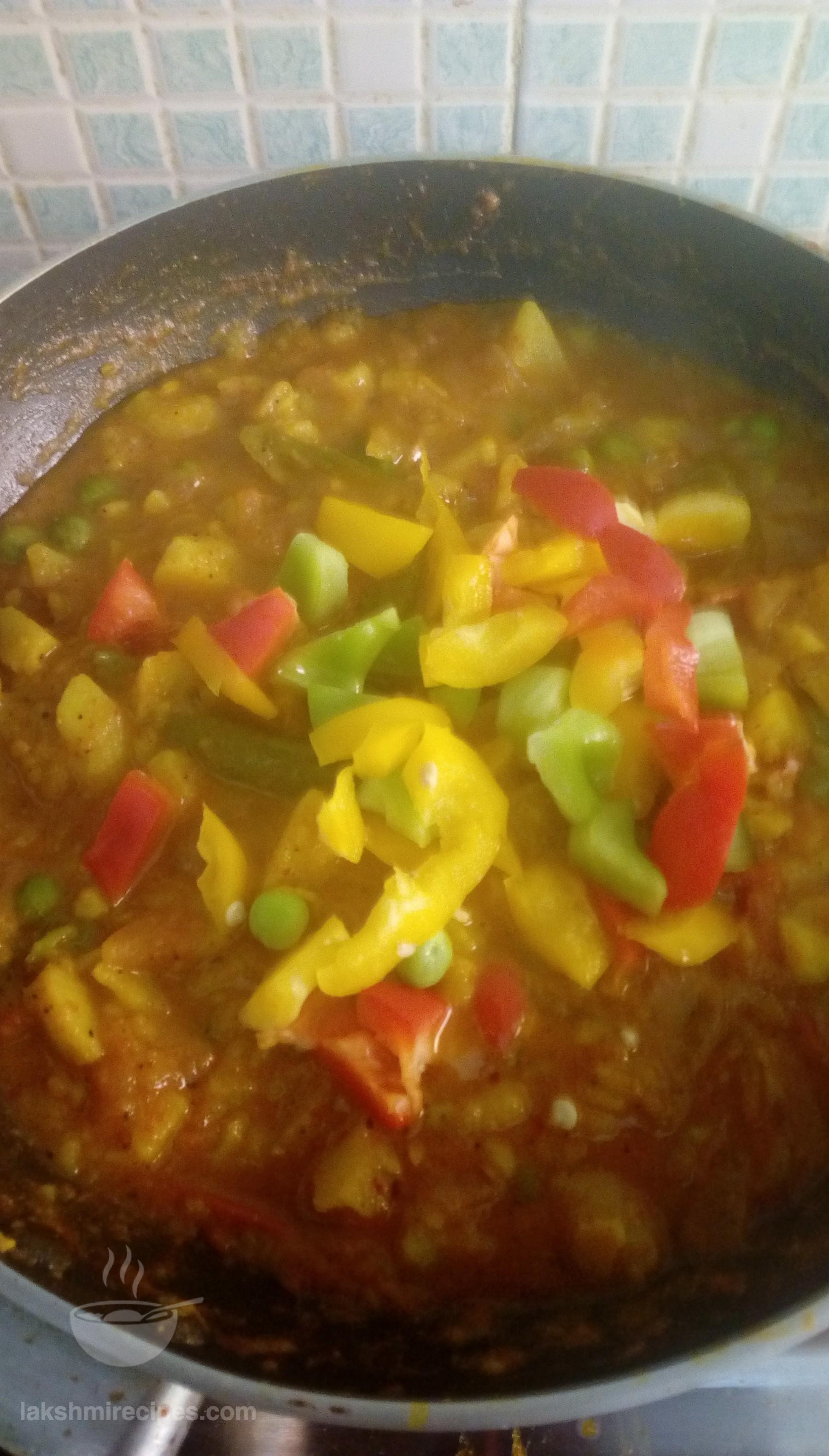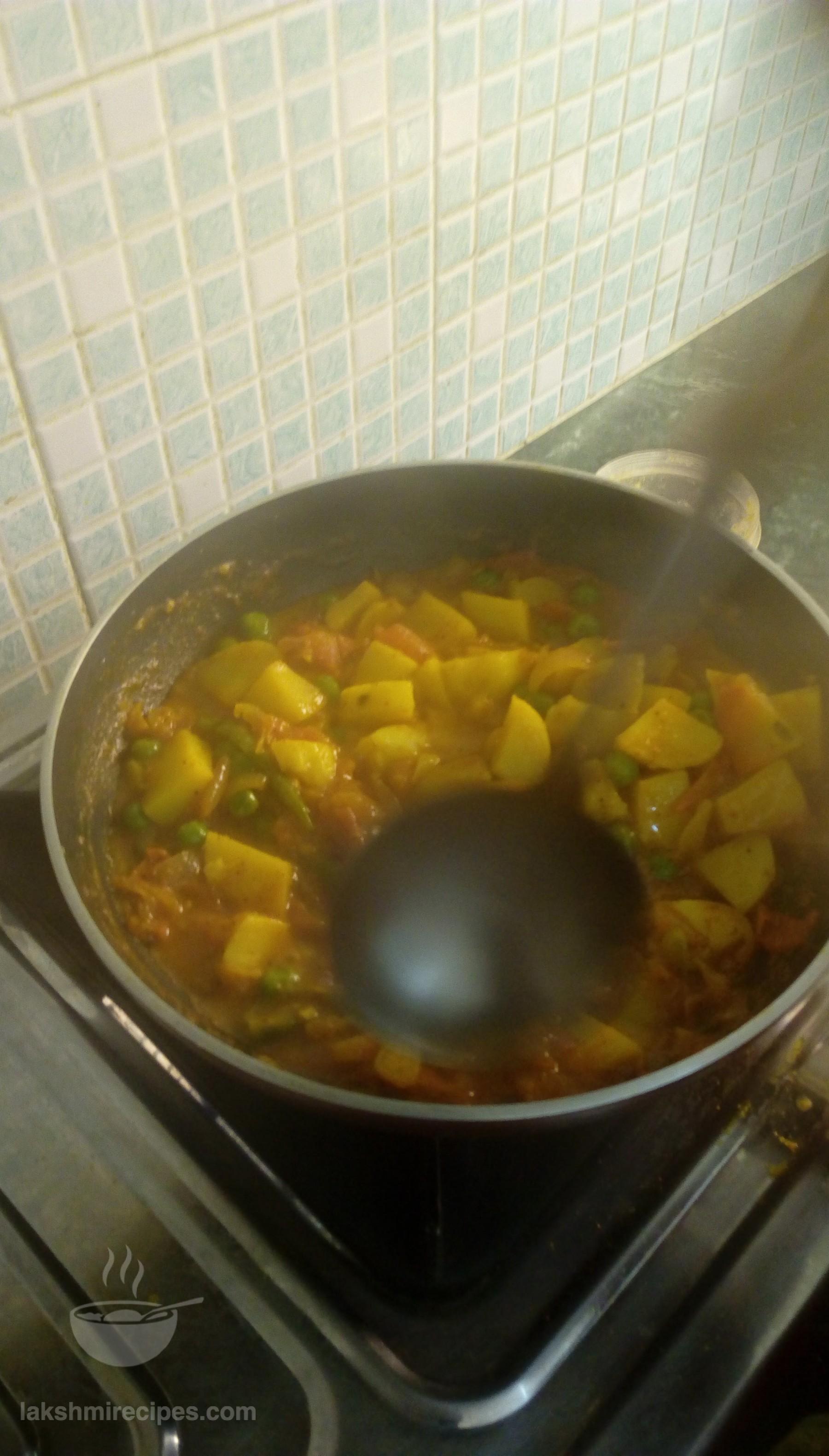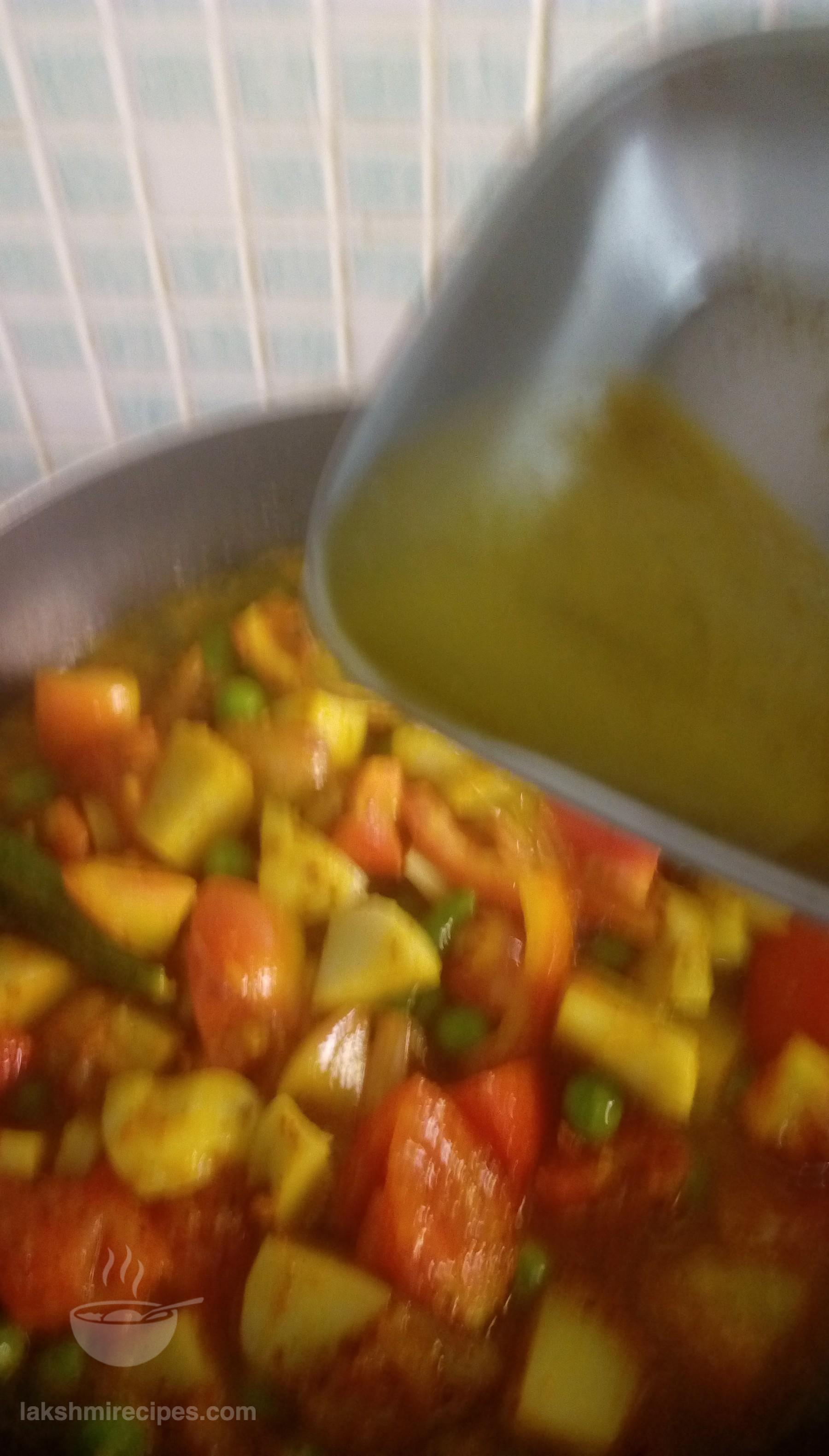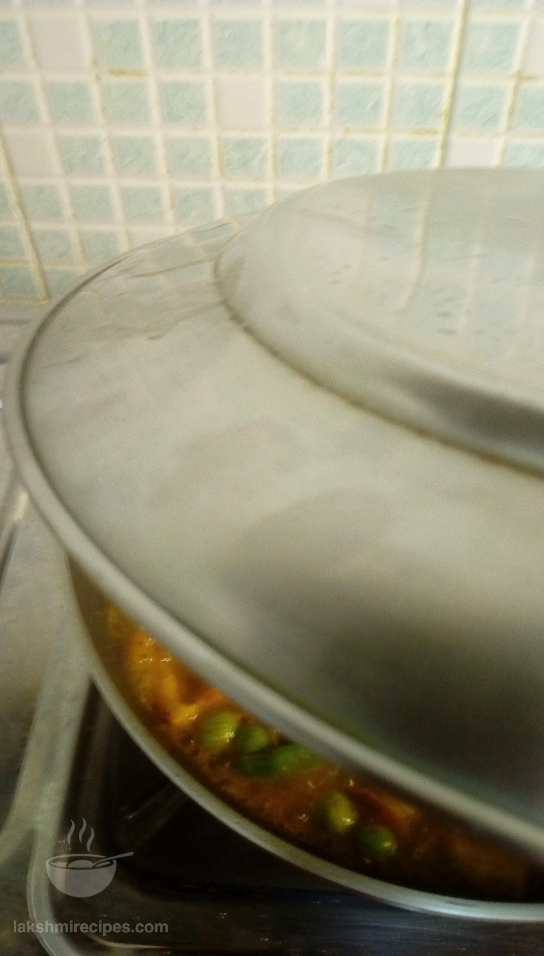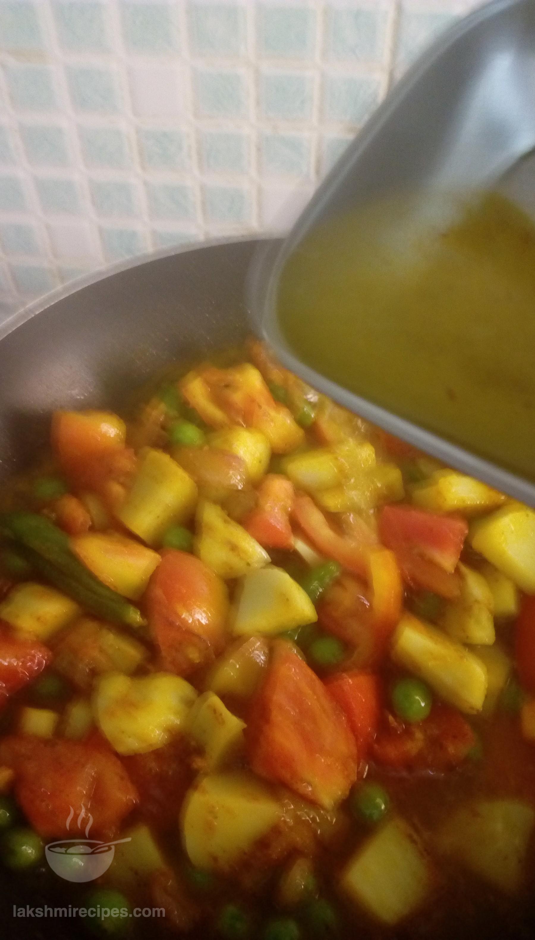 - Now add 1 cup water to the cooking vegetables and cover the kadhai with a lid.