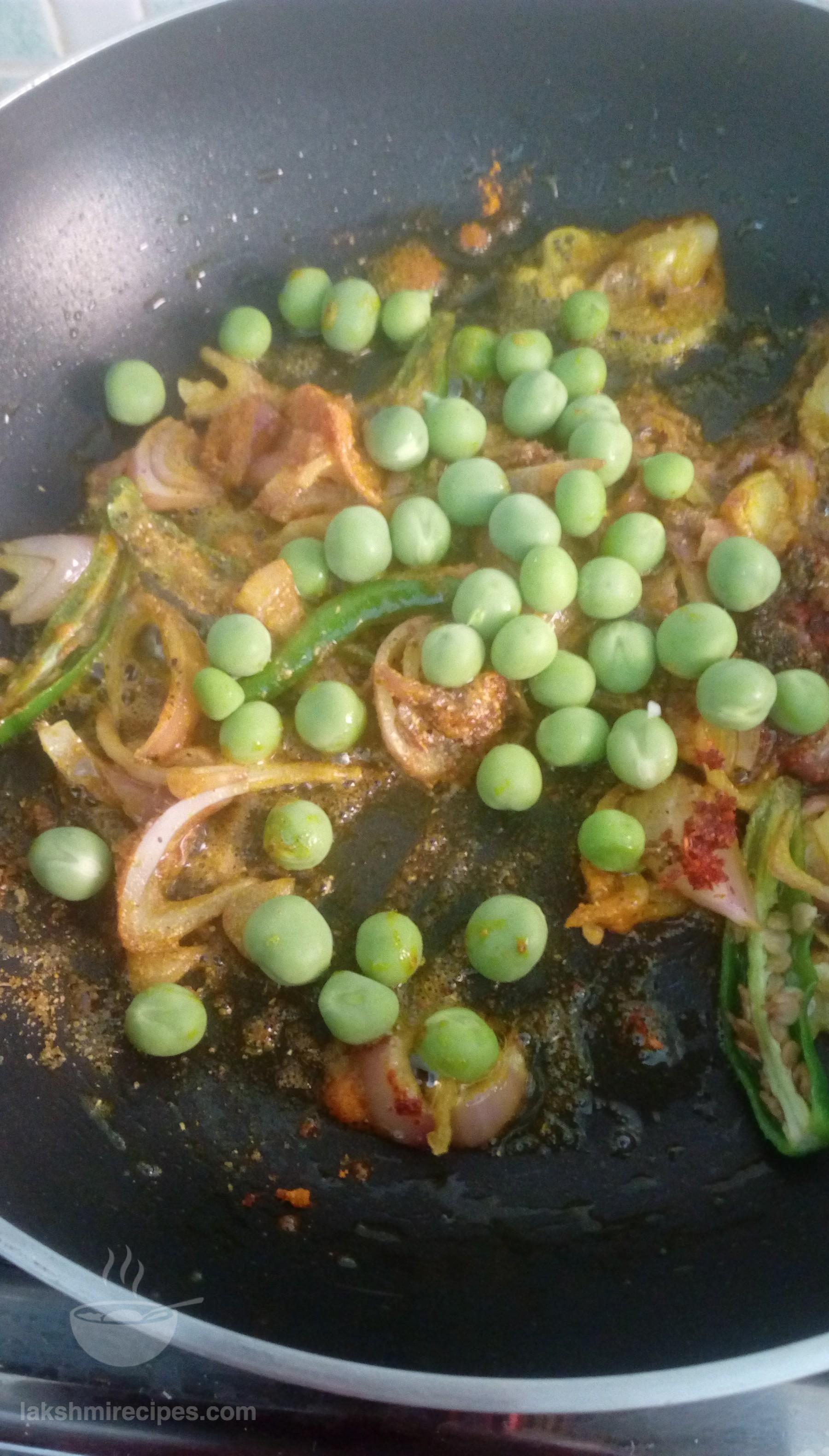 - After this add the green peas (hari matar) followed by the finely chopped capsicum (shimla mirch) and the tomato (tamatar). Saute the vegetables a little.