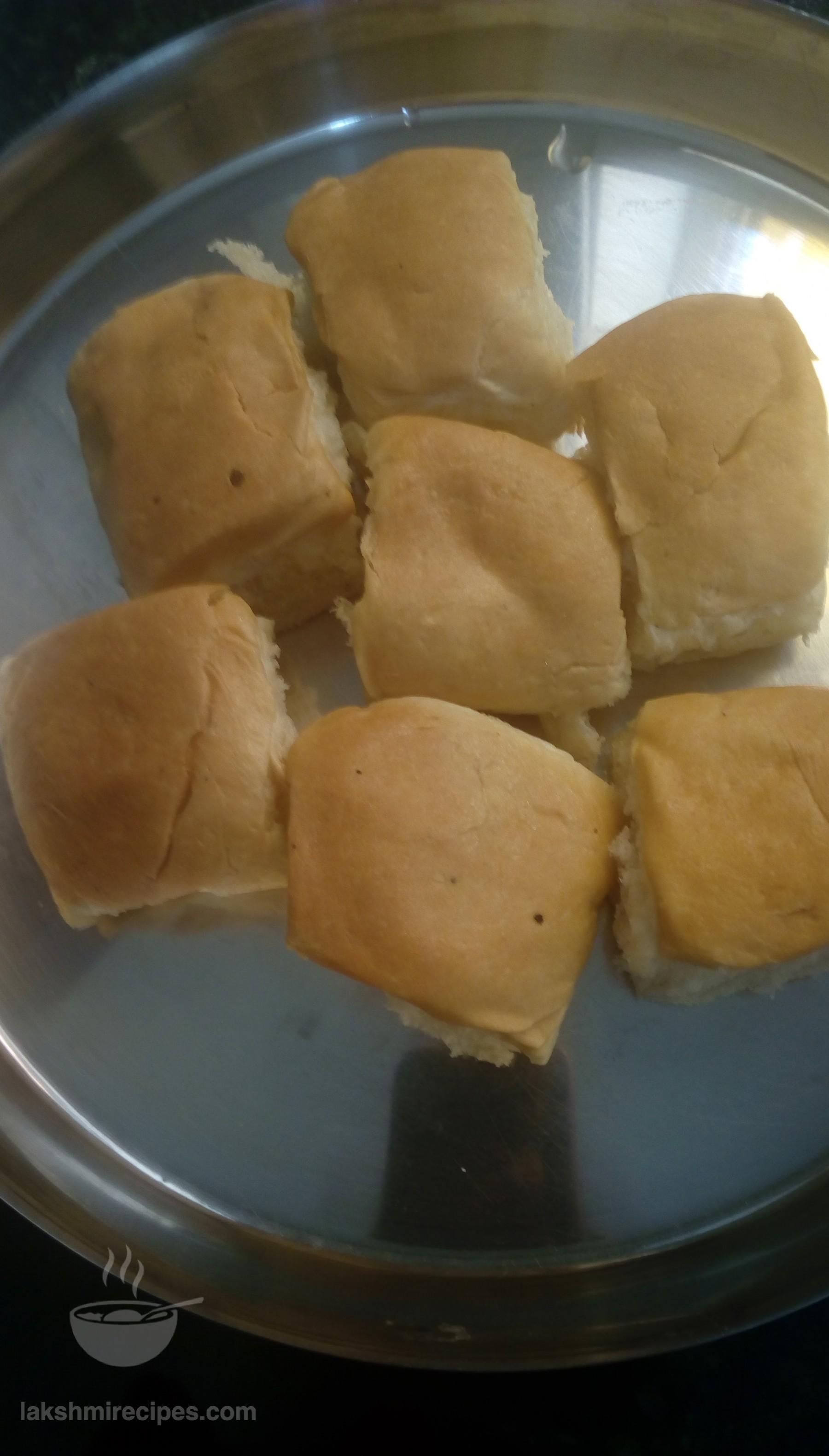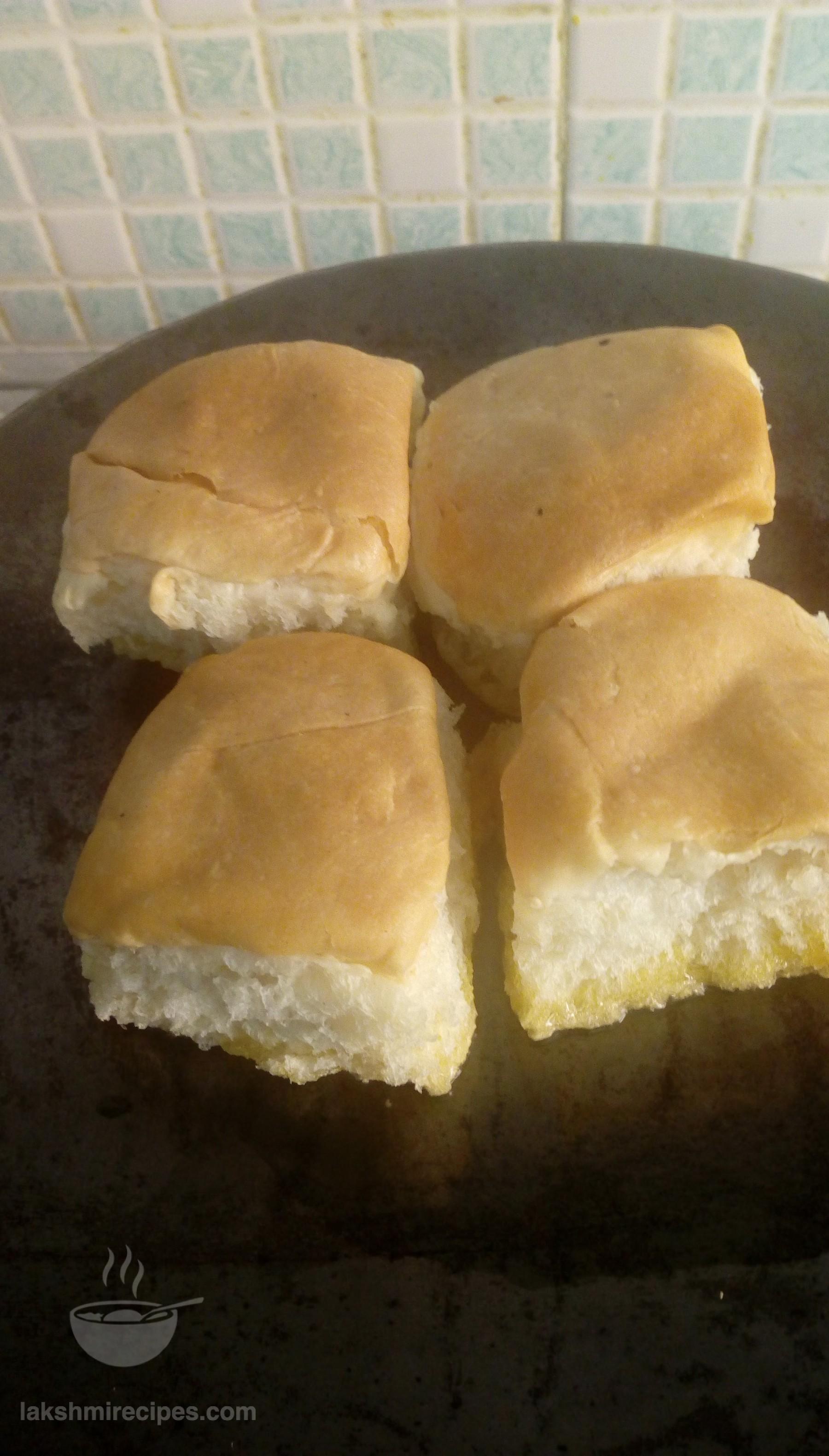- Cut the pav bread from the center dividing it into upper and lower halves. Now heat some butter or ghee on a tawa or grilling pan and toast the bread nicely.