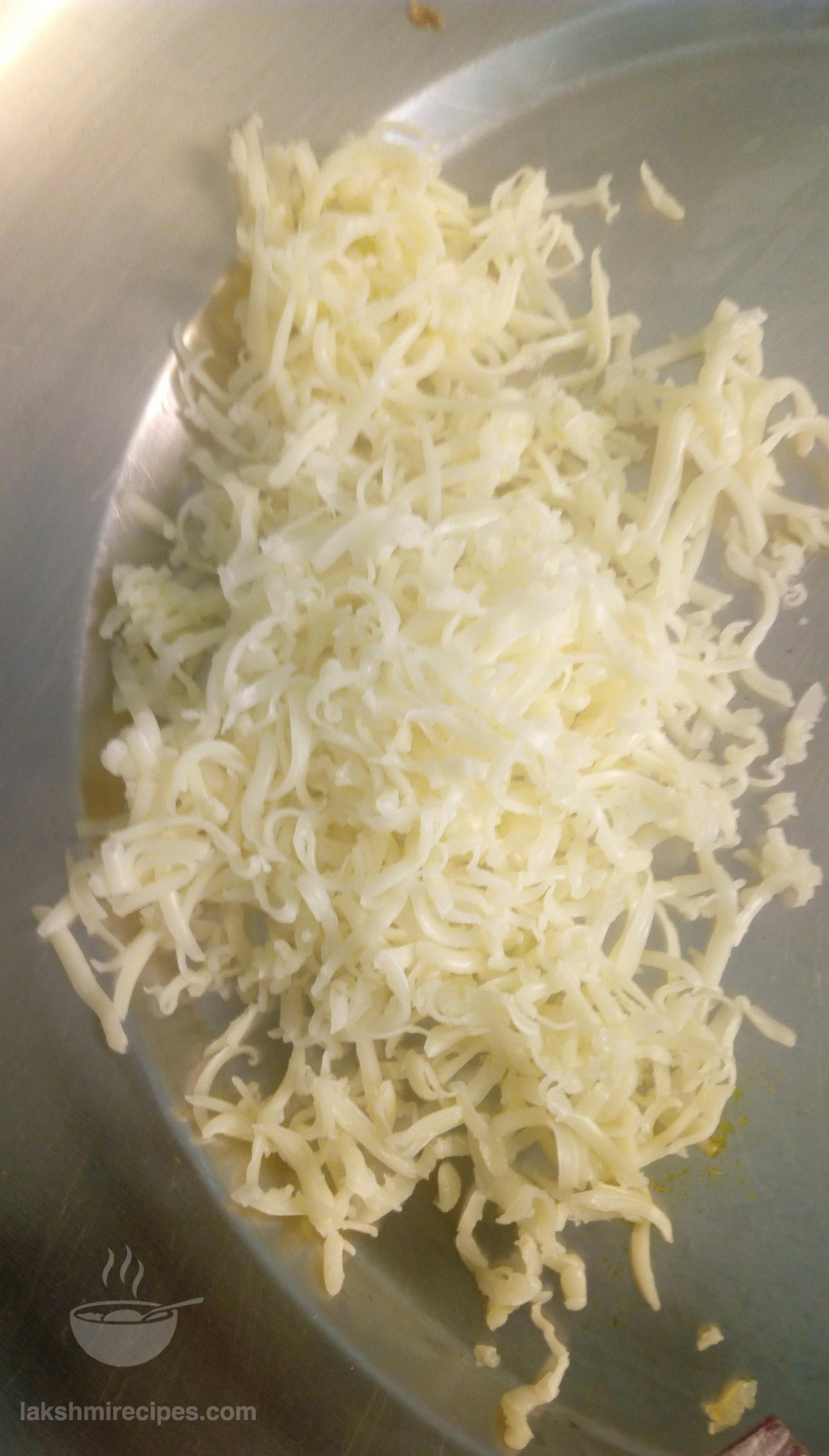 - When the vegetables, masala and the gravy together begin to appear as a uniform bhaji then add finely chopped green chilli (hari mirch) and grated cheese to it and turn off the flame.