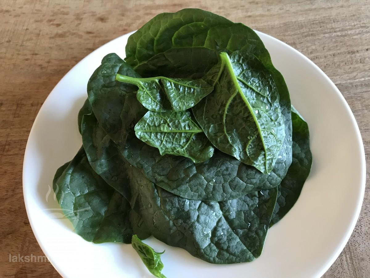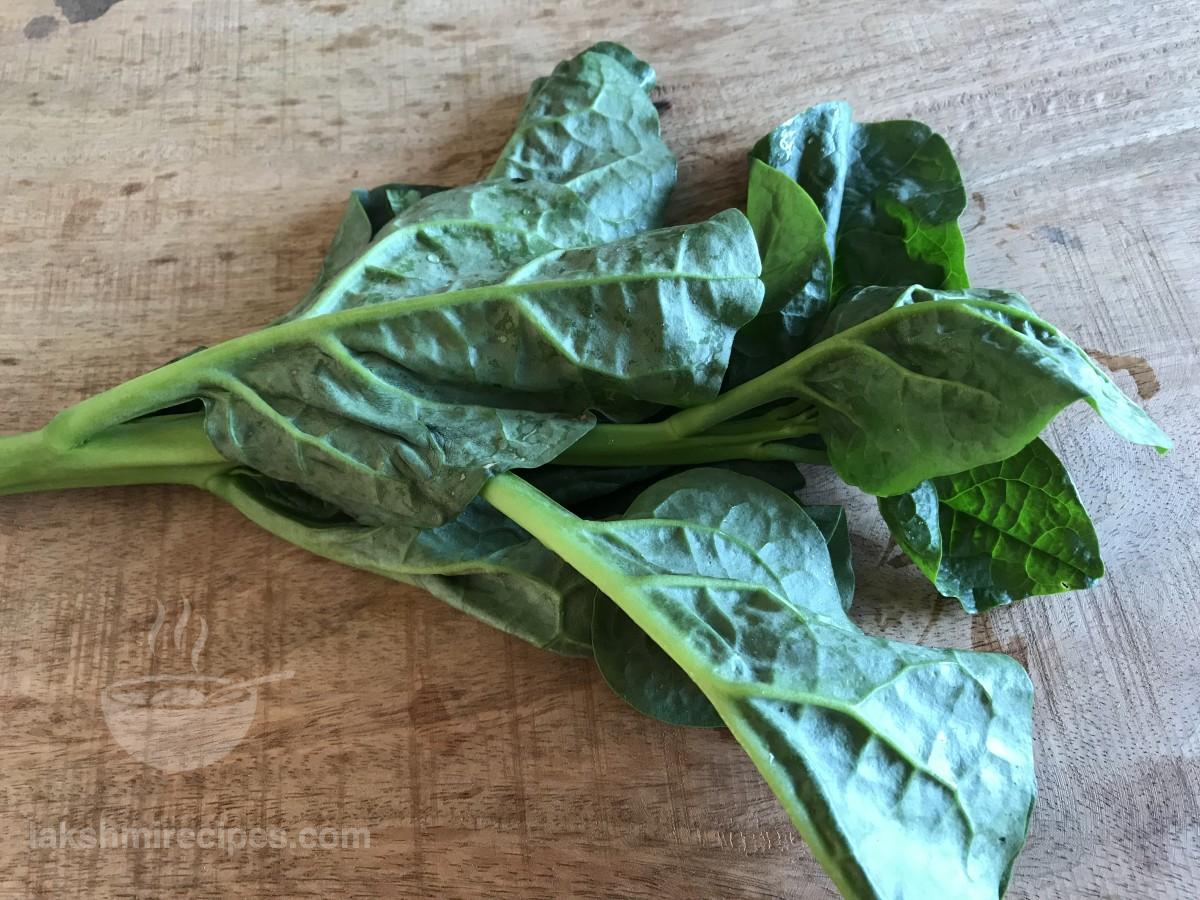- Chop off the stem from the Malabar Spinach Leaves and then transfer them to a vessel containing clean water. Leave them dipped in water for 2-3 minutes and then rinse them nicely with clean water.