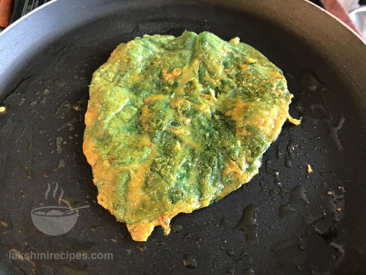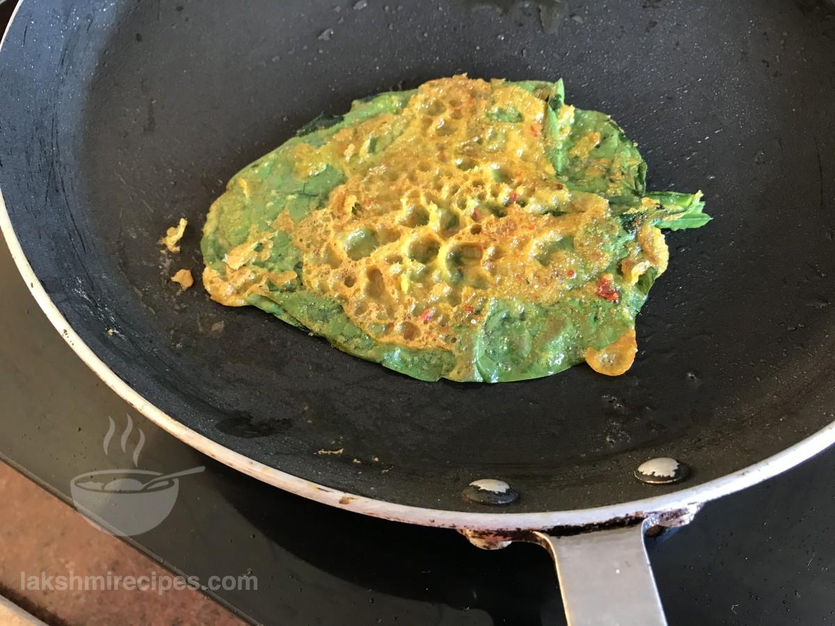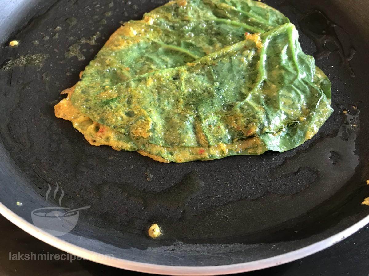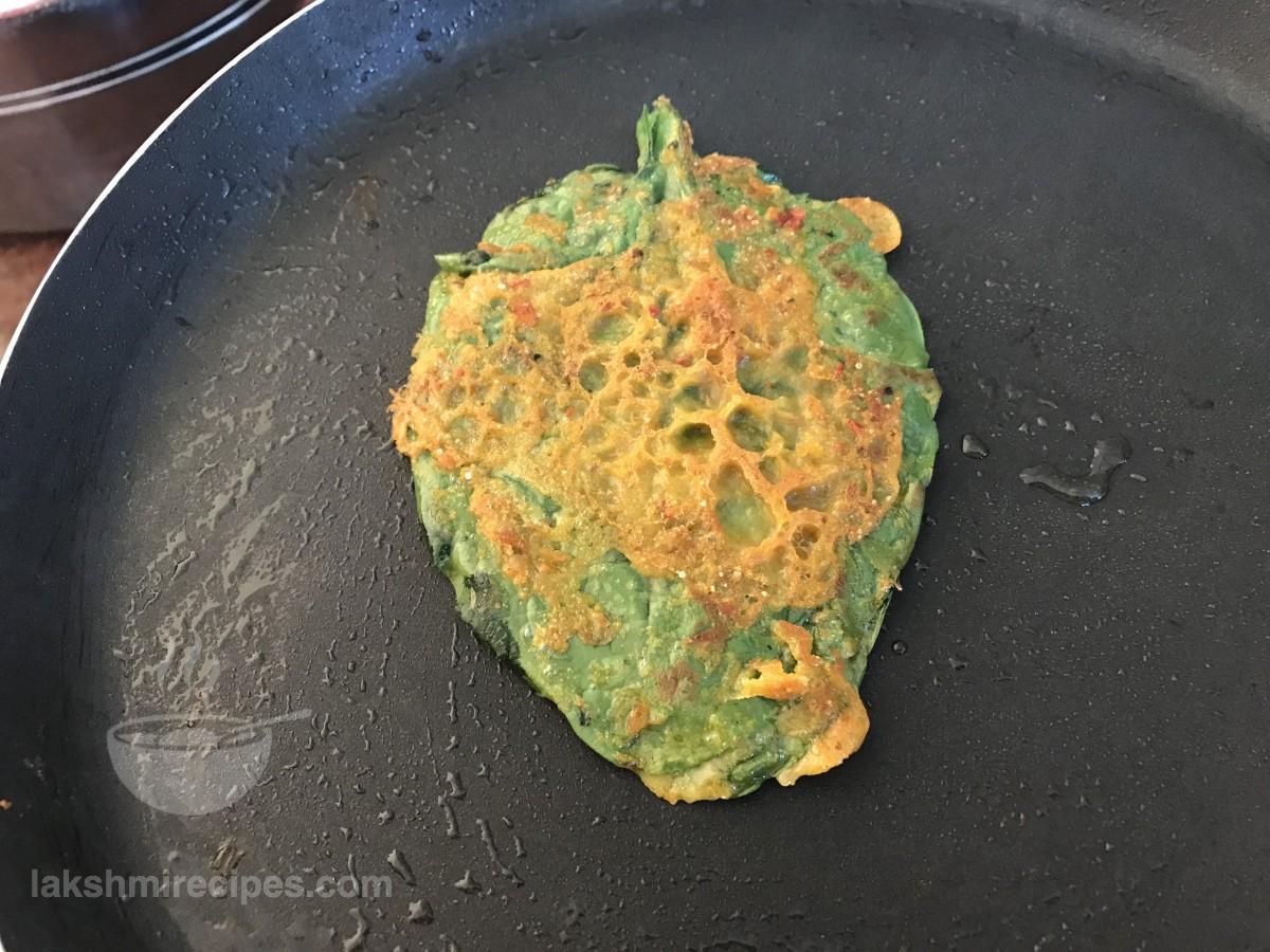 - Fry the Malabar Spinach Fritters on low flame only so that are nicely cooked and become crispy on both sides. (You can make more than 1 Malabar Spinach Fritters in one batch, depending upon the size of your non-stick pan.)