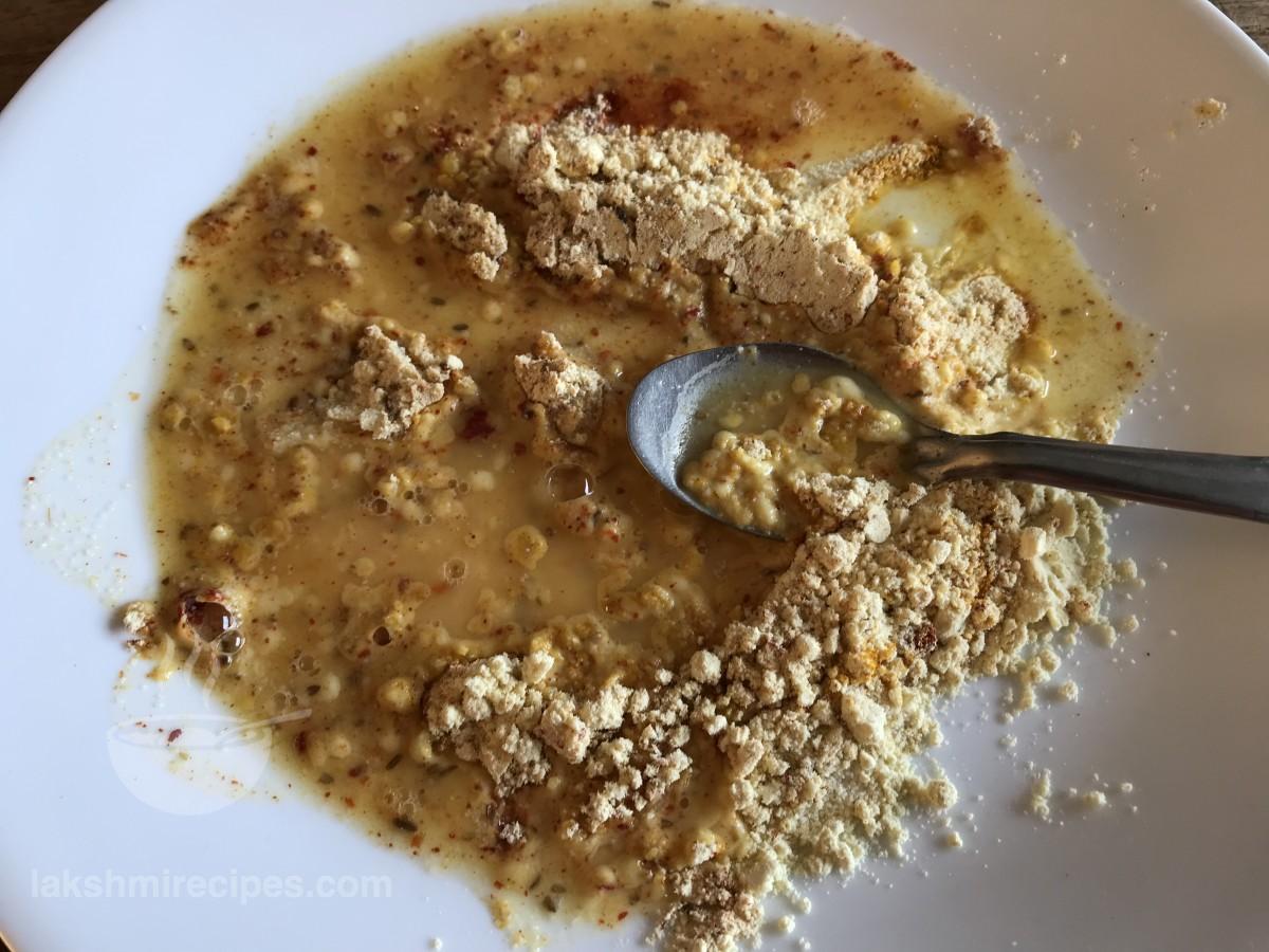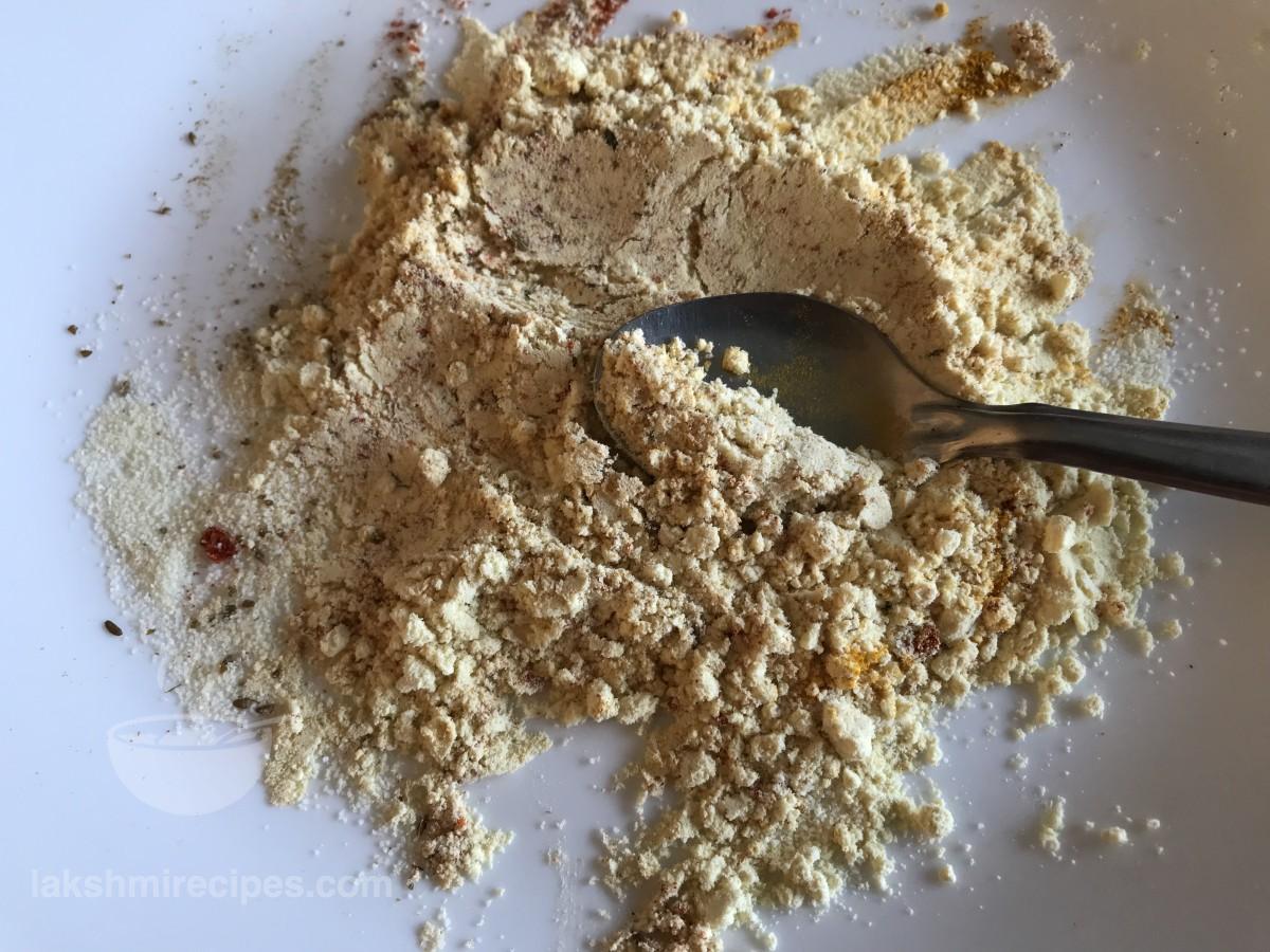 - एक बड़ी प्लेट में बेसन डालें और फिर इसमें हल्दी पाउडर लाल मिर्च पाउडर और काली मिर्च पाउडर जोड़ें। सूखी सामग्री को एक साथ मिलाएं।