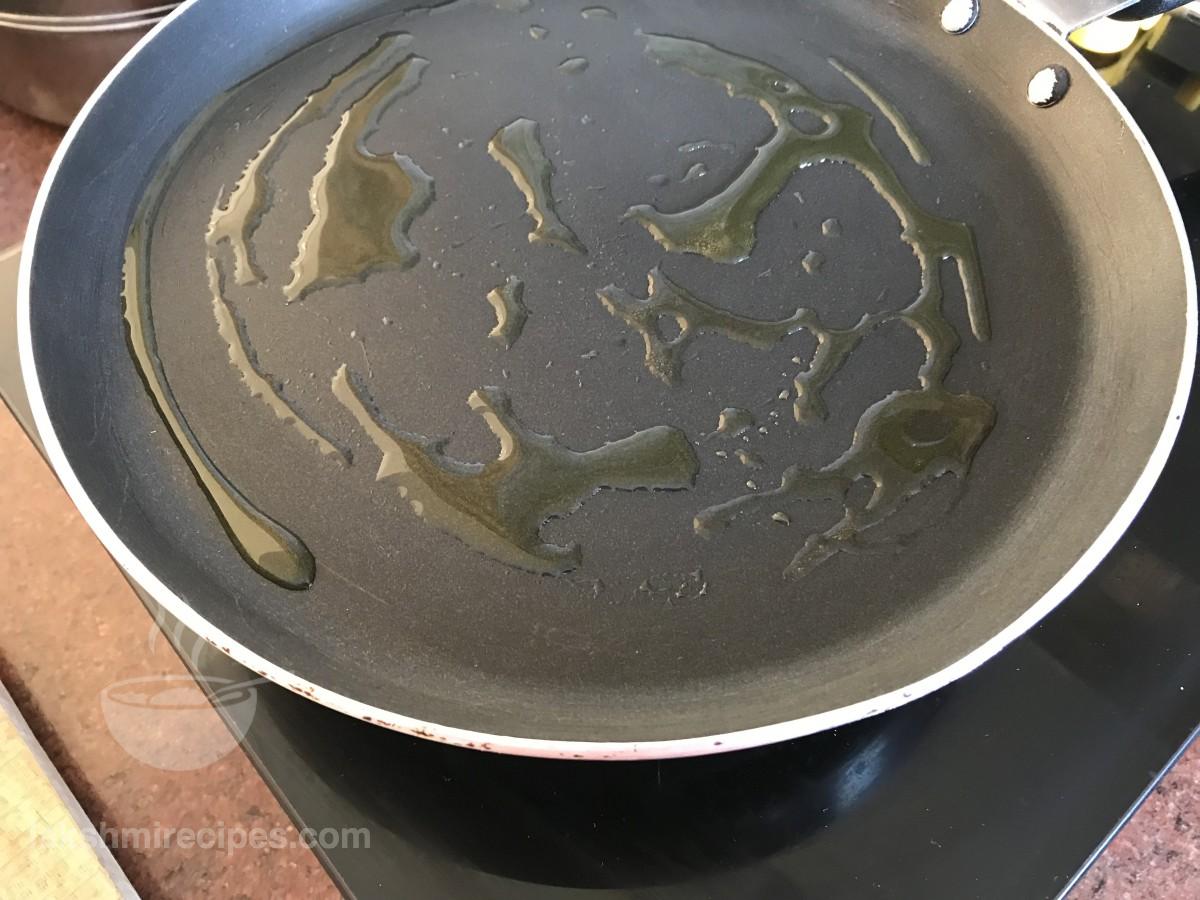 - एक नॉन-स्टिक पैन गरम करें और इसमें 1 छोटी चम्मच सरसों का तेल डालकर फैला दें। फिर आंच को कम कर दें।