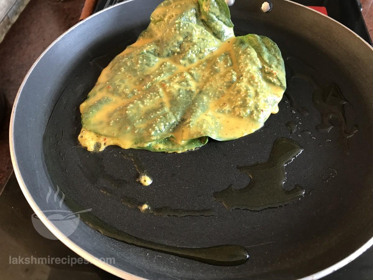 - Then take one Malabar Spinach Leaf and dip it in the batter prepared above. Coat it nicely with batter on both sides. Take another Malabar Spinach Leaf and coat it with the batter in the same way.