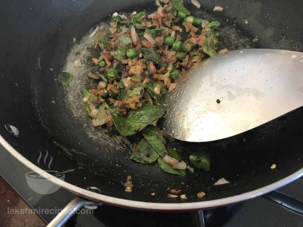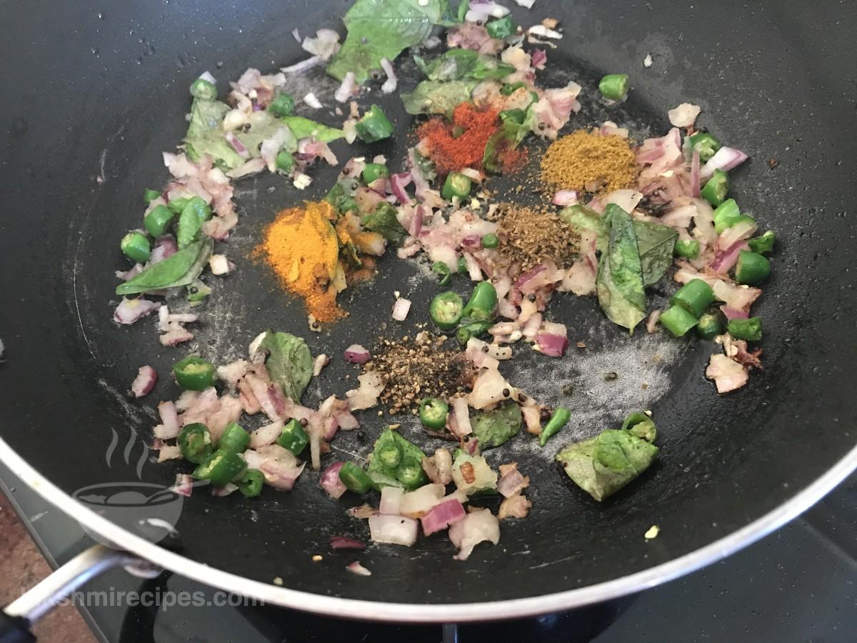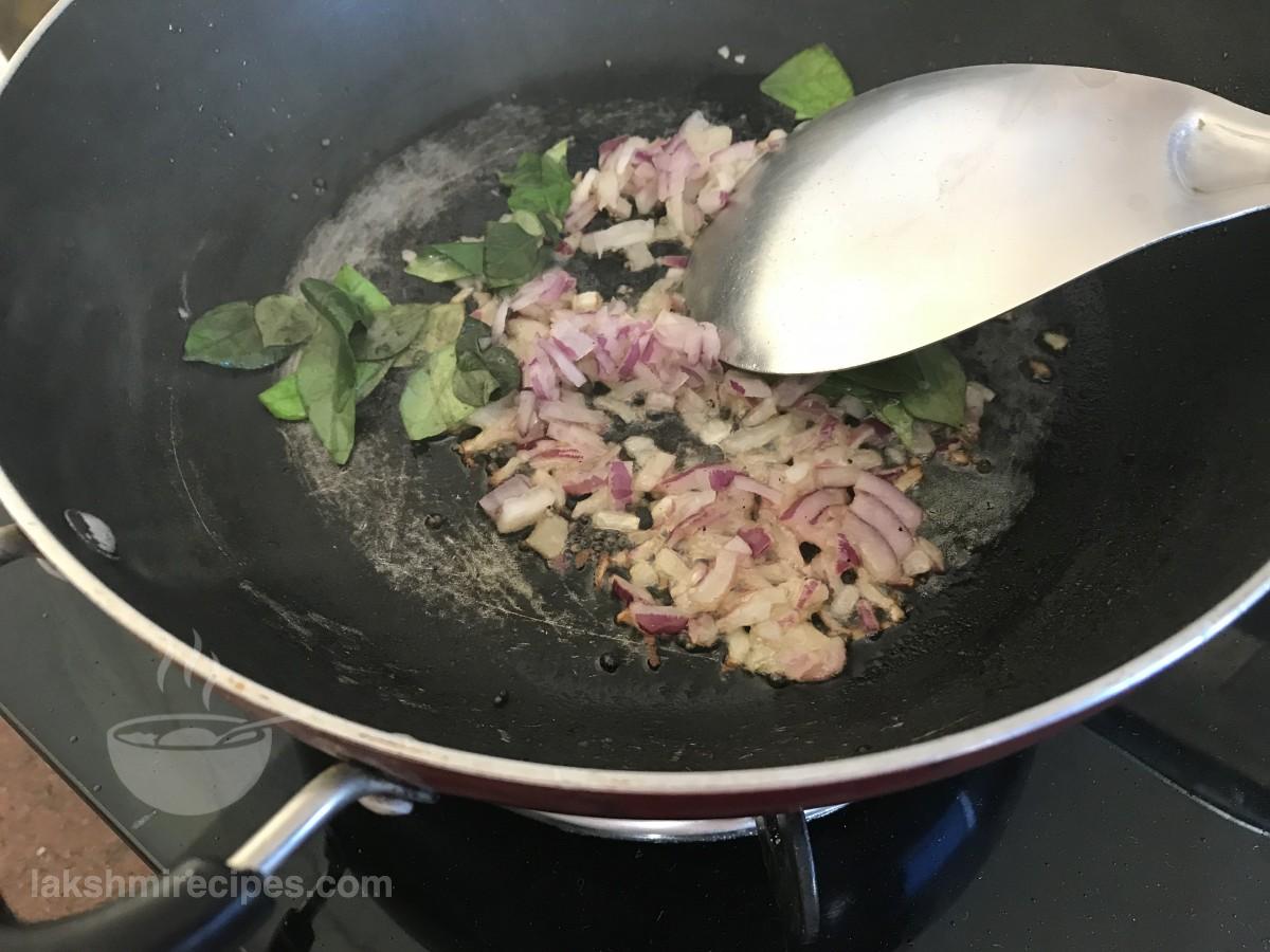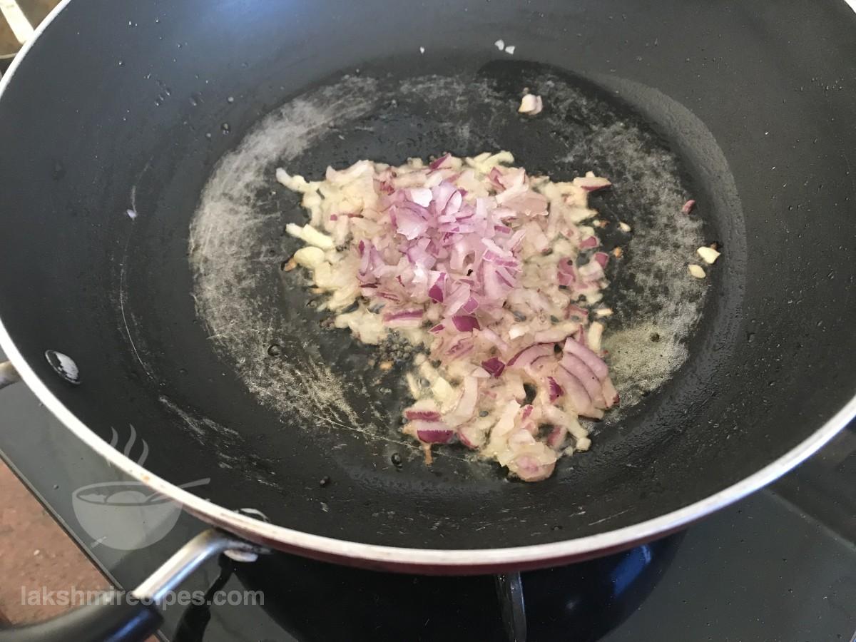 - Then add chopped onion. Stir and saute the onion till it turns golden brown in color.