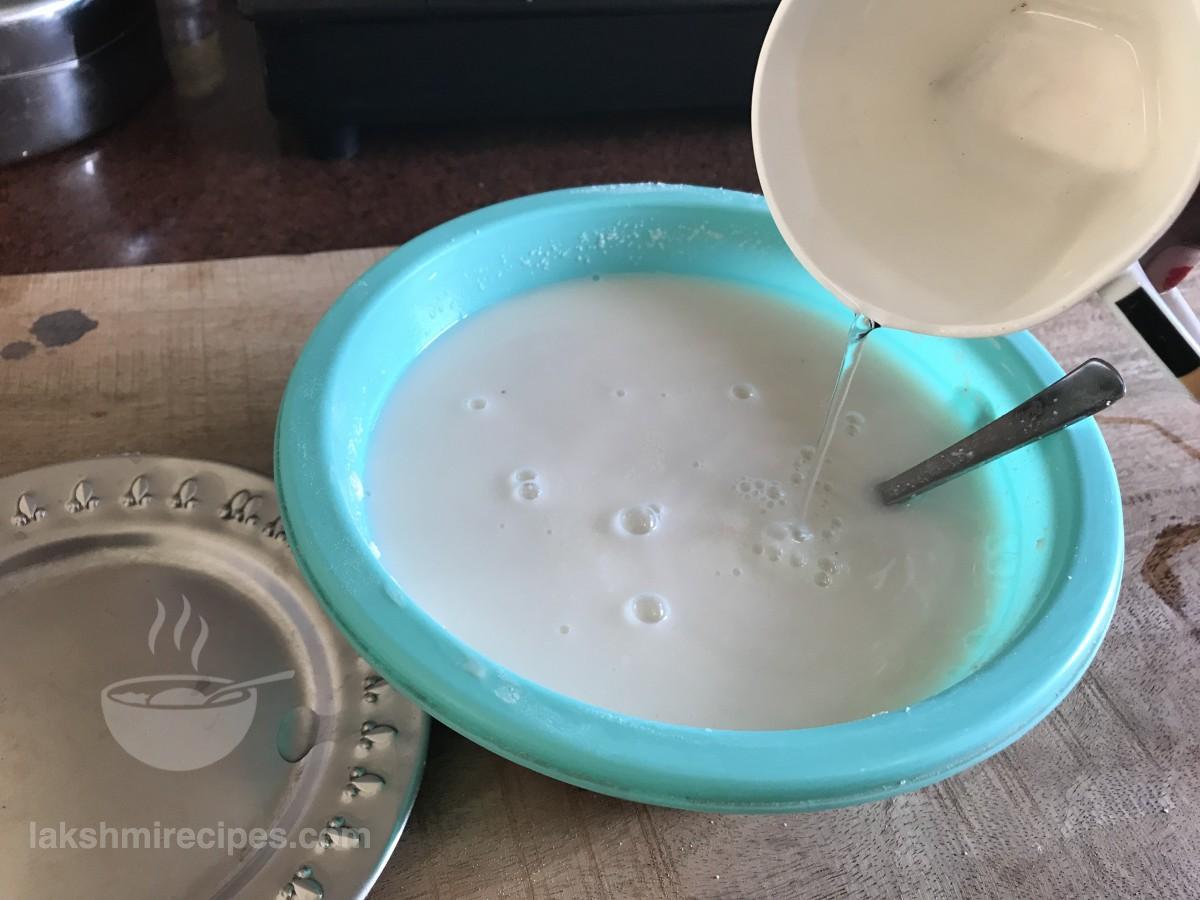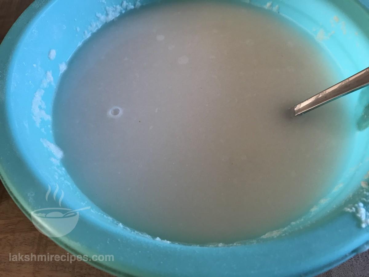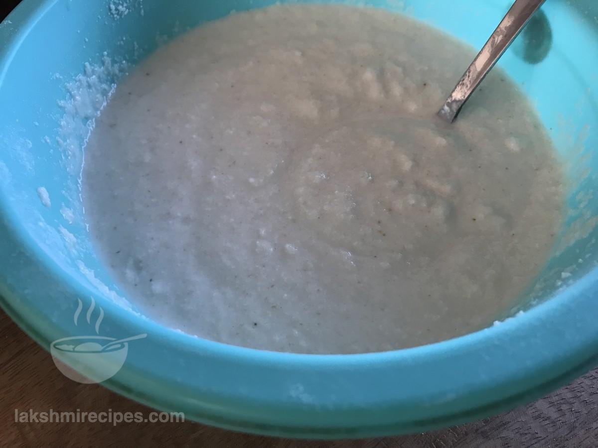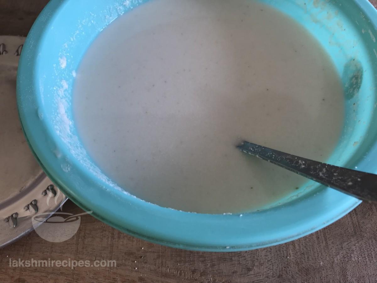 - Then add more water to this thick batter to prepare a batter of flowy consistency, but not watery. The batter should be easily pourable.
