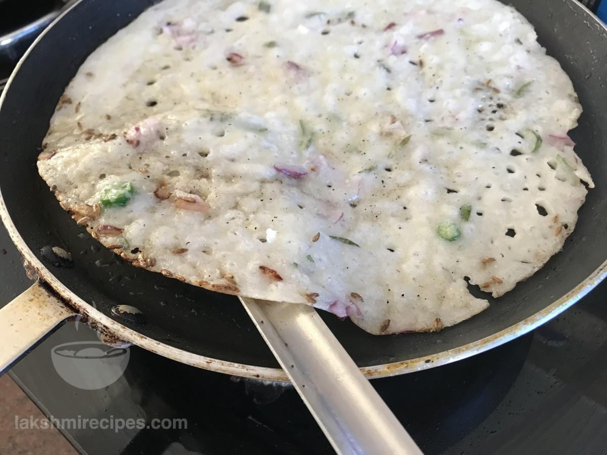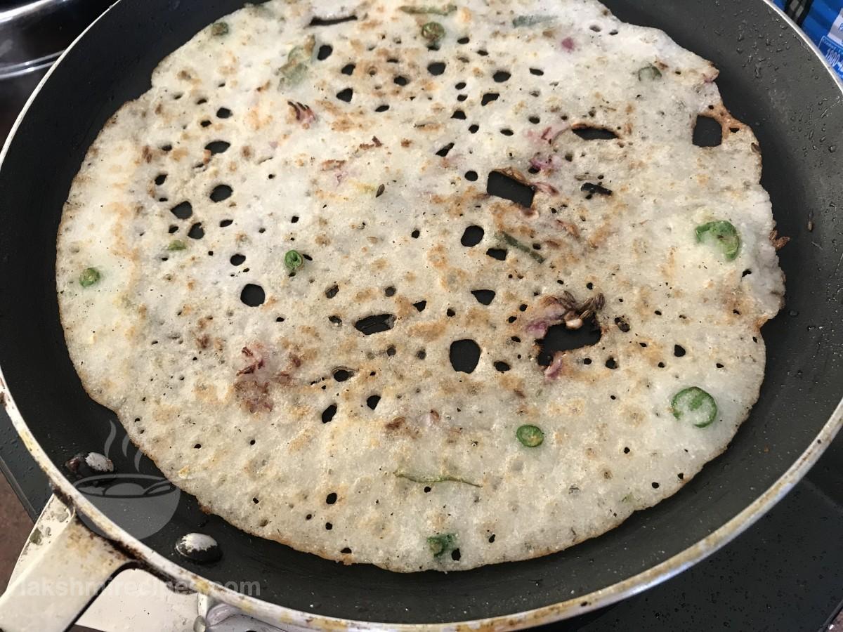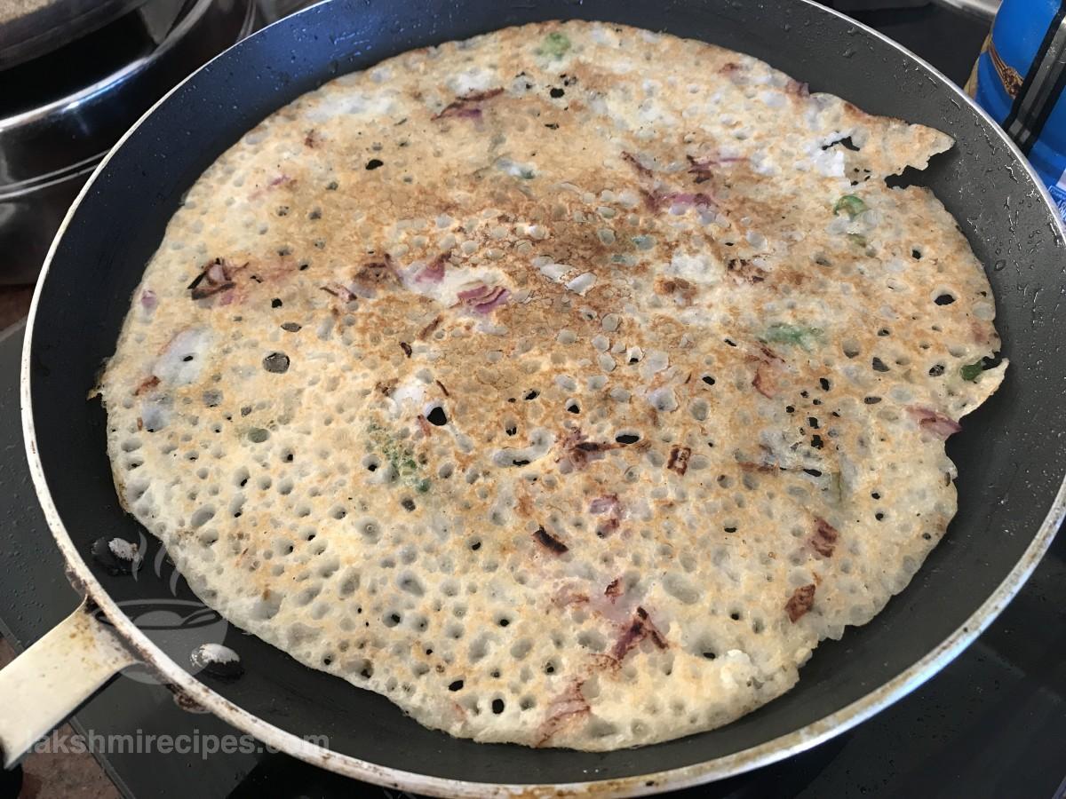 - Then slowly flip the cooking Rawa Dosa with a flat ladle to cook on the top side.