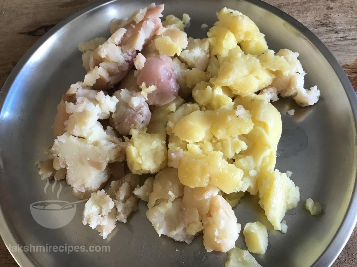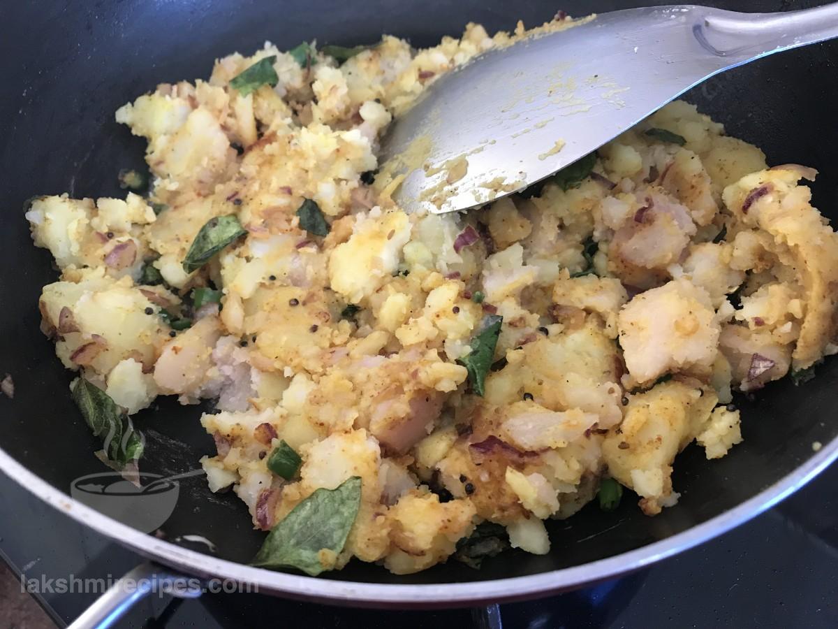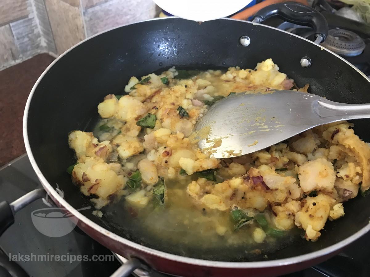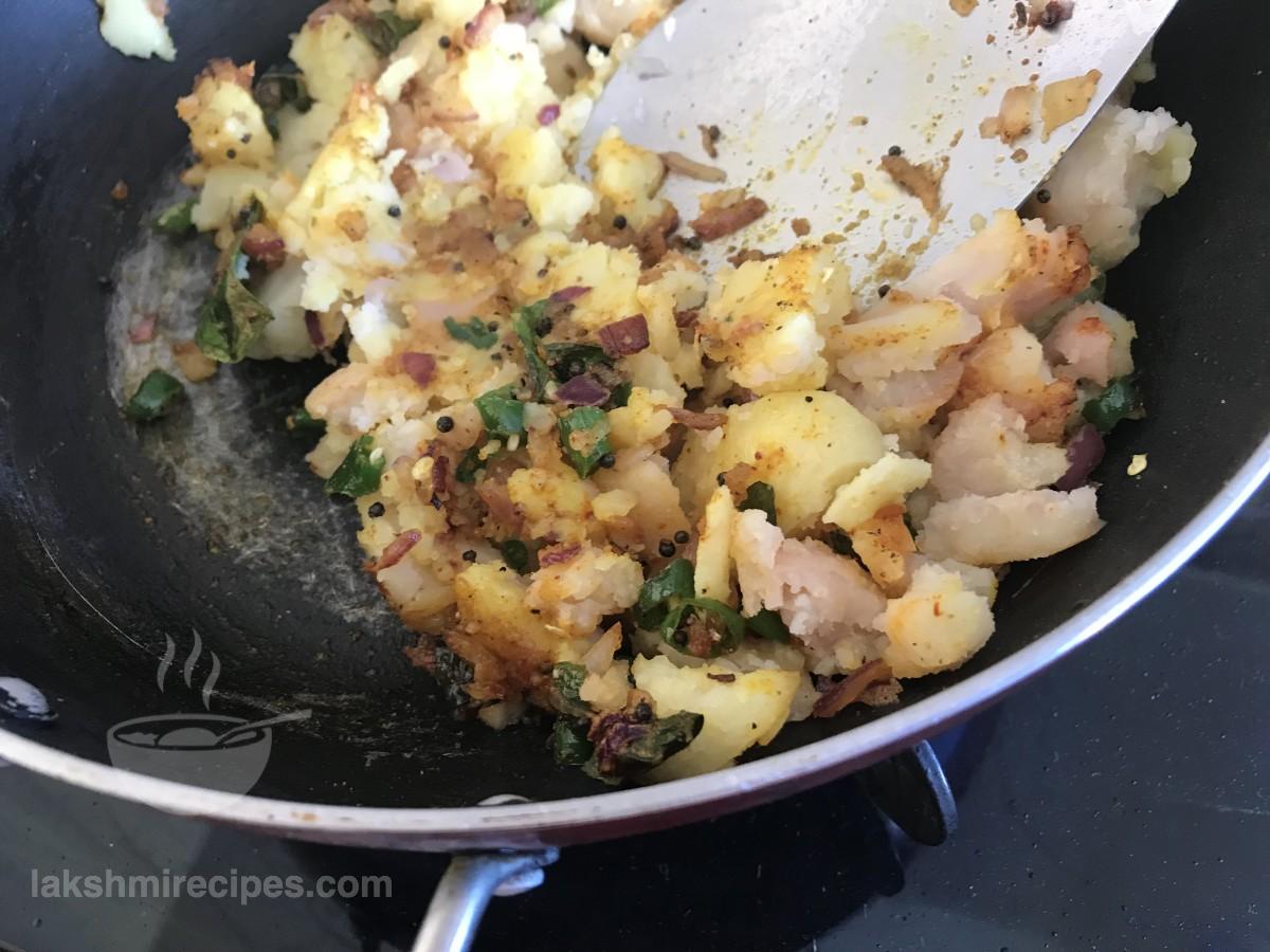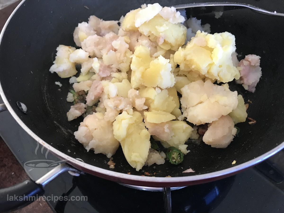 - कुछ सेकंड के बाद मैश किए हुए उबले आलू को कढ़ाई में डालें और चलाते हुए पकाएं।