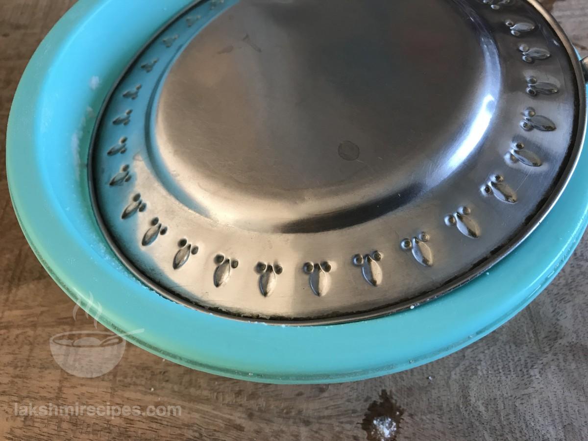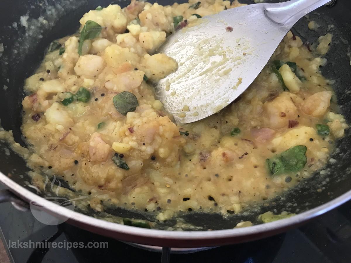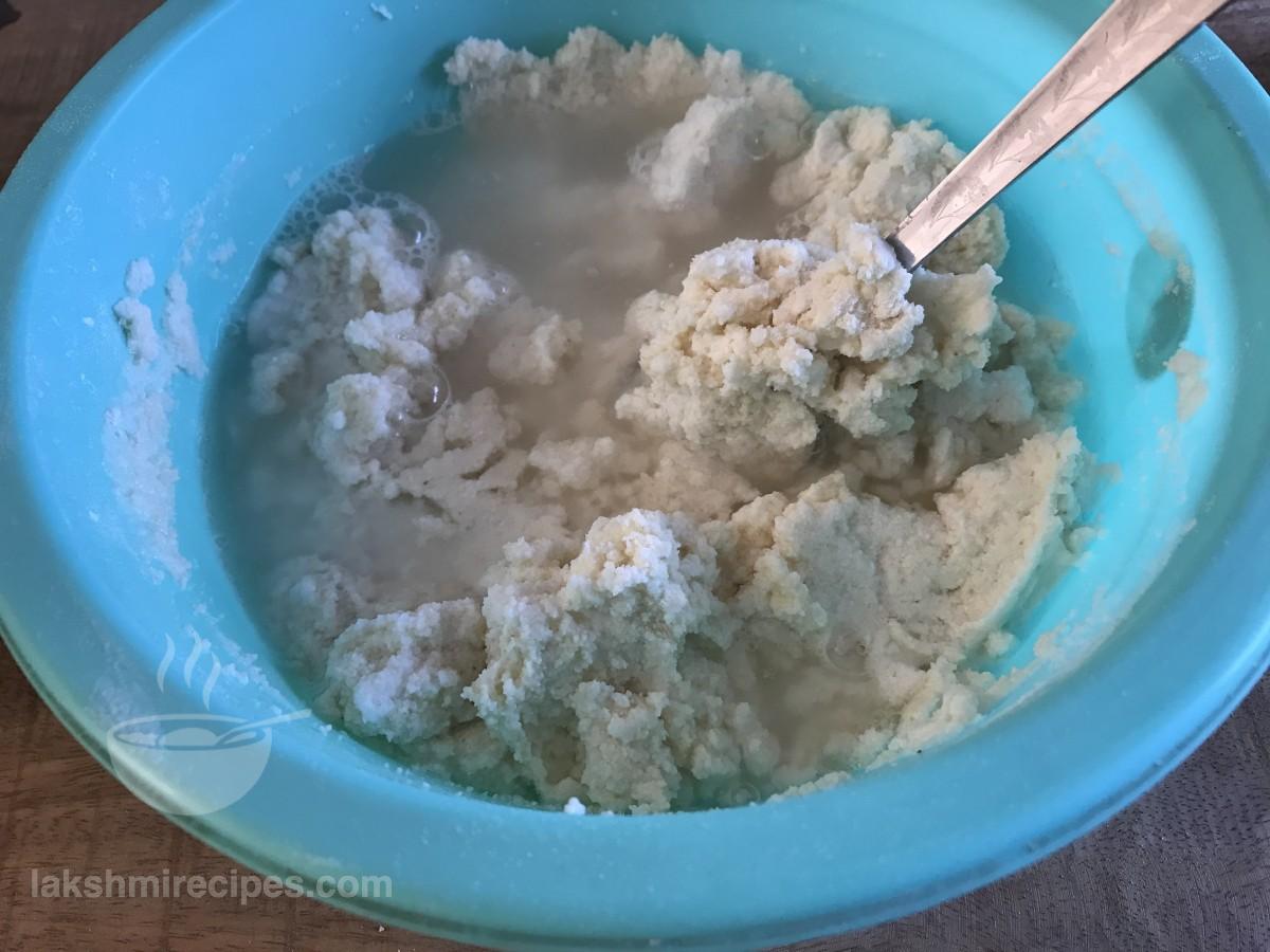 - Remove the lid after 30 minutes. You shall see that semoline and rice flour has swelled, therefore add some more water to make it flowy.