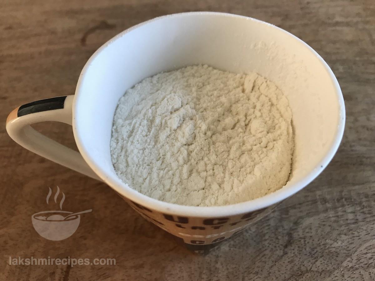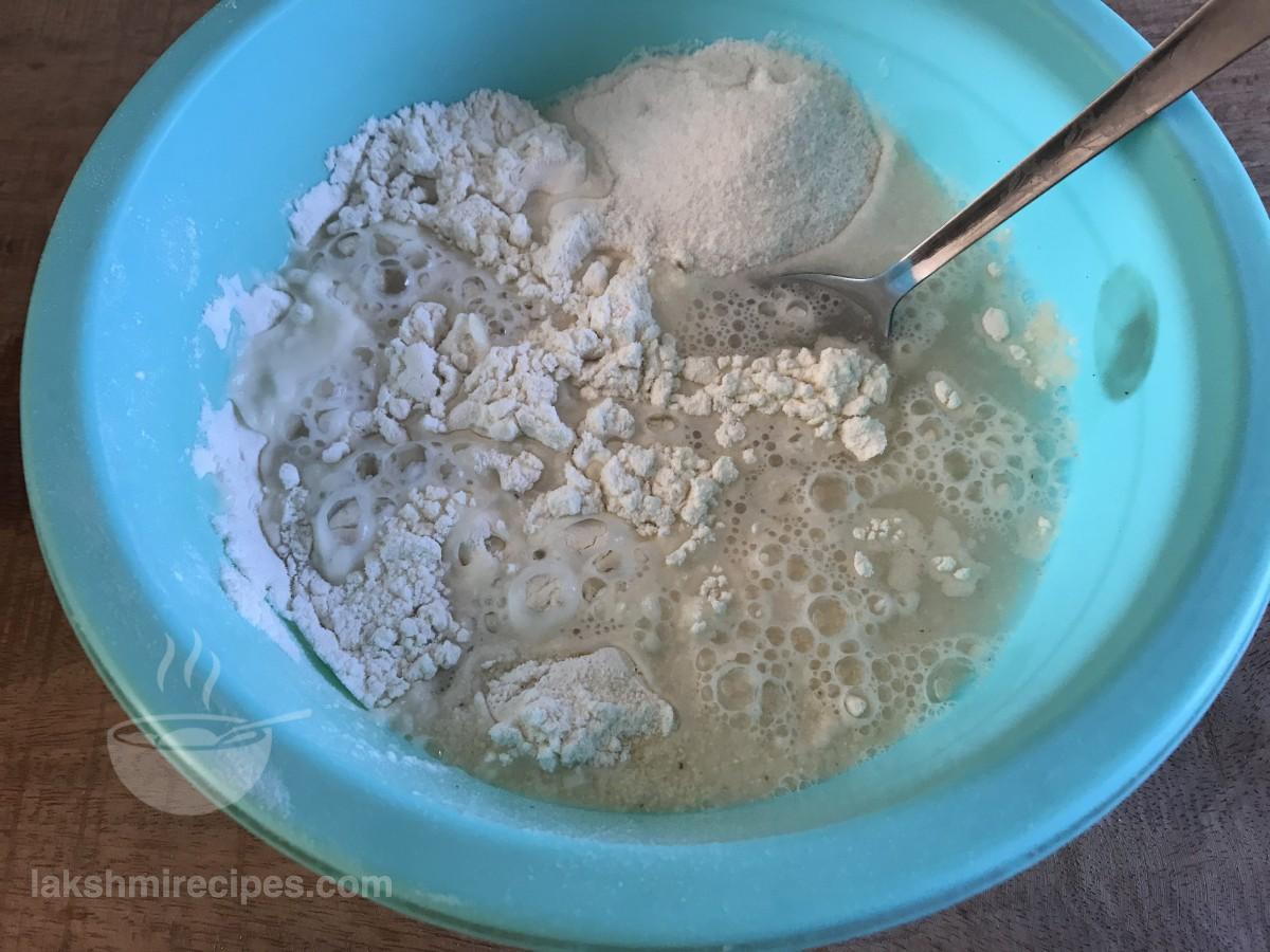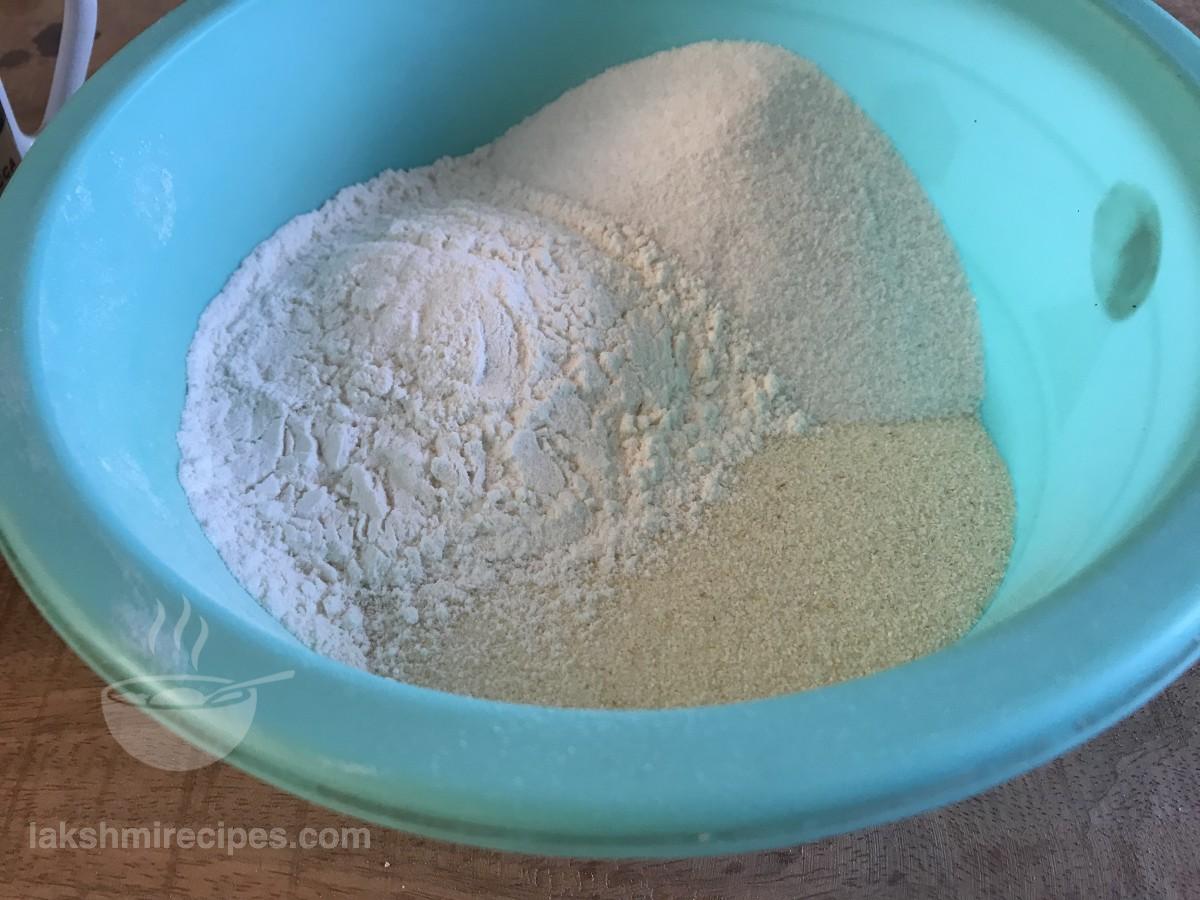 - Take semolina, rice flour and all purpose flour in a deep bowl or mixing vessel. Mix the dry ingredients together.