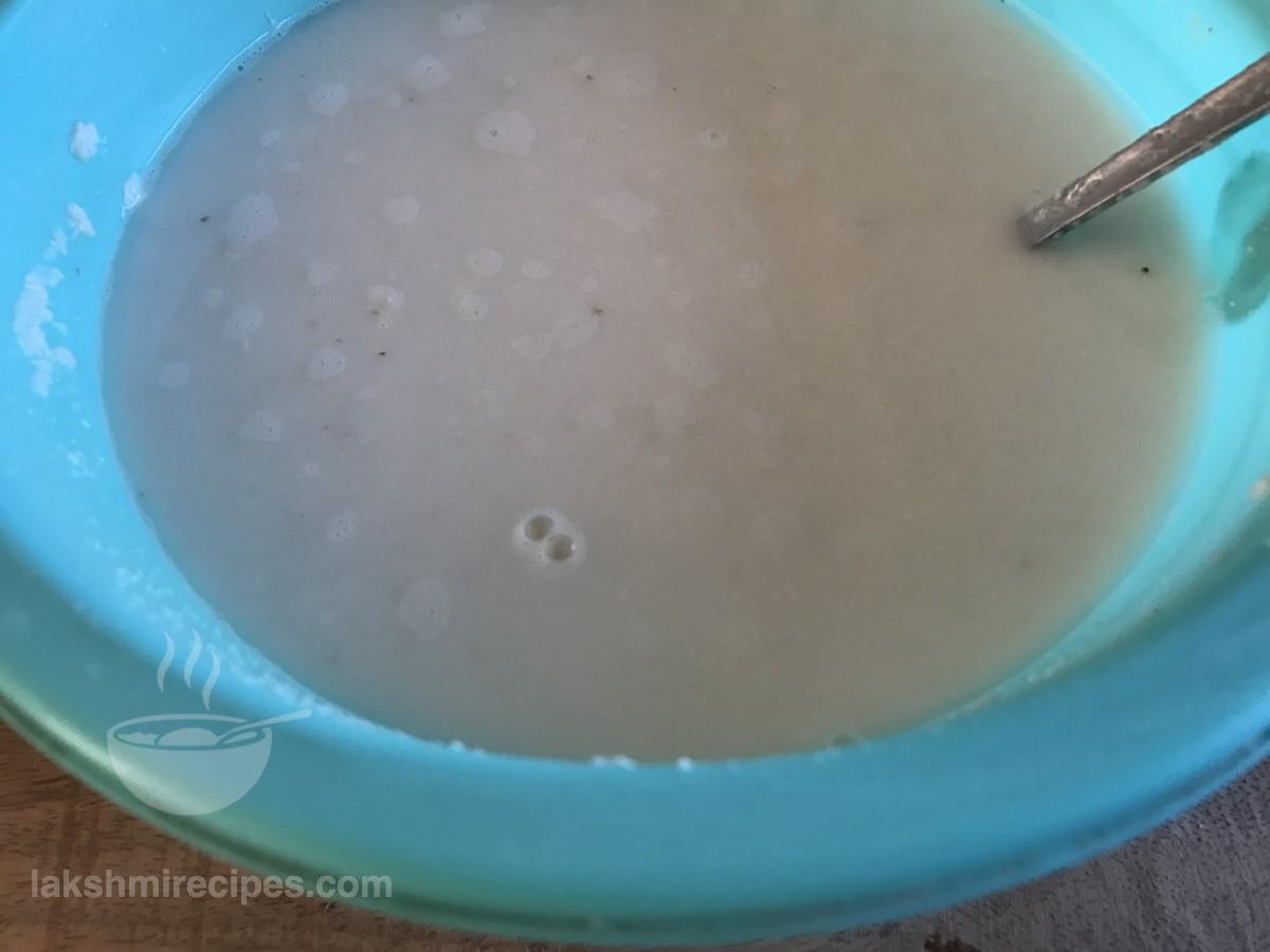 - 30 मिनट के बाद ढक्कन को हटा दें। 30 मिनट के बाद आप देखेंगे कि सूजी और चावल फूल जाएगा, इसलिए इस घोल लो पतला करने के लिए थोड़ा और पानी जोड़ें।