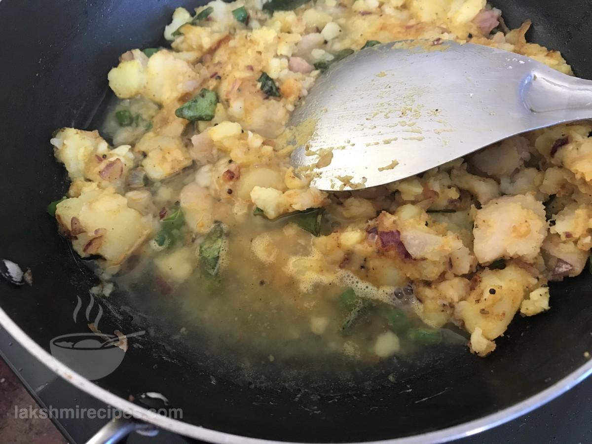 - Then add 1/2 small cup water to the kadhai and mix again. Increase the flame and cook till the water gets soaked up. This step will allow the mashed boiled potato to absorb the spices and get well cooked.
