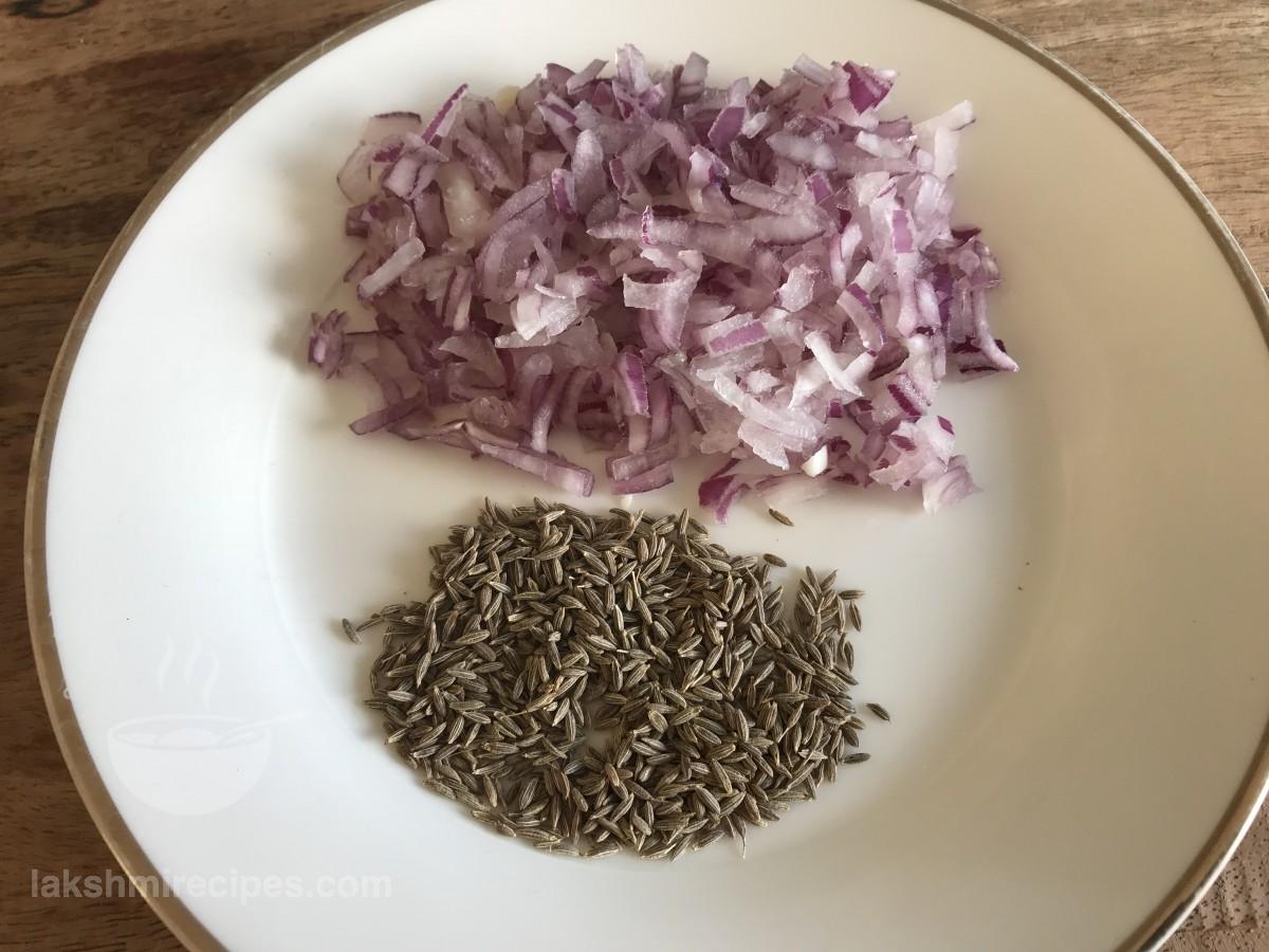 - तावा पर थोड़ा कटा हुआ प्याज और जीरा छिड़के। जीरा को चटकने दें।