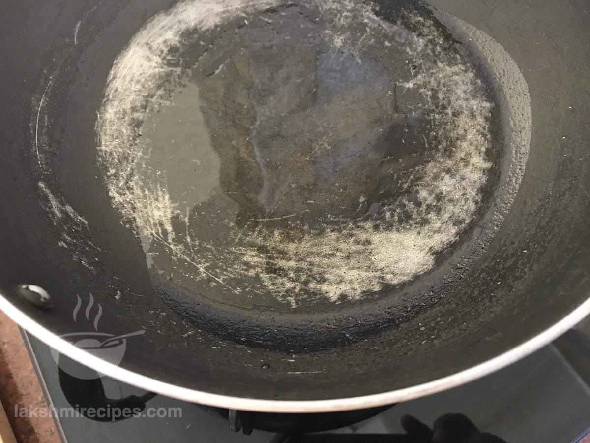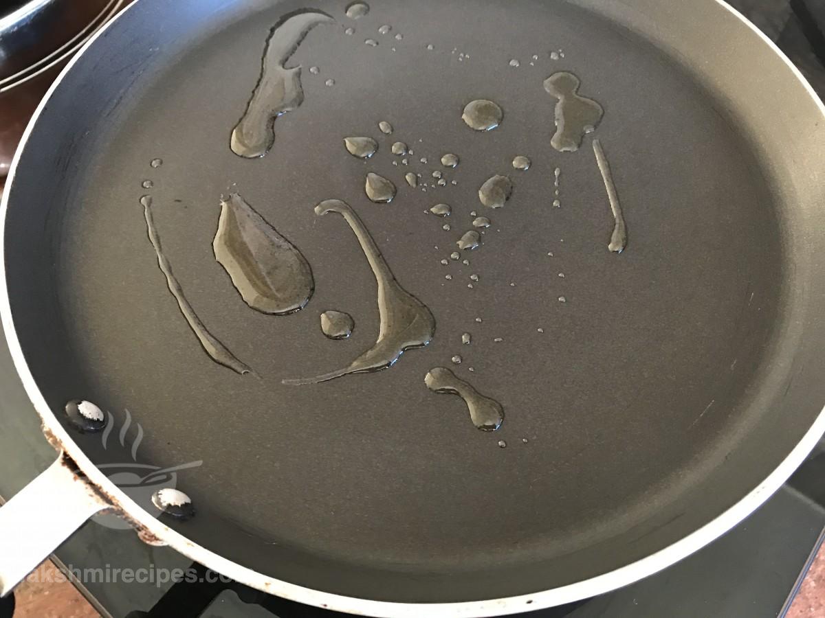 - Now heat a non-stick flat pan or dosa pan and pour some refined oil over it. Grease the pan with oil