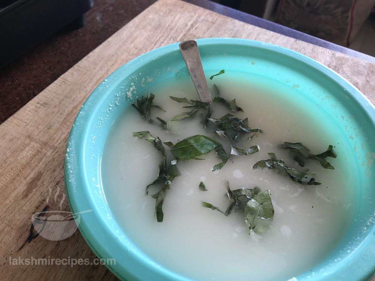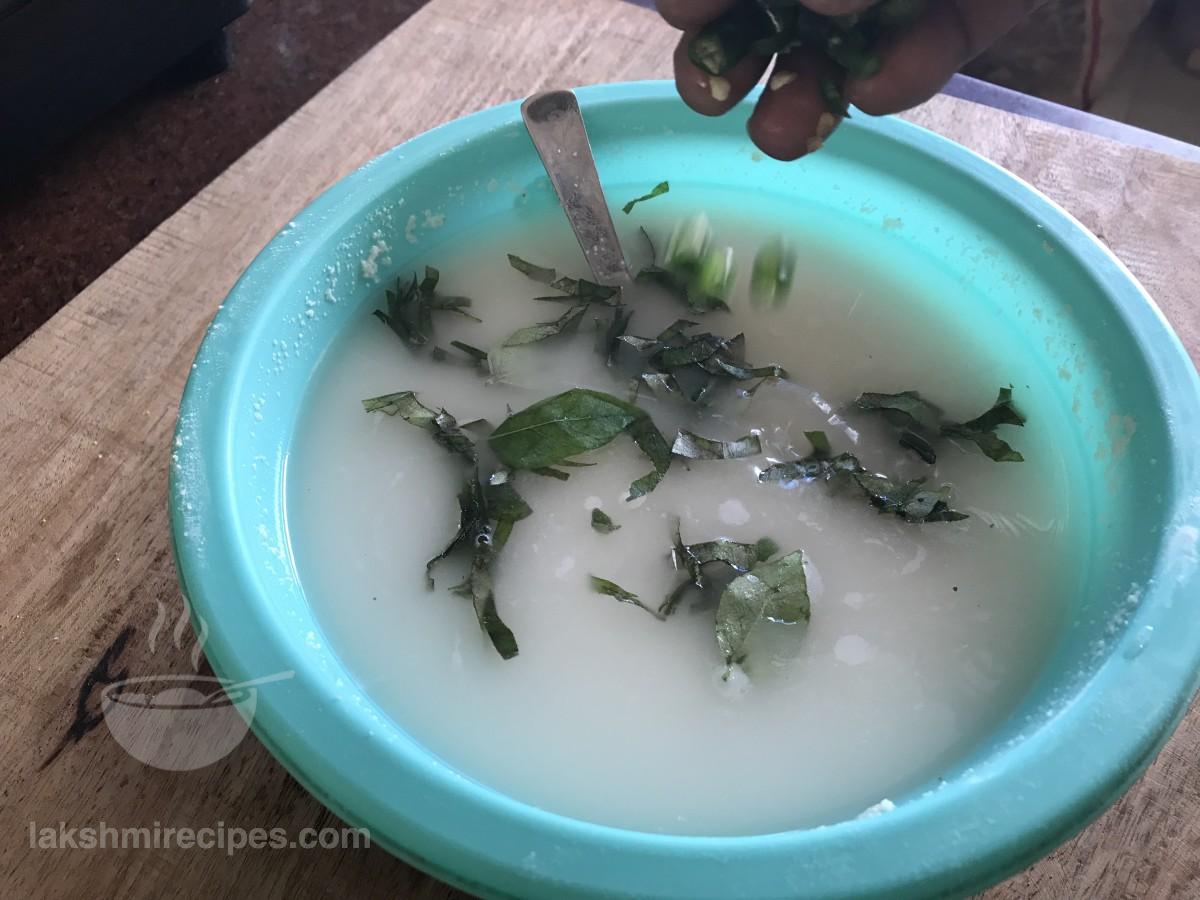 - Add salt, curry leaves and green chilli to it. Stir and mix again. Remember that the batter should be flowy enough so that it spreads on a tawa or non-stick pan itself.
